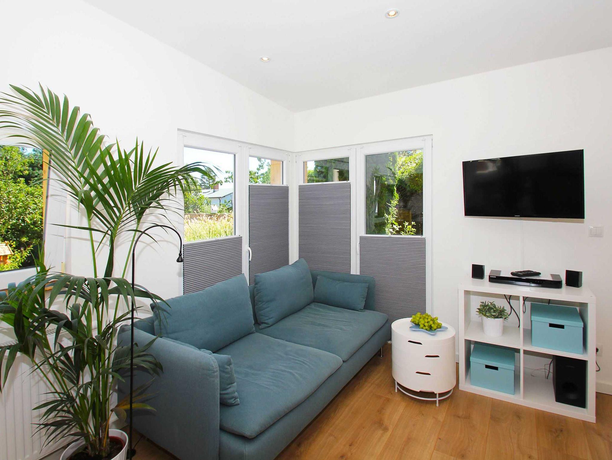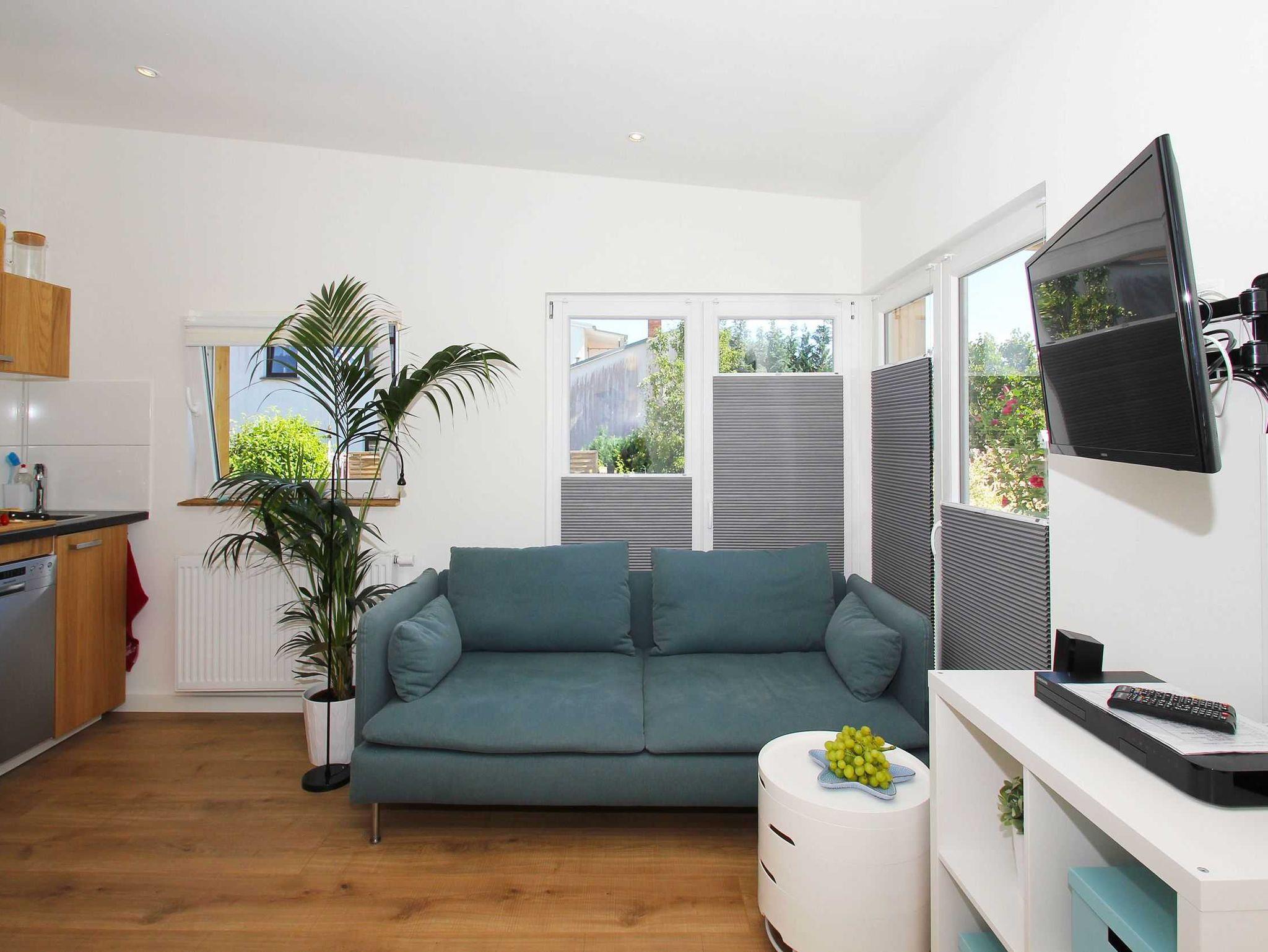 Der modern eingerichtete 2-Raum Ferienbungalow mit Terrasse ist für 2 Gäste bestens geeignet. Im Wohnbereich befindet sich eine gemütliche Couch und ein Flachbild TV. Die offene Küche ist mit einem 4-Felder Ceranherd mit Backofen, Geschirrspüler, Kühlschrank und sämtlichen Küchenutensilien bestens ausgestattet.