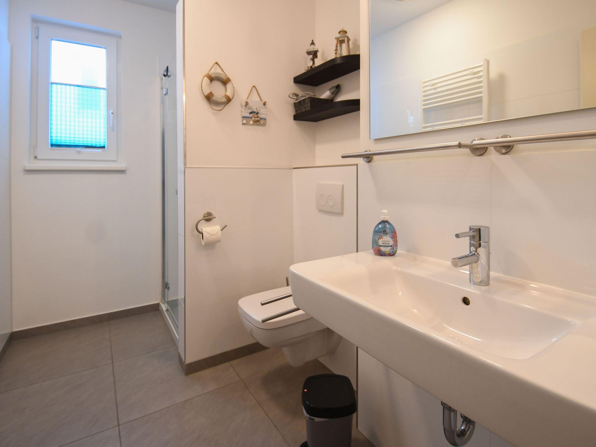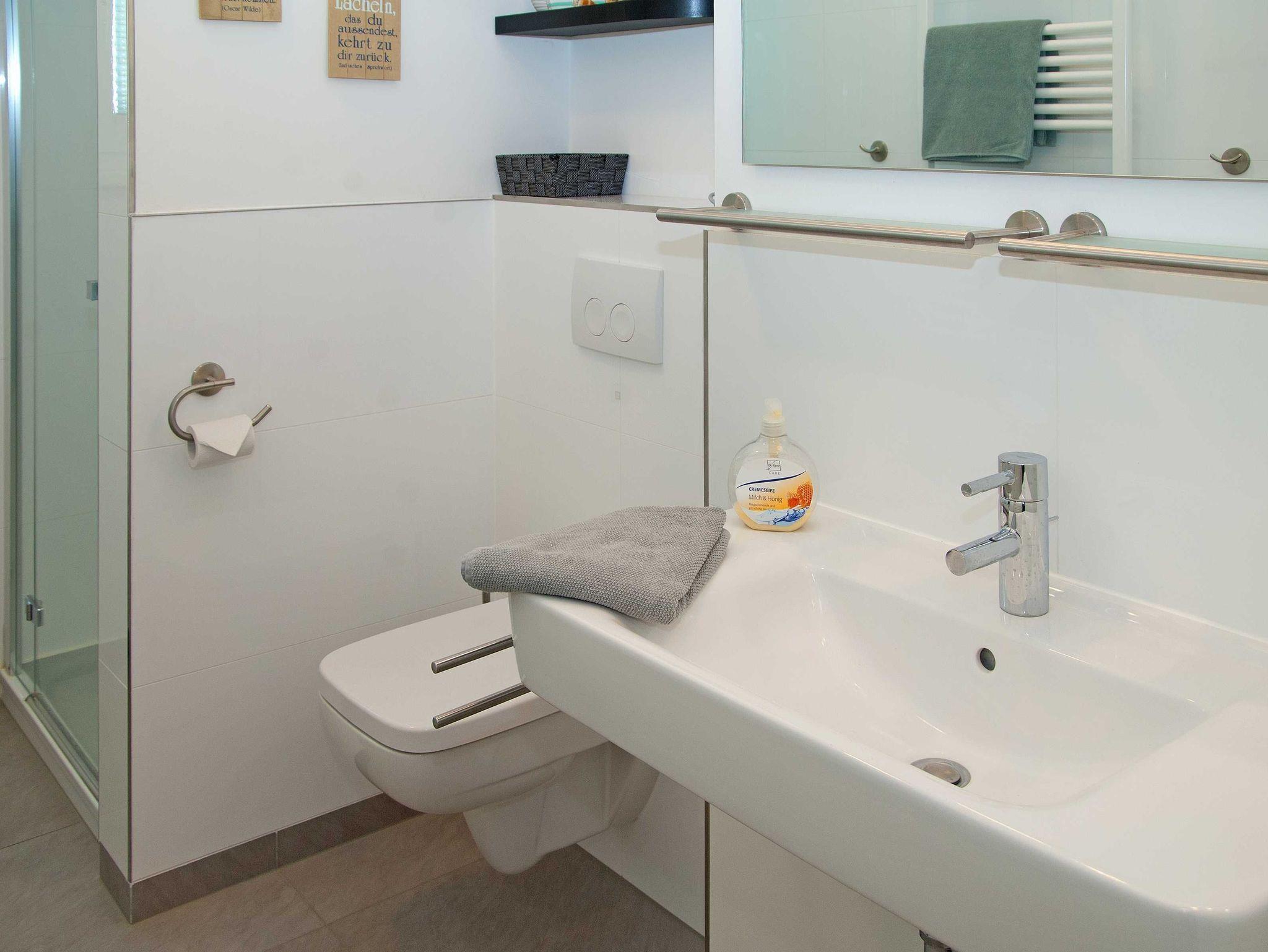 • hochwertiges Bad mit Dusche, großen Waschtisch, WC und Handtuchheizkörper und Fußbodenheizung