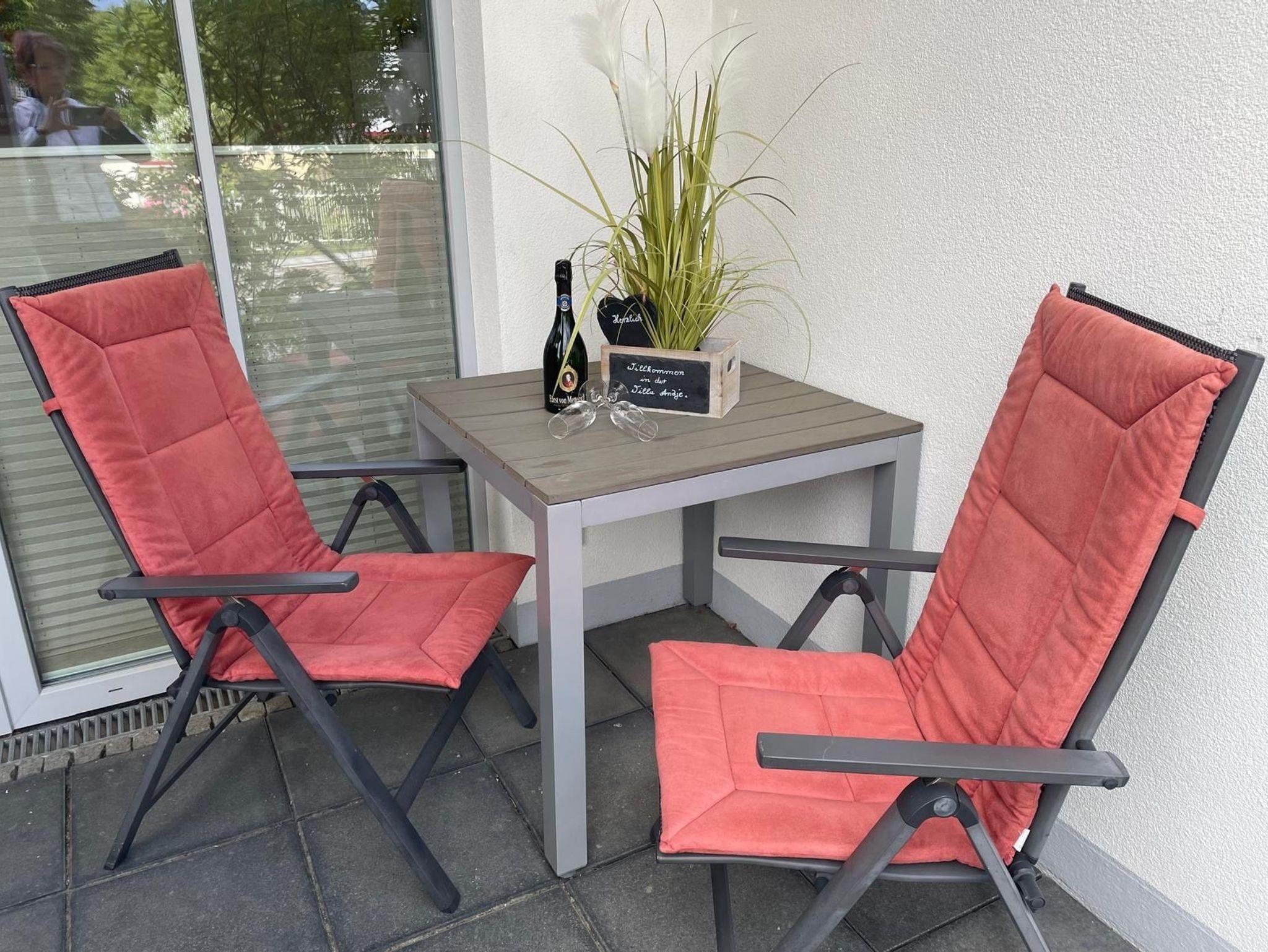 • möblierte Wohnzimmerterrasse mit Strandkorb und Sitzecke