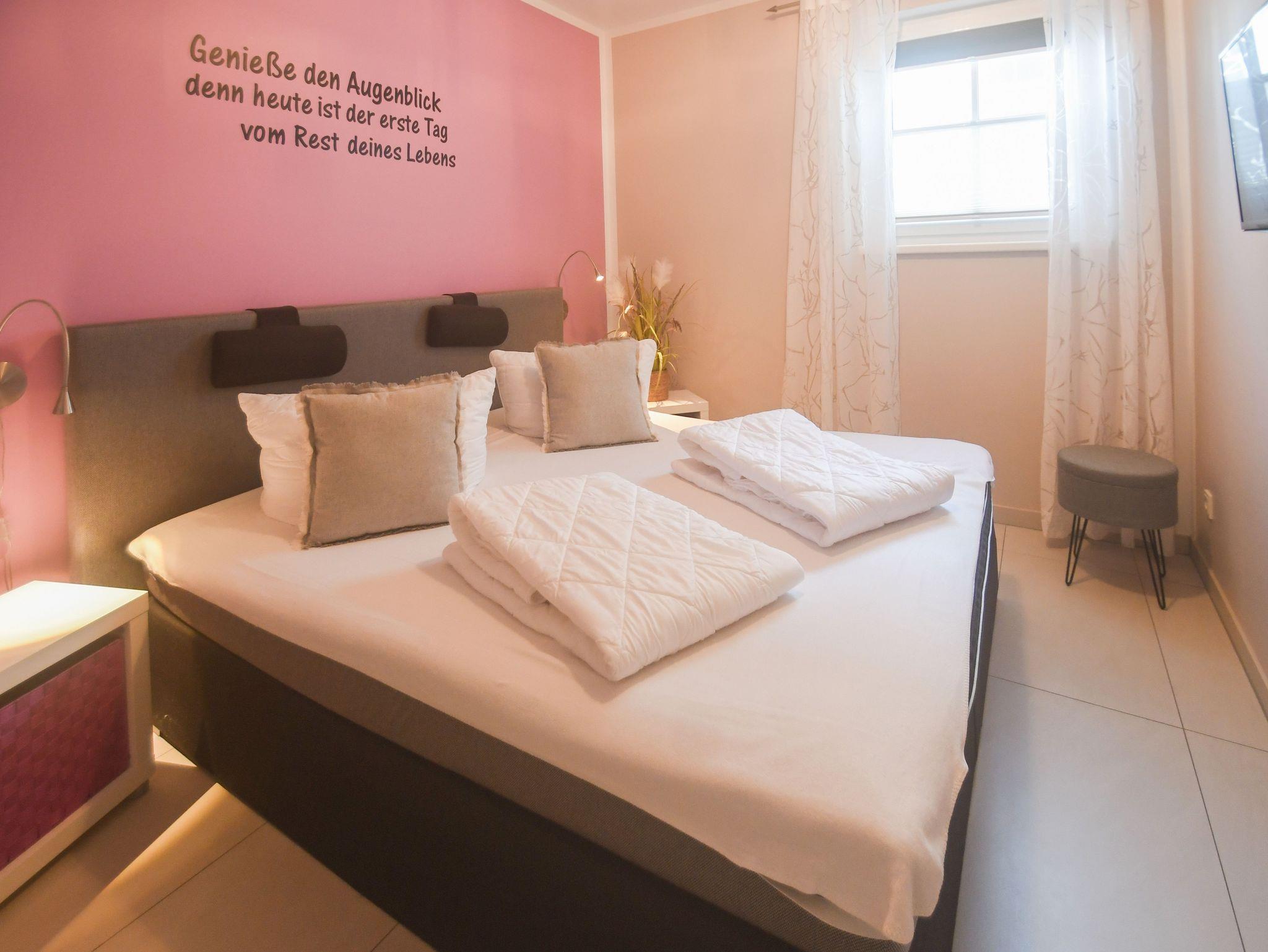 • Schlafzimmer mit bequemen Boxspringbett, Flachbild-TV