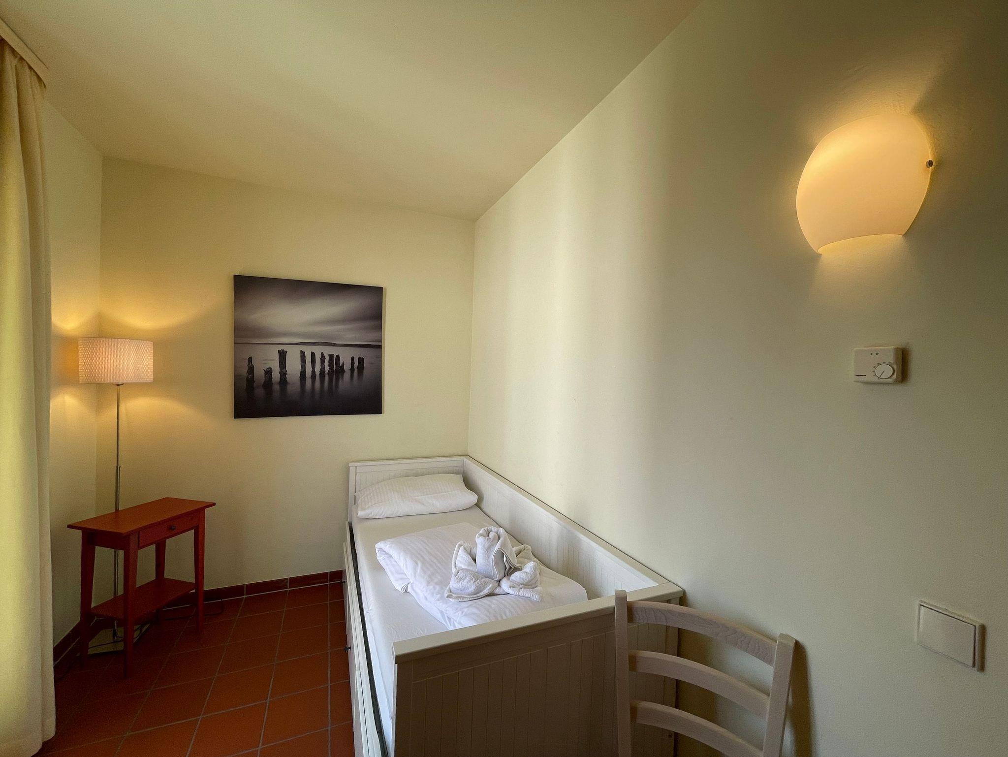 Die geräumige, nach Süd-Ost ausgerichtete 3-Zimmerwohnung ist etwa 55 qm groß und befindet sich im ersten Obergeschoss. Das Appartement ist für 2 bis 6 Personen geeignet. Im Wohnbereich finden Sie eine komfortable Schlafcouch (1,60m x 2,00m), einen LED Fernseher, einen Essplatz für 6 Personen sowie die Küchenzeile. Sie ist mit Cerankochfeld, Spülmaschine, Backofen, Kaffeemaschine, Wasserkocher, Toaster, Kühlschrank mit Eisfach und allen wichtigen Küchenutensilien ausgestattet. An den Wohnbereich grenzt der bestuhlte Süd-Balkon. Das gemütliche Schlafzimmer verfügt über ein Doppelbett (2 x 0,90 x 2,00 m) mit 7-Zonen-Matratzen, einen Kleiderschrank und eine Kommode mit Spiegel. Im zweiten, kleineren Schlafzimmer finden Sie ein Kojenbett (2 x 0,80 x 2,00 m), ebenso einen Kleiderschrank und eine Kommode mit Spiegel. Das Bad ist mit WC, Waschbecken und Föhn ausgestattet. Die geräumige Dusche ist ebenerdig zu begehen und mit Glaswänden abgetrennt. In der kühleren Jahreszeit wärmt die angenehme Fußbodenheizung in allen Räumen den Terracottaboden. Auch im Urlaub brauchen Sie auf einen WLAN-Zugang nicht verzichten. Dieser ist für Sie inklusive vorhanden. Ein eigener Stellplatz Nr. 25 für Ihr Fahrzeug befindet sich hinter dem Haus. In einem separaten Raum können mitgebrachte oder geliehene Fahrräder abgeschlossen werden. Auch 1 Vierbeiner ist gegen eine Gebühr ein gern gesehener Gast. Die Erstausstattung eines Wäschepaketes (komplette Bettwäsche, 1 Duschhandtuch, 1 kleines Handtuch) können Sie bis 14 Tage vor Anreise dazu buchen oder durch eigene ergänzen. Ab 2 gebuchten Paketen erhalten Sie einmalig 1 Geschirrhandtuch und 1 Duschvorleger hinzu.