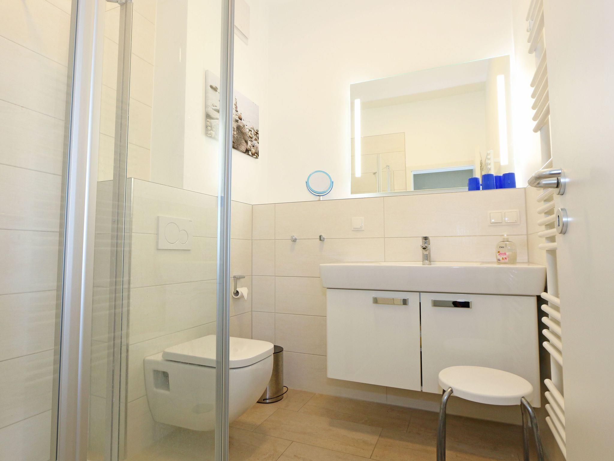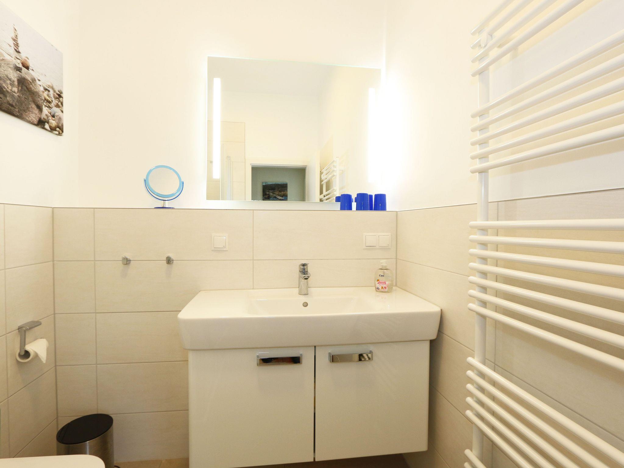 Die 3-Raumferienwohnung (Nichtraucher) liegt im 1. Obergeschoss und bietet mit Ihren ca. 68 qm ausreichend Platz für 2-4 Erwachsene + 1 Kleinkind bis 3 Jahre im Kinderreisebett. Der offene Wohnbereich verfügt über einer Couch, einem Sessel, Couchtisch, Leselampe und Sideboard mit TV, DVD-Player und Mini-Stereo-Anlage mit USB-Anschluss und DAB-Radio. Auch auf einen Internetanschluss (WLAN) müssen Sie im Urlaub nicht verzichten. Die integrierte Küchenzeile mit Cerankochfeld, Backofen, Geschirrspüler, Kühlschrank, Gefrierfach, Mikrowelle, Kaffeemaschine, Wasserkocher, Toaster und diverse Küchenutensilien wird mit einem Essplatz komplettiert. Die Wohnung hat zwei Schlafräume. Das große Schlafzimmer ist mit einem Doppelbett (1,80m x 2,00m), einem großen Kleiderschrank, Nachttischablagen und einer Kommode mit Smart-TV eingerichtet. Zusätzlich befindet sich in dem großen Schlafzimmer eine komfortable Leseecke mit einer kleinen Bücherauswahl. Das kleinere Schlafzimmer ist mit einem Boxspringbett (1,60m x 2,00m), einer Kommode und einem kleinen Kleiderschrank eingerichtet sowie ein Tisch mit 1 Sessel. Der Sanitärbereich wir durch eine ebenerdige Dusche, Waschplatz, WC, Kosmetikspiegel und Fön abgerundet. Den möblierten Balkon erreichen Sie vom Wohn-/Essbereich und Schlafzimmer. Alle Räumlichkeiten können durch Vorhänge verdunkelt werden. 1 Haustier (keine Katzen) ist gegen eine Gebühr ein gern gesehener Gast. Im Keller des Hauses können Sie eine Waschmaschine sowie ein Trockner gegen Gebühr nutzen. Ein PKW-Stellplatz Nr. 06 befindet sich direkt hinter dem Haus. Ihre mitgebrachten Fahrräder oder auch geliehenen Räder können Sie im Fahrradschuppen verschließen. Die Erstausstattung eines Wäschepaketes (komplette Bettwäsche, 1 Duschhandtuch, 2 kleine Handtücher) können Sie bis 14 Tage vor Anreise gegen einen Aufpreis dazu buchen oder durch eigene ergänzen. Ab 2 gebuchten Paketen erhalten Sie einmalig 1 Geschirrhandtuch und 1 Duschvorleger hinzu.