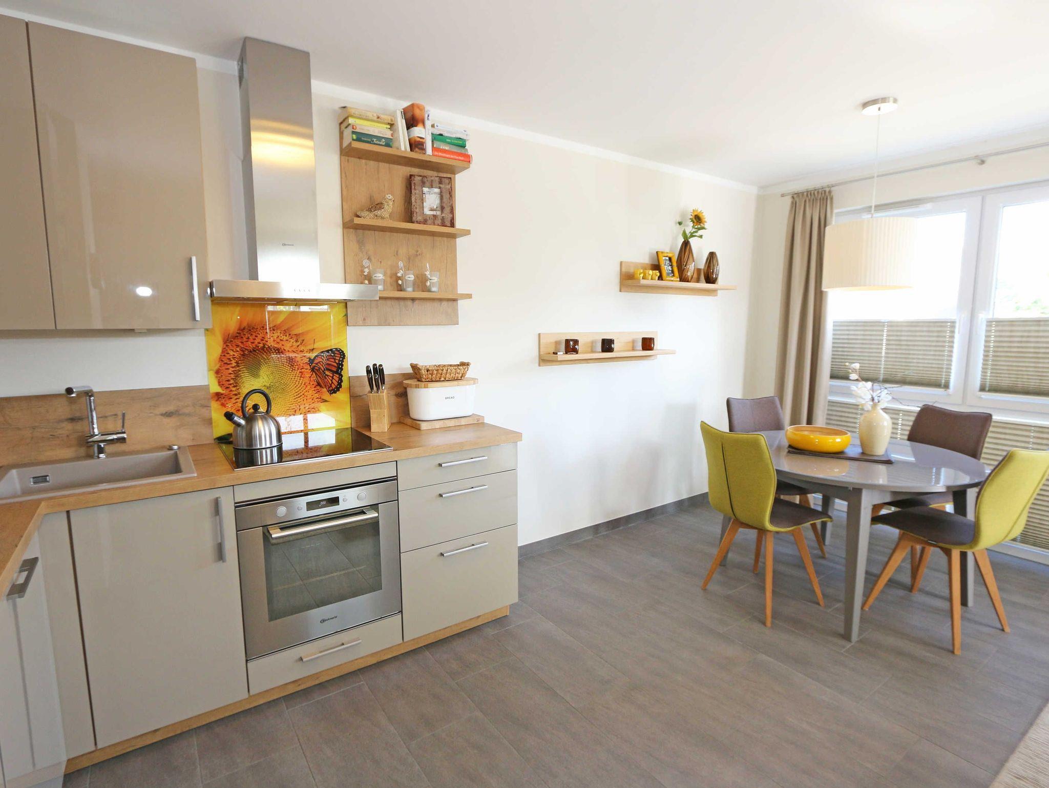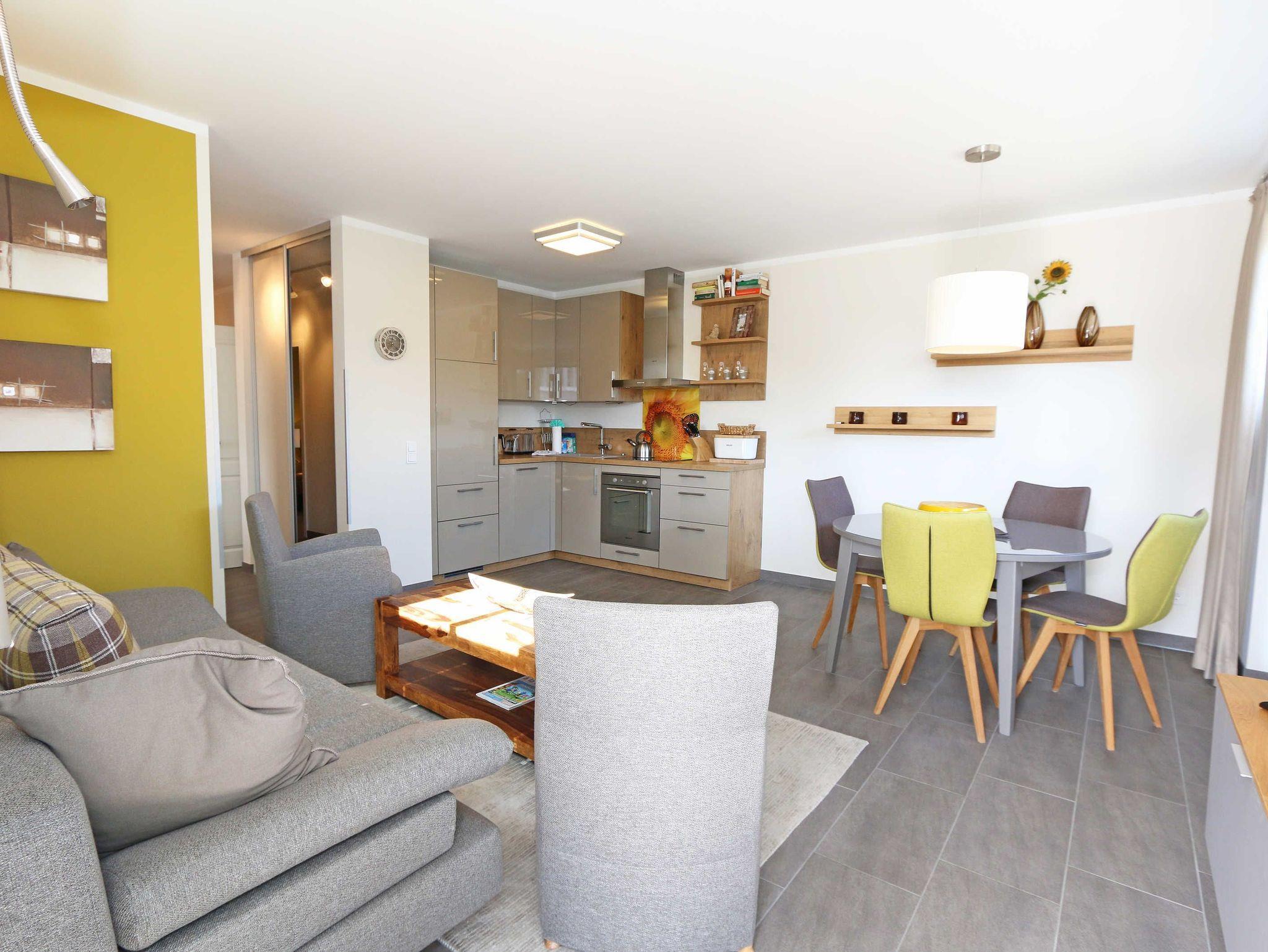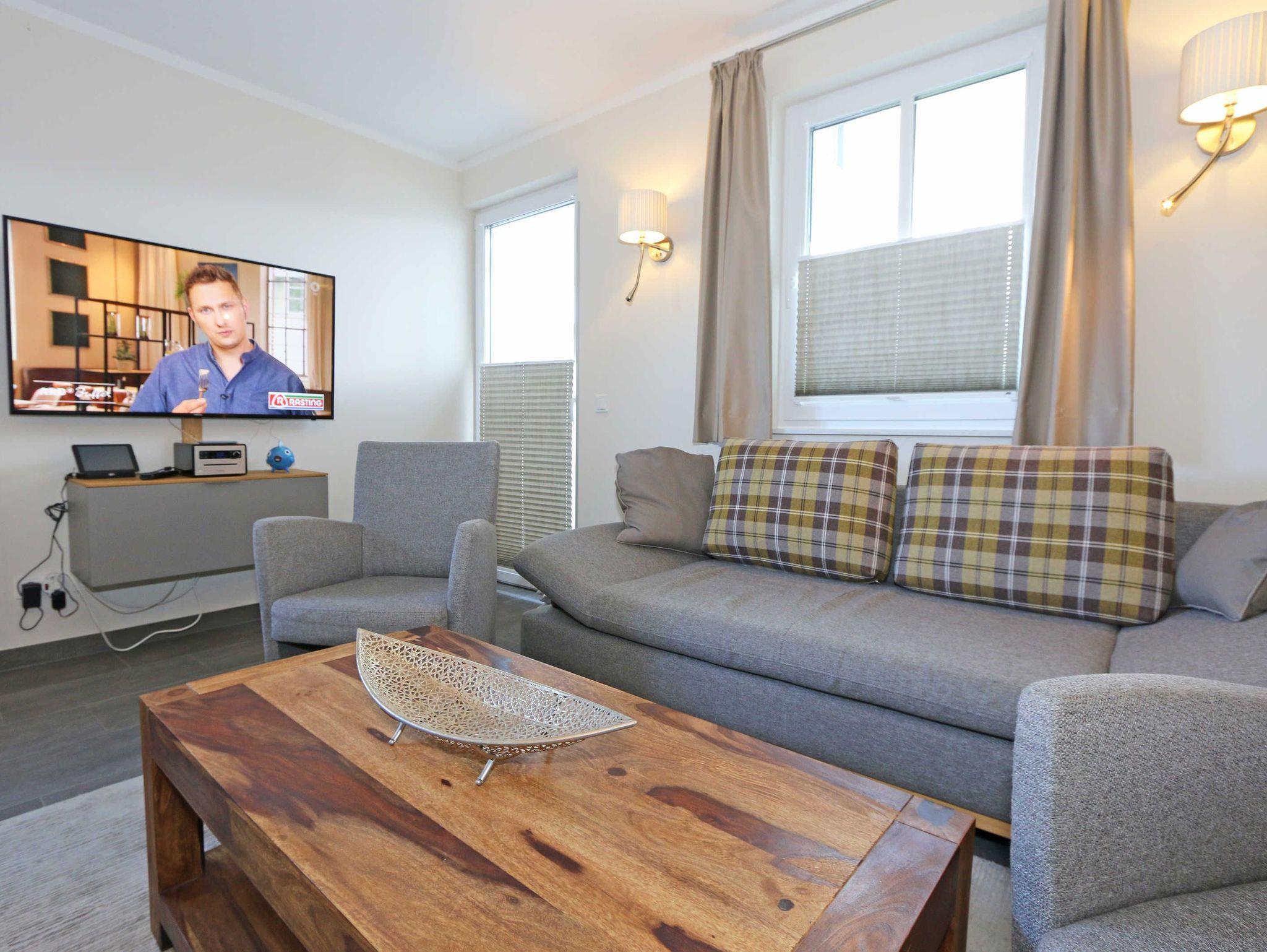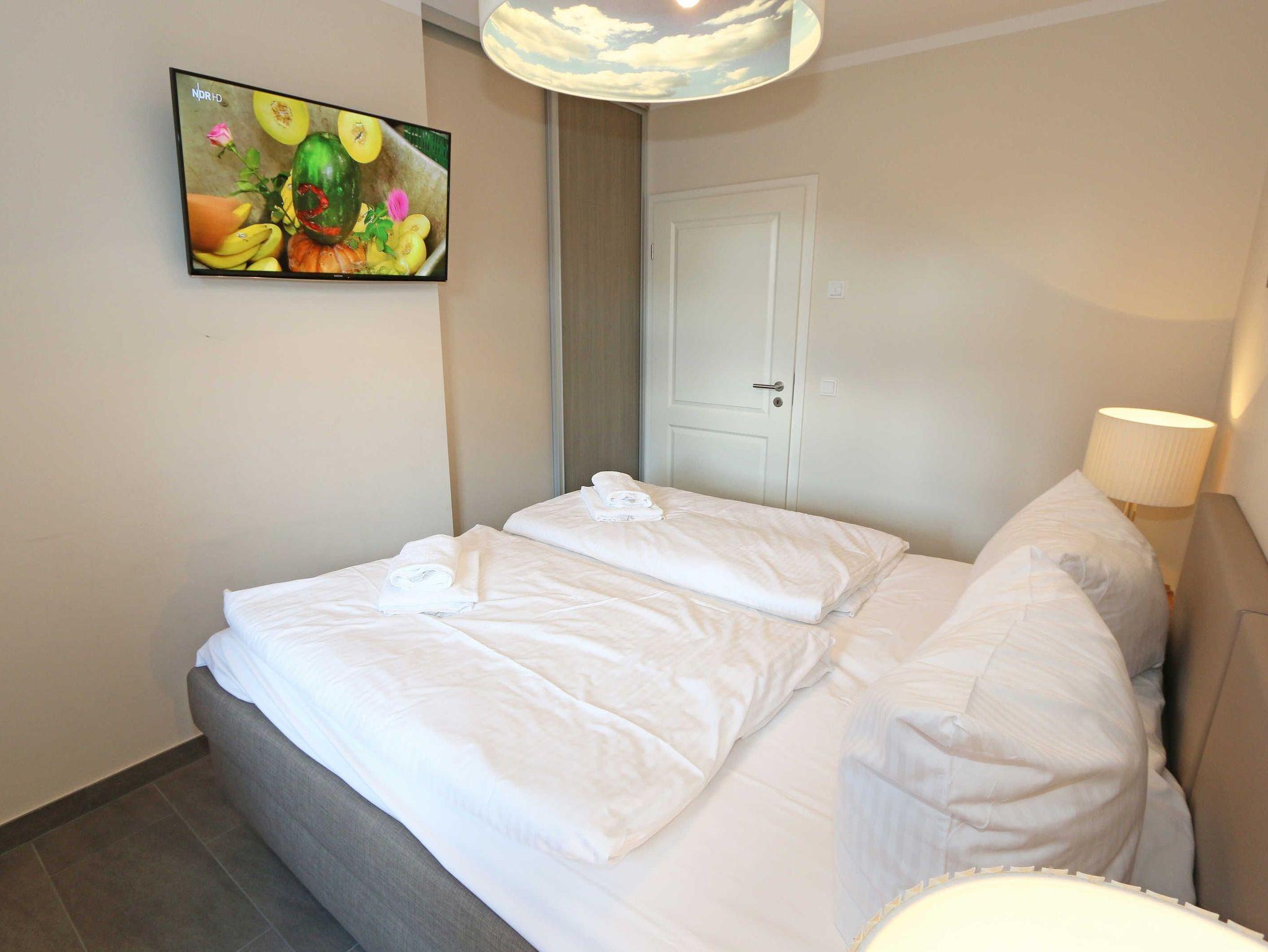 Die Wohnung Nr. 1 in der Villa Anni ist eine komfortable, ca. 60qm große und stilvoll eingerichtete Nichtraucherferienwohnung im Erdgeschoss. Sie bietet mit Ihren 2 Schlafzimmern ausreichend Platz für max. 4 Erwachsene + 1 Kleinkind bis 3 Jahre im Kinderreisebett. Der kombinierte Wohn-/Koch- und Essbereich mit der modernen und integrierten Küchenzeile lässt mit Induktionsfeld, Backofen, Geschirrspüler, Kühlschrank mit Gefrierfach, Kaffeemaschine, Wasserkocher, Toaster und diversen Küchenutensilien keine Wünsche offen. Ein großzügiger Essbereich fügt sich der Küchenzeile an. Der Esstisch ist ausziehbar. Der offene Wohnbereich verfügt über eine gemütliche Couch mit Couchtisch, 2 Leselampen (integriert in den Wandleuchten bei der Couch), ein Smart-TV, Blu-Ray Player sowie eine Mini-Stereo-Anlage von Sonoro mit USB-Port, Bluetooth und DAB-Radio. Auch auf einen Internetanschluss (WLAN) müssen Sie in Ihrem Urlaub nicht verzichten. Dieser ist für Sie inklusive. Eine Auswahl an Gesellschaftsspielen und Urlaubslektüre sorgt für gelungene Abwechslung. Die nach Südost ausgerichtete, überdachte und bestuhlte Terrasse mit Sonnenschirm ist direkt vom Wohnbereich aus zu erreichen. Das erste Schlafzimmer verfügt über ein Boxspringbett (1,80m x 2,00m), ein Smart-TV, Nachttischschränken und einen Kleiderschrank. Das zweite Schlafzimmer verfügt über zwei einzelne Boxspringbetten (0,90m x 2,00m), Nachttischschränken, Flachbild-TV und einen Kleiderschrank. Die Betten sind hier mit Rollen versehen, so könnten Sie die Betten auch zusammenschieben. Alle Räumlichkeiten sind mit Sonnenabweisenden Verdunklungsrollos sowie Insektenschutzgitter ausgestattet. Das Bad verfügt über eine ebenerdige und geräumige Regen-Dusche, einen Waschplatz, ein WC, einen Fön, einen Kosmetikspiegel sowie einen Handtuchheizkörper. Eine Fußbodenheizung sorgt an kühleren Tagen für eine angenehme Wärme. Ein Bügelbrett, ein Bügeleisen, ein Wäscheständer sowie ein Staubsauger stehen Ihnen zur Verfügung. Ihr eigener PKW-Stellplatz (Nr.01) befindet sich in der Tiefgarage (Einfahrtshöhe: 2,00 m) des Hauses. Für Ihre mitgebrachten oder geliehenen Fahrräder steht Ihnen der Stellplatz 9 zusätzlich zur Verfügung. Haustiere sind in der Wohnung gegen eine Gebühr erlaubt. Die Erstausstattung eines Wäschepaketes (komplette Bettwäsche, 1 Duschhandtuch, 2 kleine Handtücher) können Sie bis 14 Tage vor Anreise gegen einen Aufpreis dazu buchen oder durch eigene ergänzen. Ab 2 gebuchten Paketen erhalten Sie einmalig 1 Geschirrhandtuch und 1 Duschvorleger dazu.