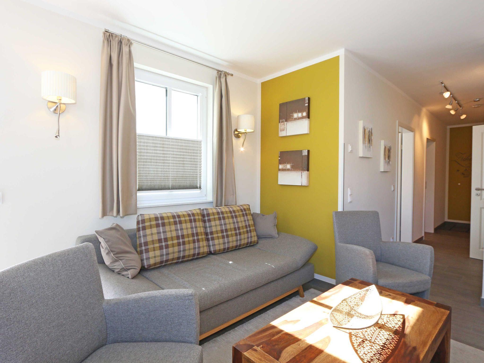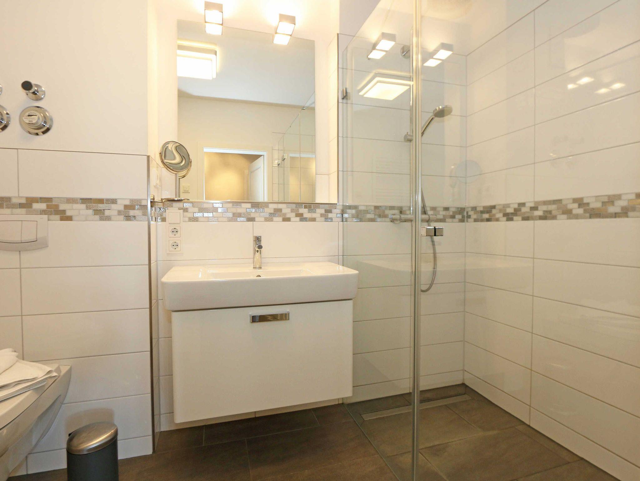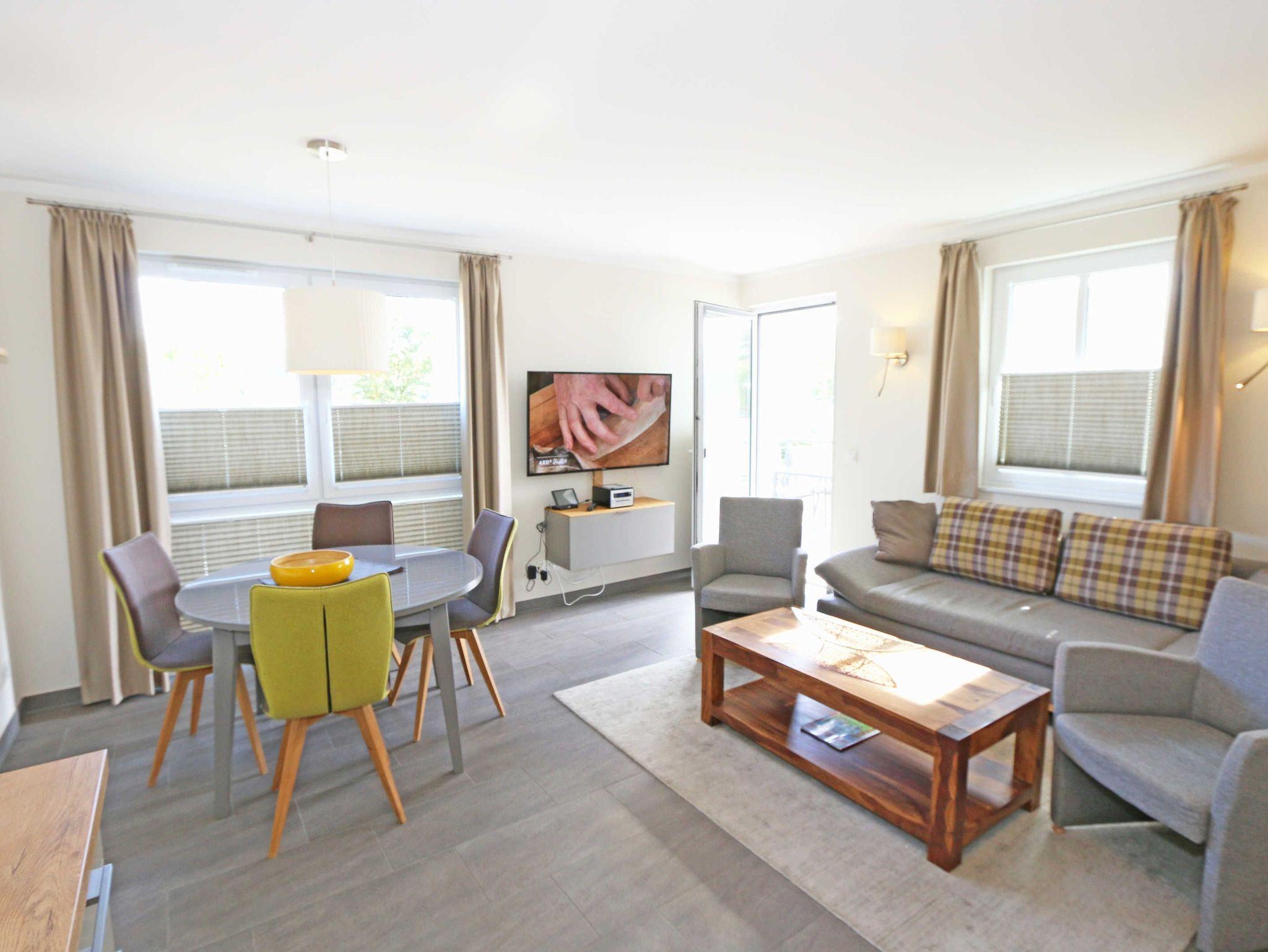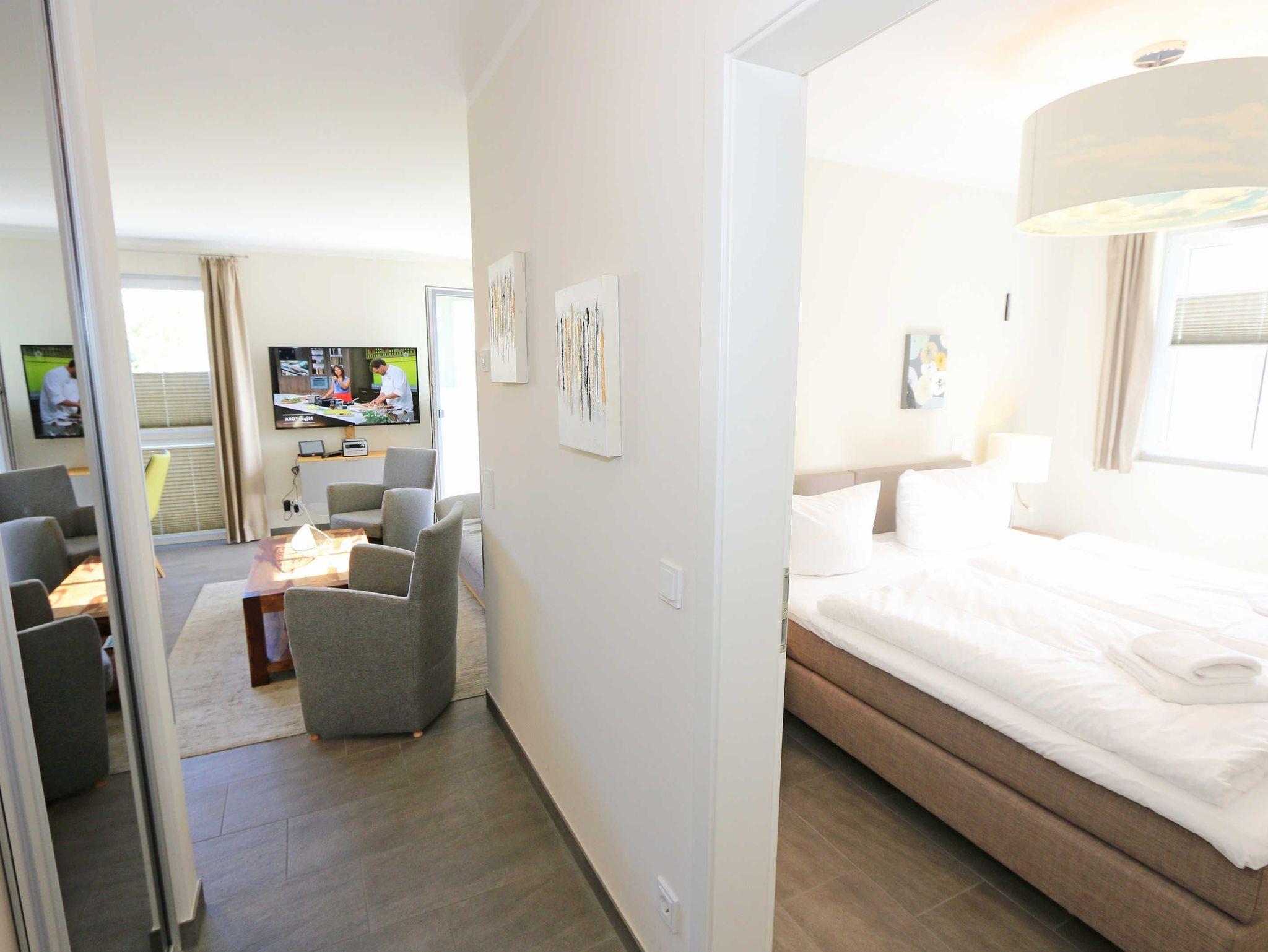 Die Wohnung Nr. 1 in der Villa Anni ist eine komfortable, ca. 60qm große und stilvoll eingerichtete Nichtraucherferienwohnung im Erdgeschoss. Sie bietet mit Ihren 2 Schlafzimmern ausreichend Platz für max. 4 Erwachsene + 1 Kleinkind bis 3 Jahre im Kinderreisebett. Der kombinierte Wohn-/Koch- und Essbereich mit der modernen und integrierten Küchenzeile lässt mit Induktionsfeld, Backofen, Geschirrspüler, Kühlschrank mit Gefrierfach, Kaffeemaschine, Wasserkocher, Toaster und diversen Küchenutensilien keine Wünsche offen. Ein großzügiger Essbereich fügt sich der Küchenzeile an. Der Esstisch ist ausziehbar. Der offene Wohnbereich verfügt über eine gemütliche Couch mit Couchtisch, 2 Leselampen (integriert in den Wandleuchten bei der Couch), ein Smart-TV, Blu-Ray Player sowie eine Mini-Stereo-Anlage von Sonoro mit USB-Port, Bluetooth und DAB-Radio. Auch auf einen Internetanschluss (WLAN) müssen Sie in Ihrem Urlaub nicht verzichten. Dieser ist für Sie inklusive. Eine Auswahl an Gesellschaftsspielen und Urlaubslektüre sorgt für gelungene Abwechslung. Die nach Südost ausgerichtete, überdachte und bestuhlte Terrasse mit Sonnenschirm ist direkt vom Wohnbereich aus zu erreichen. Das erste Schlafzimmer verfügt über ein Boxspringbett (1,80m x 2,00m), ein Smart-TV, Nachttischschränken und einen Kleiderschrank. Das zweite Schlafzimmer verfügt über zwei einzelne Boxspringbetten (0,90m x 2,00m), Nachttischschränken, Flachbild-TV und einen Kleiderschrank. Die Betten sind hier mit Rollen versehen, so könnten Sie die Betten auch zusammenschieben. Alle Räumlichkeiten sind mit Sonnenabweisenden Verdunklungsrollos sowie Insektenschutzgitter ausgestattet. Das Bad verfügt über eine ebenerdige und geräumige Regen-Dusche, einen Waschplatz, ein WC, einen Fön, einen Kosmetikspiegel sowie einen Handtuchheizkörper. Eine Fußbodenheizung sorgt an kühleren Tagen für eine angenehme Wärme. Ein Bügelbrett, ein Bügeleisen, ein Wäscheständer sowie ein Staubsauger stehen Ihnen zur Verfügung. Ihr eigener PKW-Stellplatz (Nr.01) befindet sich in der Tiefgarage (Einfahrtshöhe: 2,00 m) des Hauses. Für Ihre mitgebrachten oder geliehenen Fahrräder steht Ihnen der Stellplatz 9 zusätzlich zur Verfügung. Haustiere sind in der Wohnung gegen eine Gebühr erlaubt. Die Erstausstattung eines Wäschepaketes (komplette Bettwäsche, 1 Duschhandtuch, 2 kleine Handtücher) können Sie bis 14 Tage vor Anreise gegen einen Aufpreis dazu buchen oder durch eigene ergänzen. Ab 2 gebuchten Paketen erhalten Sie einmalig 1 Geschirrhandtuch und 1 Duschvorleger dazu.