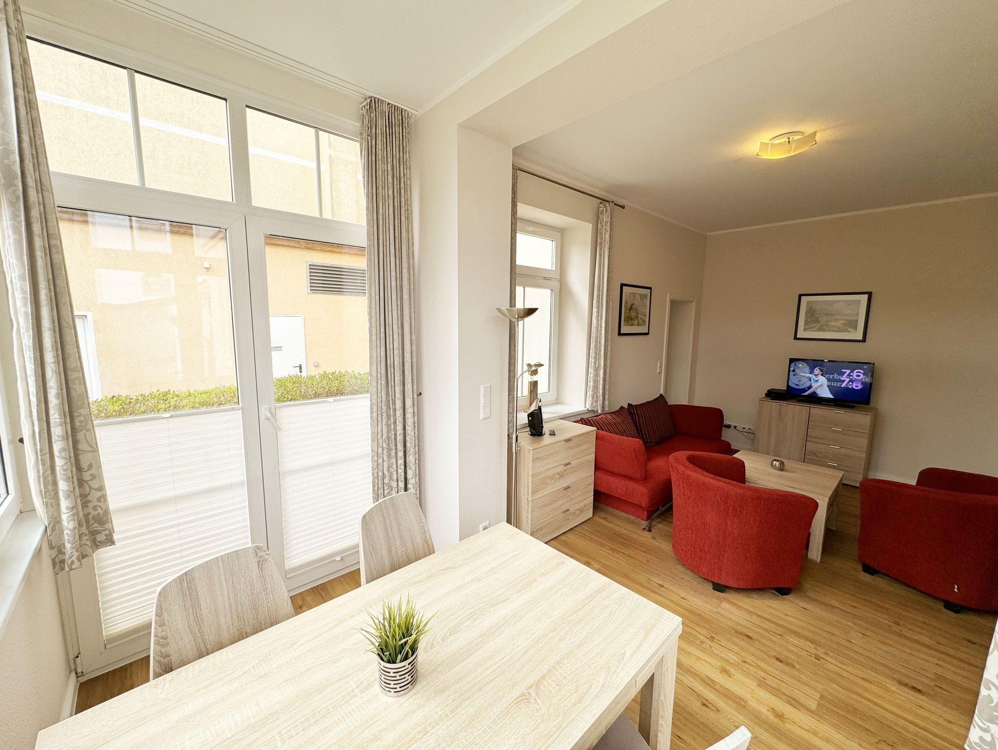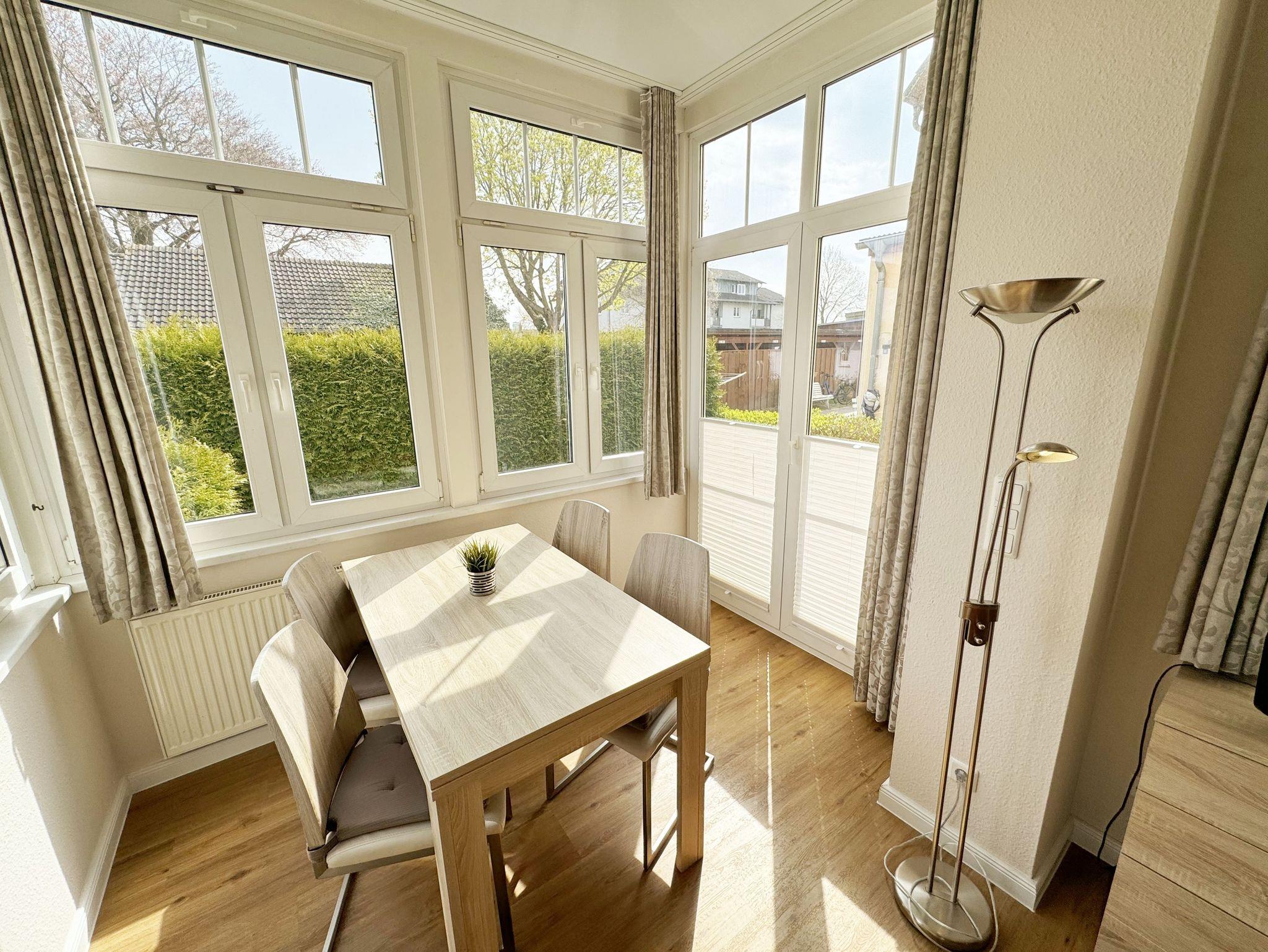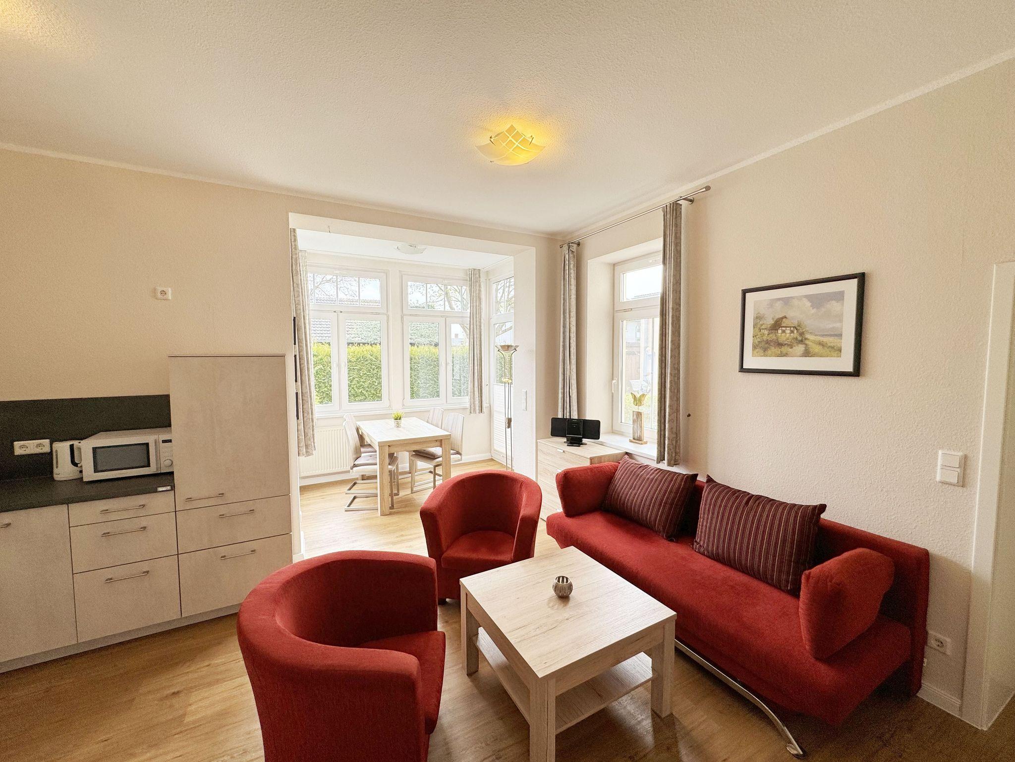 Die komfortable, ca. 44 m² große Nichtraucherwohnung befindet sich im Erdgeschoss der Villa Störtebeker und ist für max. 2 Erwachsene + 1 Kleinkind im Kinderreisebett bis 3 Jahre ausgelegt. Zu der Wohnung gehört eine bestuhlte Terrasse (Südost) in ruhiger Lage, mit Blick auf den Innenhof der Villa Störtebeker. Im Wohnbereich der Wohnung erwartet Sie eine gemütliche Couch mit Couchtisch, einer Leselampe, eine Bücherecke mit kleiner Auswahl sowie Gesellschaftsspielen in einem Sideboard. Ein LCD-TV, Blu Ray-Player und eine Mini-Stereo-Anlage mit CD und USB - Anschluss sorgen für Ihre Unterhaltungsmöglichkeiten. Ein WLAN-Anschluss zur freien Nutzung ist ebenfalls für Sie vorhanden. Angrenzend zum offenen Wohnbereich befinden sich die Küchenzeile mit Ceranfeld, Backofen, Mikrowelle, Geschirrspüler, Kühlschrank mit Eisfach, Kaffeemaschine, Wasserkocher, Toaster und weitere diverse Küchenutensilien. Ein Essplatz in der hellen und vollverglasten Veranda komplettiert diese. Das Schlafzimmer bietet Ihnen mit einem Doppelbett (1,80m x 2,00m), Nachtischablagen und geräumigem Kleiderschrank einen angenehmen Schlaf. Das geflieste Bad ist mit einer Dusche, Waschplatz, WC, Wäscheständer und Fön ausgestattet. Alle Räumlichkeiten lassen sich durch Vorhänge verdunkeln. Der Wohn- & Schlafbereich ist zusätzlich mit Insektenschutz versehen. Direkt auf dem Grundstück des Hauses befindet sich Ihr PKW-Stellplatz (Nr. 2). Im Keller des Hauses können Sie eine Waschmaschine sowie ein Trockner gegen Gebühr nutzen. Ihre mitgebrachten oder geliehenen Fahrräder können Sie im verschließbaren Fahrradschuppen unterbringen. 1 Haustier ist mit seinem eigenen Schlafplatz gegen eine Gebühr ein gern gesehener Gast. Die Erstausstattung eines Wäschepaketes (komplette Bettwäsche, 1 Duschhandtuch, 2 kleine Handtücher) können Sie bis 14 Tage vor Anreise gegen einen Aufpreis dazu buchen oder durch eigene ergänzen. Ab 2 gebuchten Paketen erhalten Sie einmalig 1 Geschirrhandtuch und 1 Duschvorleger hinzu.