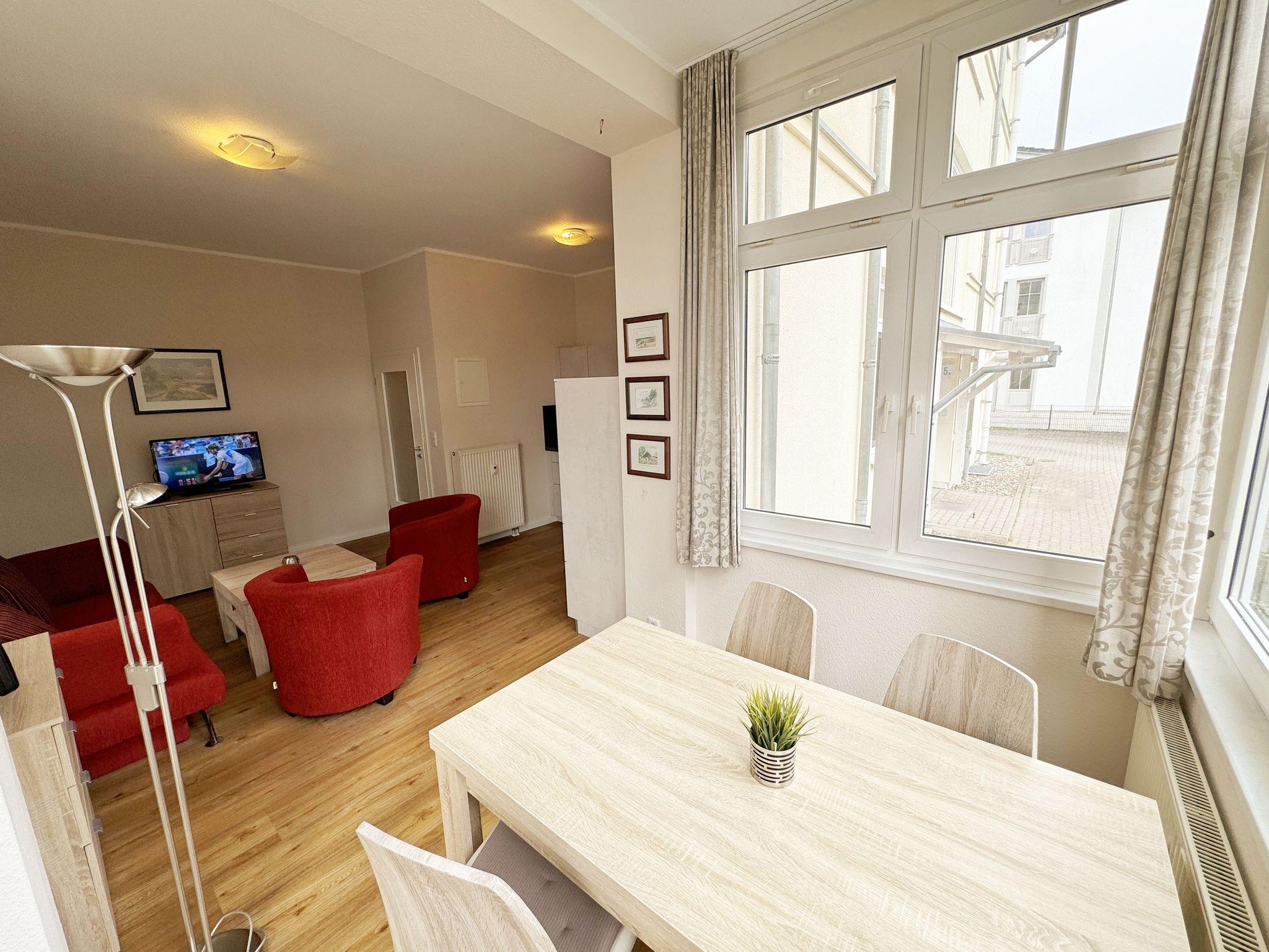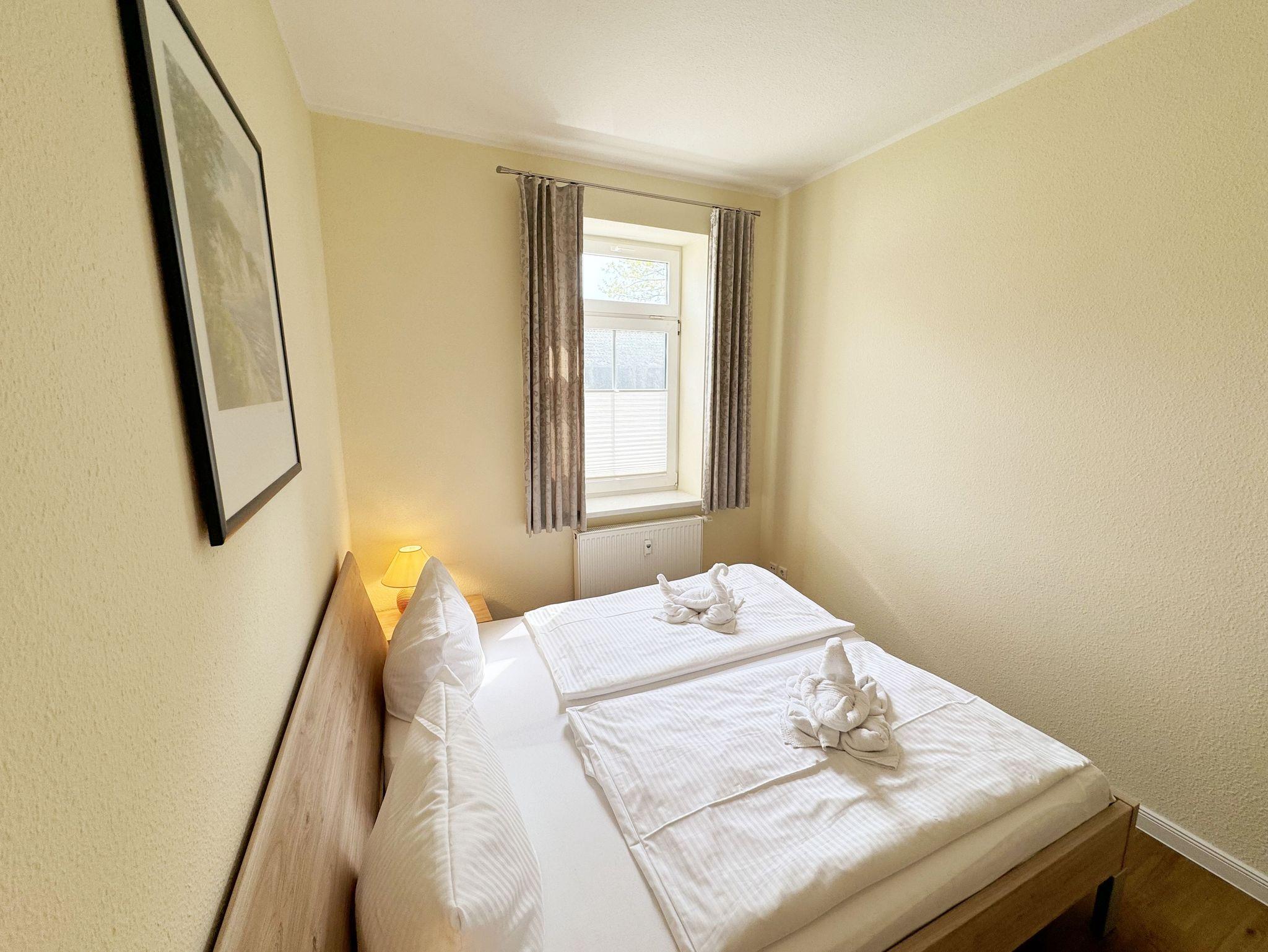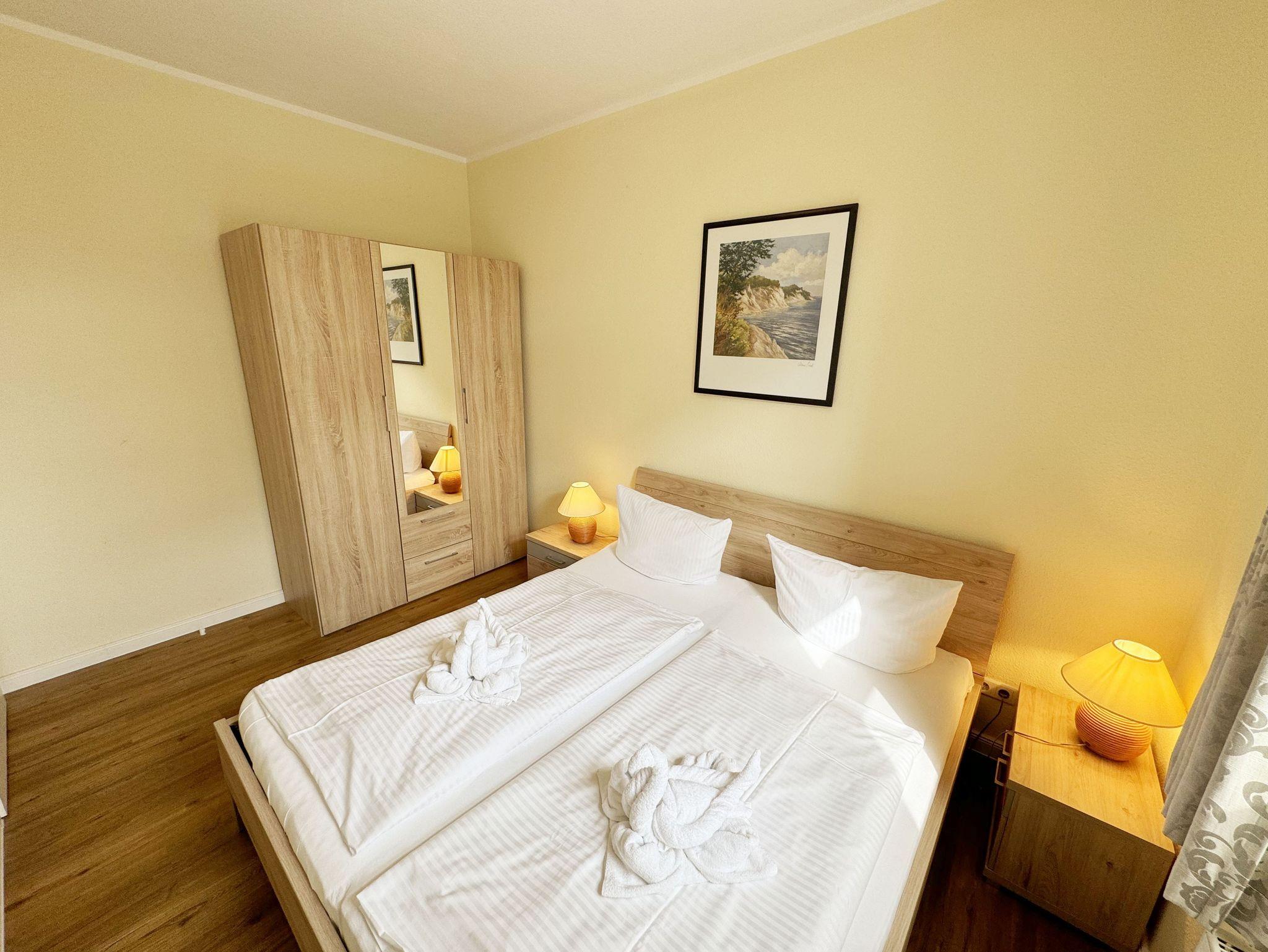 Die komfortable, ca. 44 m² große Nichtraucherwohnung befindet sich im Erdgeschoss der Villa Störtebeker und ist für max. 2 Erwachsene + 1 Kleinkind im Kinderreisebett bis 3 Jahre ausgelegt. Zu der Wohnung gehört eine bestuhlte Terrasse (Südost) in ruhiger Lage, mit Blick auf den Innenhof der Villa Störtebeker. Im Wohnbereich der Wohnung erwartet Sie eine gemütliche Couch mit Couchtisch, einer Leselampe, eine Bücherecke mit kleiner Auswahl sowie Gesellschaftsspielen in einem Sideboard. Ein LCD-TV, Blu Ray-Player und eine Mini-Stereo-Anlage mit CD und USB - Anschluss sorgen für Ihre Unterhaltungsmöglichkeiten. Ein WLAN-Anschluss zur freien Nutzung ist ebenfalls für Sie vorhanden. Angrenzend zum offenen Wohnbereich befinden sich die Küchenzeile mit Ceranfeld, Backofen, Mikrowelle, Geschirrspüler, Kühlschrank mit Eisfach, Kaffeemaschine, Wasserkocher, Toaster und weitere diverse Küchenutensilien. Ein Essplatz in der hellen und vollverglasten Veranda komplettiert diese. Das Schlafzimmer bietet Ihnen mit einem Doppelbett (1,80m x 2,00m), Nachtischablagen und geräumigem Kleiderschrank einen angenehmen Schlaf. Das geflieste Bad ist mit einer Dusche, Waschplatz, WC, Wäscheständer und Fön ausgestattet. Alle Räumlichkeiten lassen sich durch Vorhänge verdunkeln. Der Wohn- & Schlafbereich ist zusätzlich mit Insektenschutz versehen. Direkt auf dem Grundstück des Hauses befindet sich Ihr PKW-Stellplatz (Nr. 2). Im Keller des Hauses können Sie eine Waschmaschine sowie ein Trockner gegen Gebühr nutzen. Ihre mitgebrachten oder geliehenen Fahrräder können Sie im verschließbaren Fahrradschuppen unterbringen. 1 Haustier ist mit seinem eigenen Schlafplatz gegen eine Gebühr ein gern gesehener Gast. Die Erstausstattung eines Wäschepaketes (komplette Bettwäsche, 1 Duschhandtuch, 2 kleine Handtücher) können Sie bis 14 Tage vor Anreise gegen einen Aufpreis dazu buchen oder durch eigene ergänzen. Ab 2 gebuchten Paketen erhalten Sie einmalig 1 Geschirrhandtuch und 1 Duschvorleger hinzu.