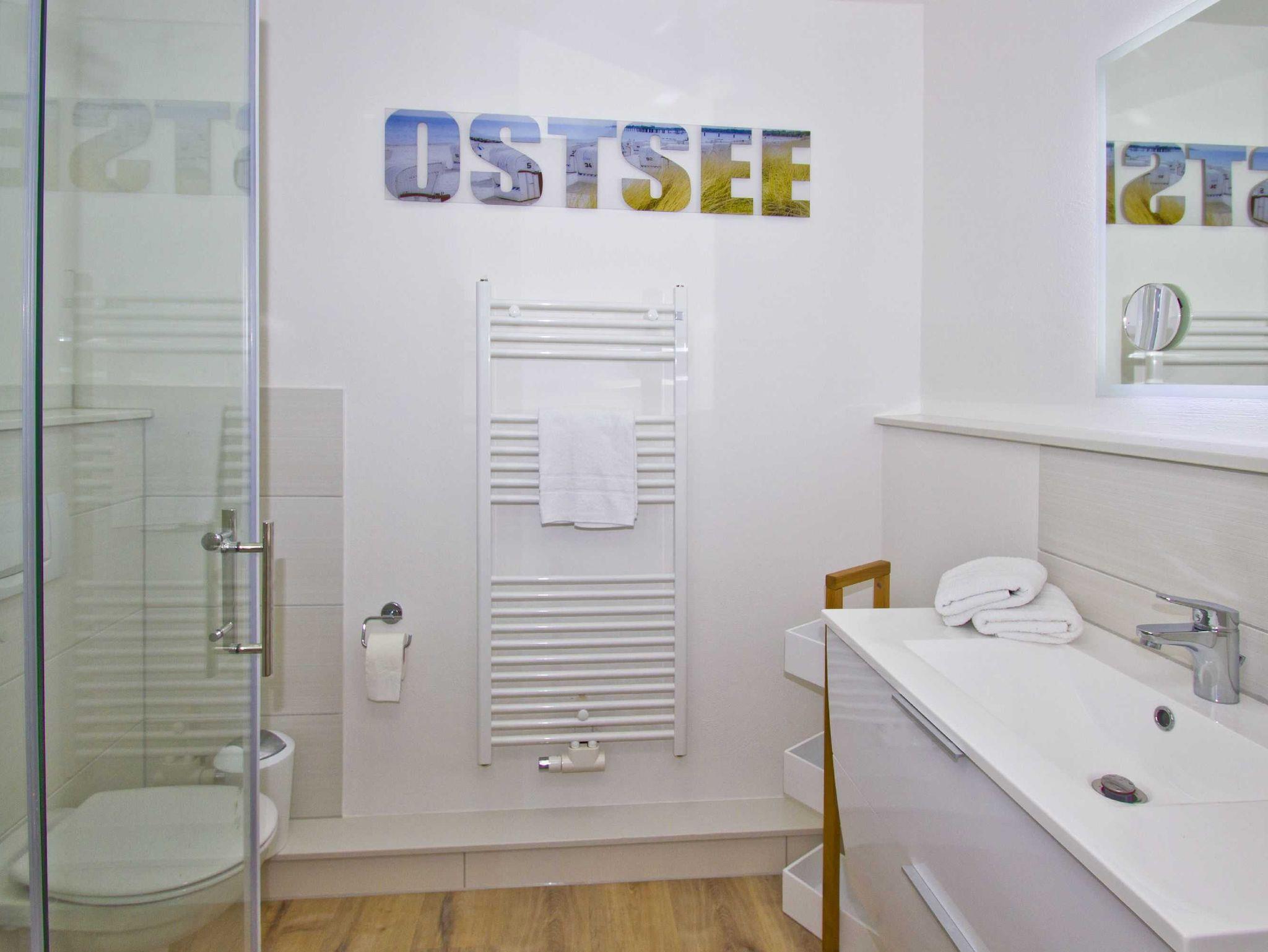 Wie der Rest der Ferienwohnung im Haus Nordstrand ist auch das Badezimmer sehr hell gestaltet. Die edle Kombination aus reinem Weiß und ausstrahlungsreichen Holztönen beschert Ihnen am Morgen vor den bevorstehenden Abenteuern einen stimmungsvollen Start in den Tag und am Abend nach den betörenden Erlebnissen an der Ostsee einen runden Abschluss. Apropos Ostsee: Beim Duschen in der modernen Kabine mit flachem Einstieg haben Sie die Möglichkeit, gedanklich schon oder wieder im Meer zu baden - dank der attraktiven Wandgestaltung über der Heizung. Zudem umfasst das Badezimmer der Ferienwohnung ein WC und ein Waschbecken mit eckigem Spiegel sowie praktischen Ablageflächen und Verstauungsoptionen für Ihre Kosmetika.