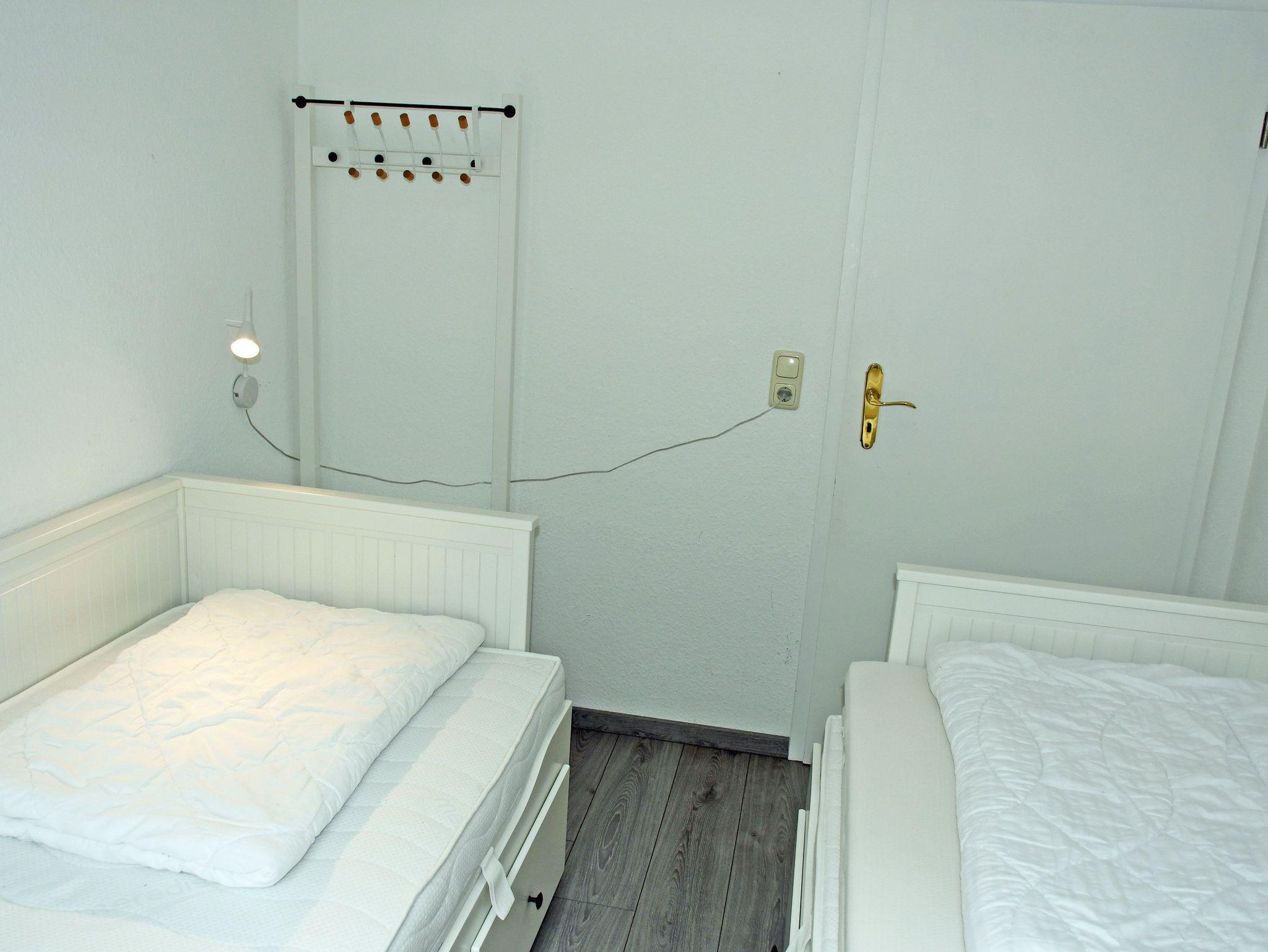 · Schlafzimmer mit 2 Einzelbetten (in der Fewo 18 Etagenbett) und kleinem Schreibtisch