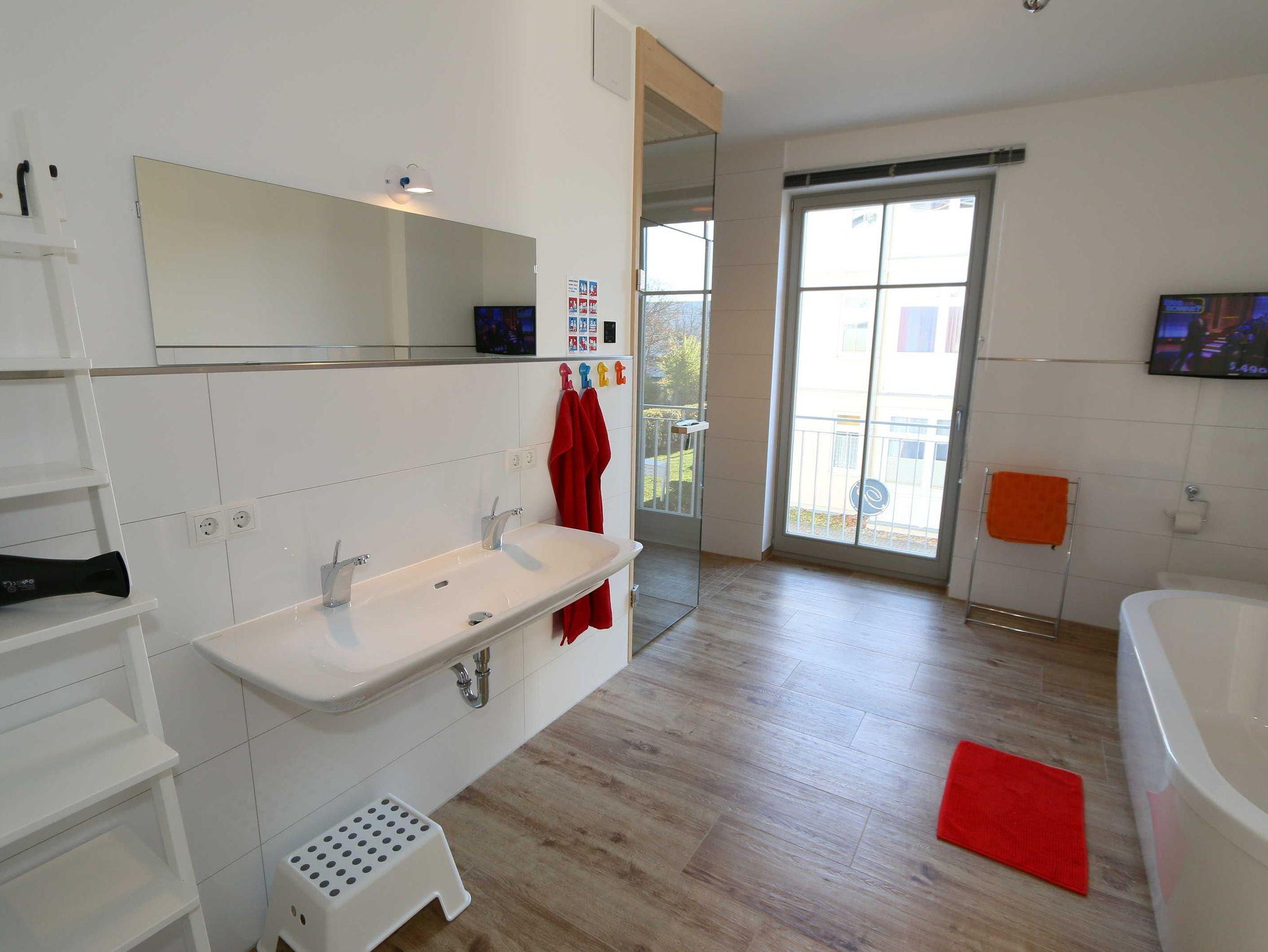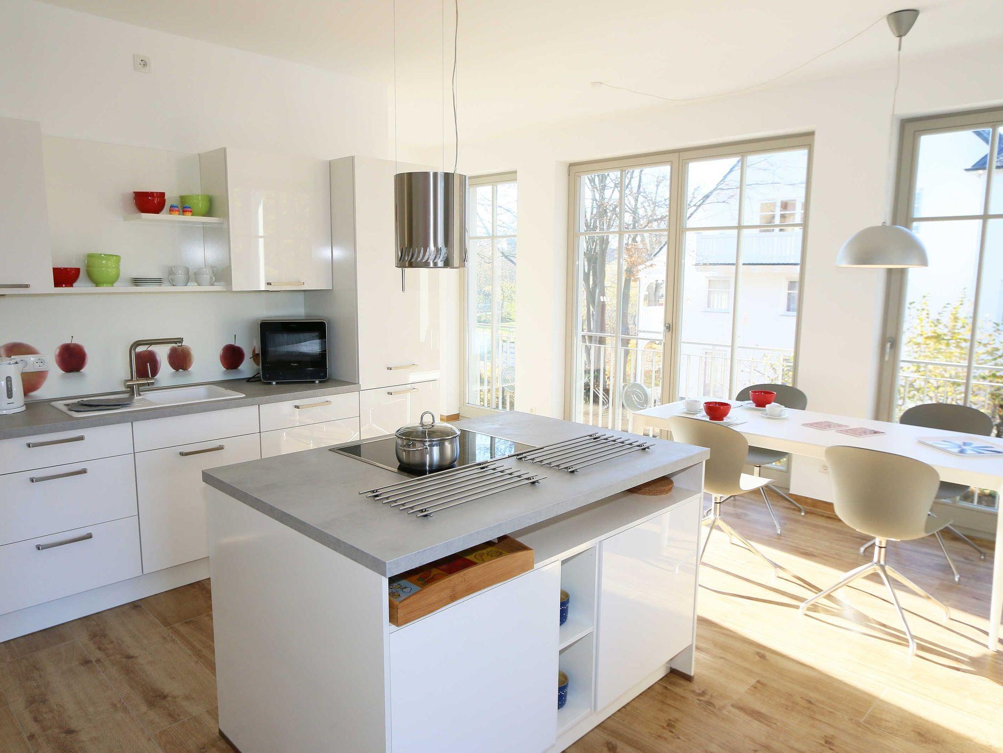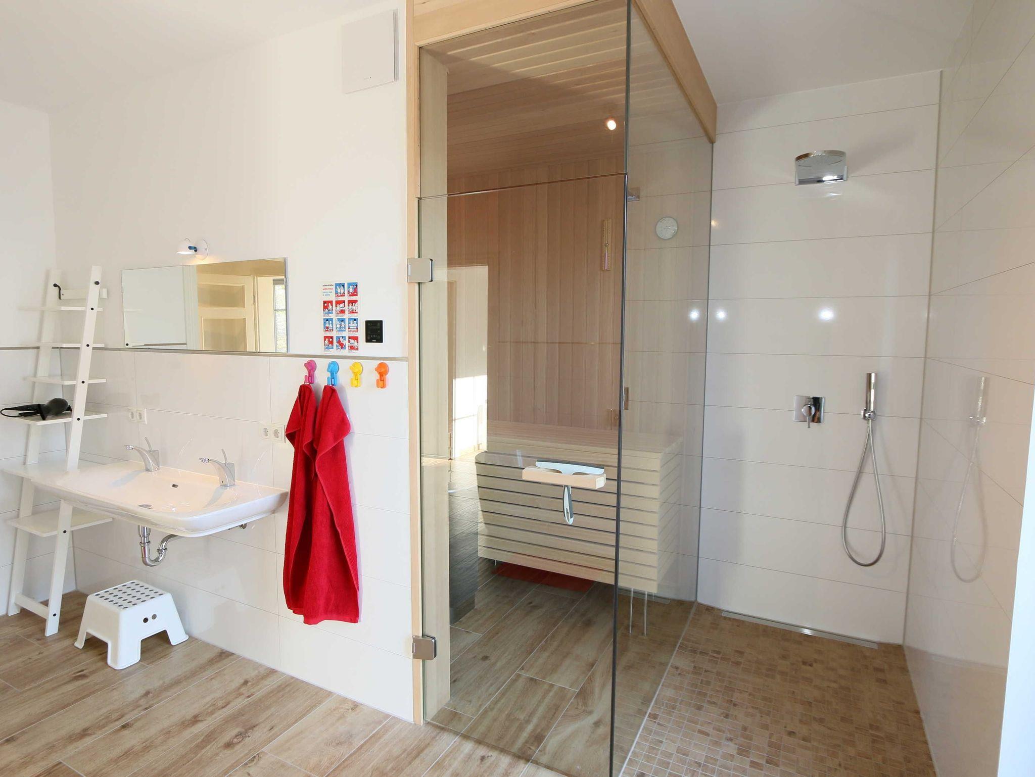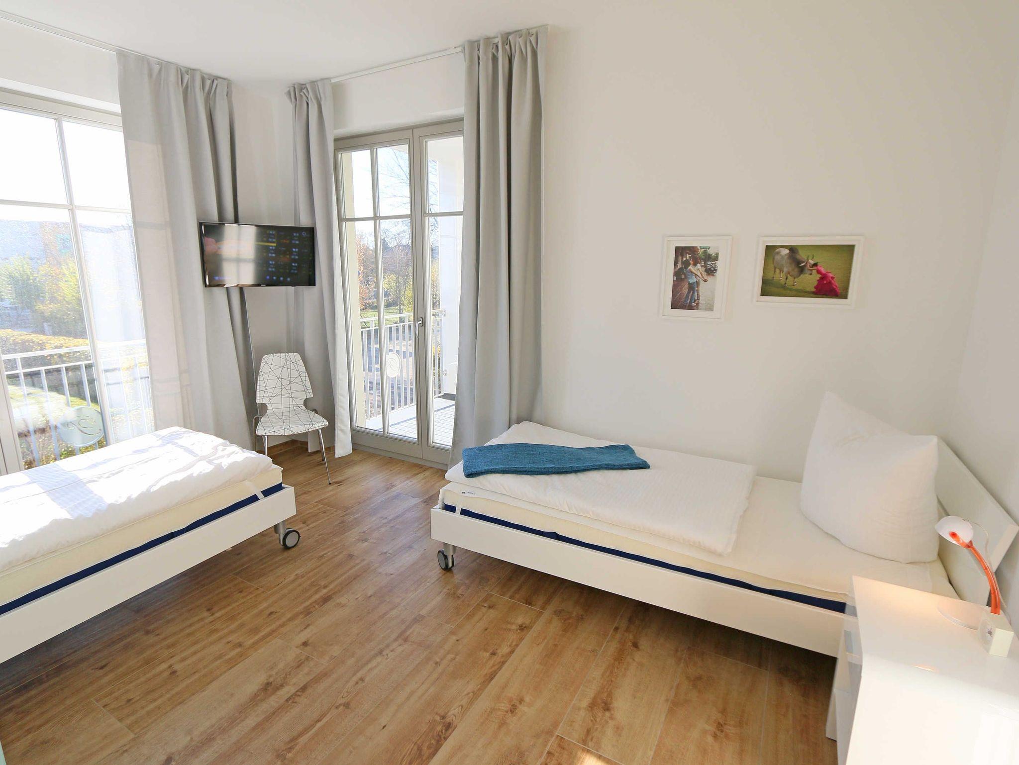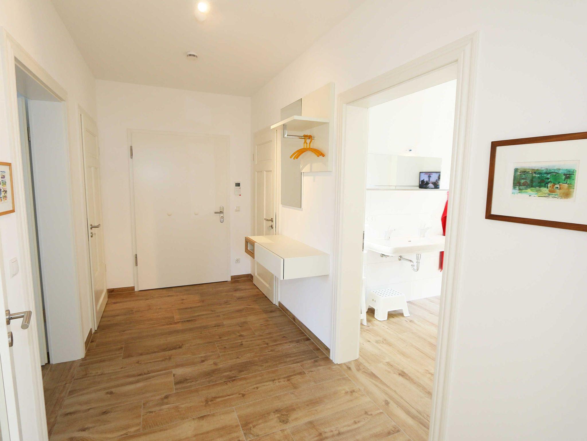 Die Ferienwohnung (Nichtraucher) hat eine Wohnfläche von ca. 92 m² zuzüglich 28 m² überdachtem Balkon. Die Wohnung ist optimal für max. 4 Erwachsene und 2 Kleinkinder bis zu 3 Jahren im Kinderreisebett ausgestattet. 1x Hochstuhl und 1x Kinderreisebett mit zusätzlicher Matratze ohne Bettinlett stehen Ihnen inklusive zur Verfügung. Die verwendeten Materialien der Wohnung sind exklusiv. Ökologische Gesichtspunkte wurden berücksichtigt, so versorgt Sie die Solartherme mit warmem Wasser und die dreifach verglasten Fenster vermindern den Verbrauch an Wärmeenergie. Die Schallschutz-Eingangstür und der private Vorflur schirmen Sie von den anderen Wohnungen ab. Die Möblierung der Wohnung haben wir der Lage und Architektur angepasst: hell, luftig, offen, modern: genießen Sie die Weite und Leichtigkeit auch im Inneren der Wohnung. Der Wohn-/Essbereich ist überwiegend in dänischem Design gestaltet. Technisch ist das Wohnzimmer mit einem Smart-TV, einem Blu-Ray-Player, einer Stereoanlage mit Anschlussmöglichkeit für Android oder I-Phone via Bluetooth sowie DAB-Radio und einem Internetanschluss (WLAN) ausgestattet. In der kalten Jahreszeit sorgt ein Kamin (mit Seitenscheiben für Rundumblick auf die Flammen) für eine angenehme Atmosphäre. Ein Schreibtisch, ein Lesesessel, eine Leselampe und eine komfortable Couchecke runden den Wohnbereich ab. Die helle Küche mit Kochinsel, offen zum Wohnbereich, ist vollwertig ausgestattet mit Geschirrspüler, Kühlschrank, Gefrierschrank, Backofen, 4-Zonen-Cerankochfeld, Mikrowelle, Kaffeemaschine, Toaster, Wasserkocher, Nespresso-Maschine, Mixer und French Press. Ein großer Esstisch lädt zum gemeinsamen Essen ein. Für den erholsamen Schlaf erwarten Sie im en-suite Schlafzimmer ein bequemes Komfort-Doppelbett (1,80 m x 2,00 m) mit hochwertigen Matratzen und verstellbaren Lattenrosten, ein Kleiderschrank, Nachttische und Wecker. Das 2.Schlafzimmer ist identisch ausgestattet, mit dem Unterschied, dass zwei Einzelbetten (je 0,90 m x 2,00 m) Ihrem geruhsamen Schlaf dienen. Die Betten sind leicht beweglich und können zusammen oder getrennt gestellt werden. Beide Schlafzimmer können bei Bedarf vollständig verdunkelt werden und verfügen zusätzlich über je einen Smart-TV. Auf die Balkone gelangen Sie vom Wohn-/Essbereich sowie beiden Schlafzimmern. Die Balkone (Nord/West & Süd/West) sind mit hochwertigem Esstisch und Stühlen sowie Liegestühlen ausgestattet, ergänzt durch eine Lounge-Ecke. Das große Wellness-Bad mit Sauna, freistehender Badewanne, bodengleicher Dusche, WC, Waschtisch, Kosmetikspiegel, elektrisch beheizbarem Handtuchhalter, Smart-TV und Fön lässt keine Wünsche offen. Das kleine Bad verfügt über eine bodengleiche Dusche, WC und Waschtisch. In den beiden Abstellräumen finden Sie eine Waschmaschine, einen Trockner, sowie Bügeleisen und -brett. Die Fußbodenheizung ist pro Raum individuell regelbar. Im abschließbaren Nebengebäude können Sie Ihre Fahrräder sicher unterstellen. Der PKW kann auf den kostenfreien Stellplatz Nr. 05 direkt vor dem Haus geparkt werden. Haustiere sind nicht erlaubt. Die Erstausstattung eines Wäschepaketes (komplette Bettwäsche, 1 Duschhandtuch, 2 kleine Handtücher) können Sie bis 14 Tage vor Anreise gegen einen Aufpreis dazu buchen oder durch eigene ergänzen. Ab 2 gebuchten Paketen erhalten Sie einmalig 1 Geschirrhandtuch und 1 Duschvorleger hinzu.