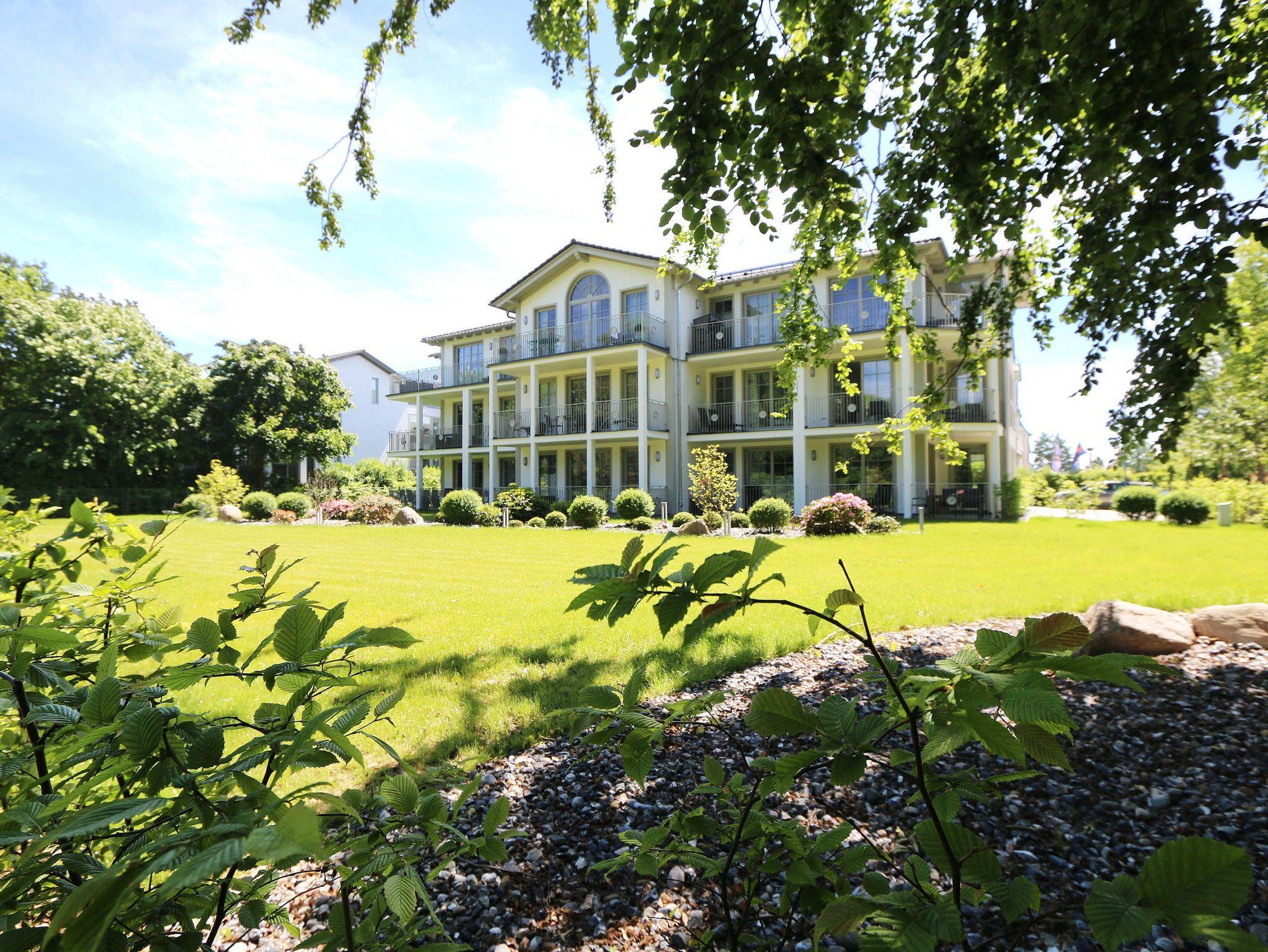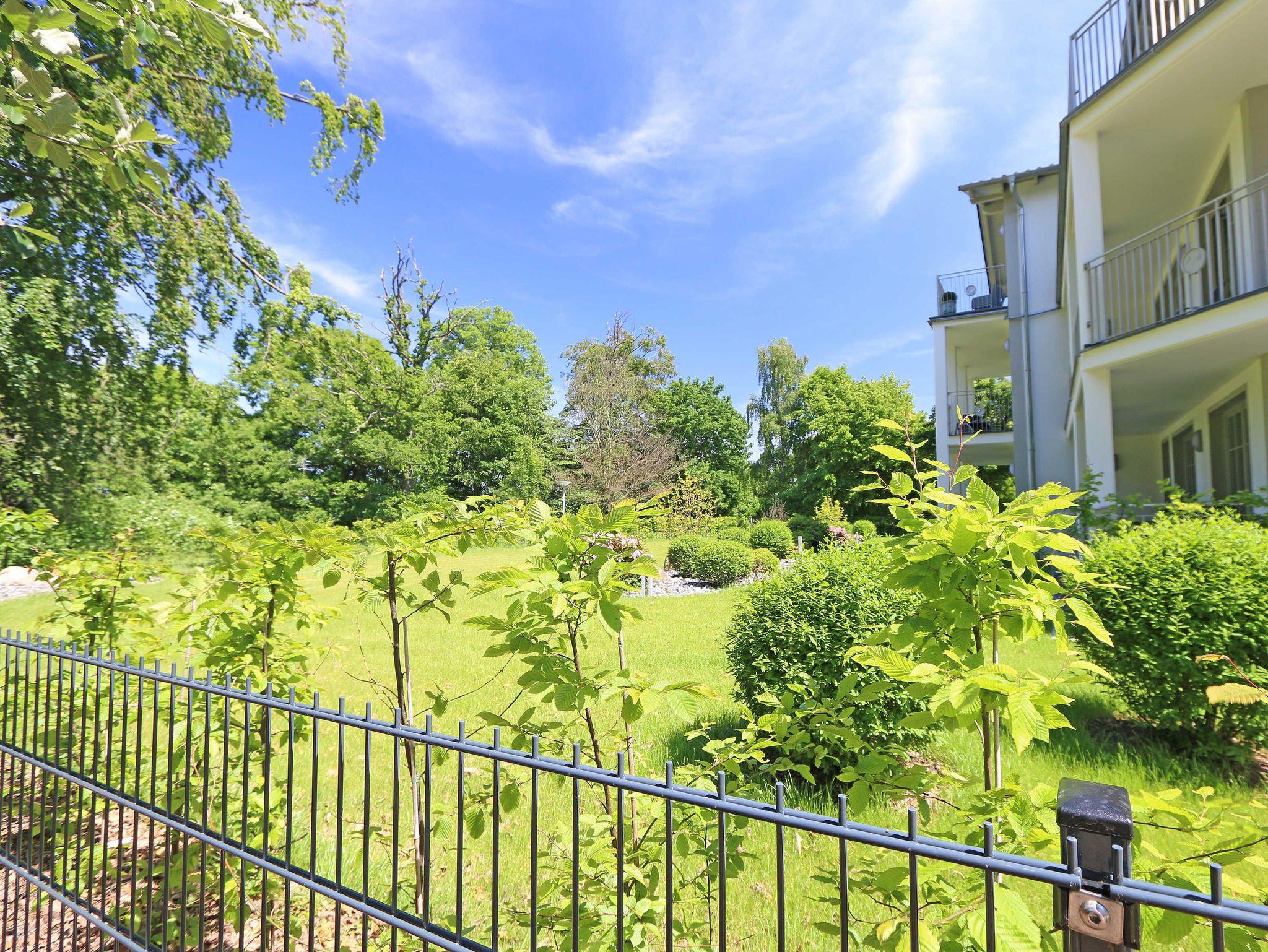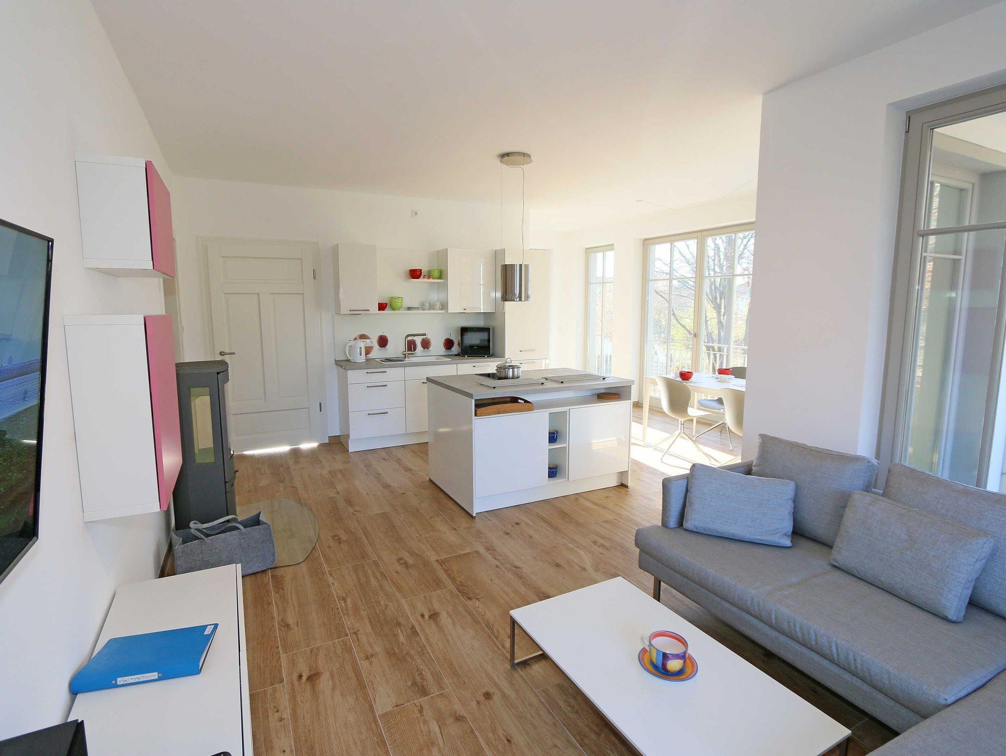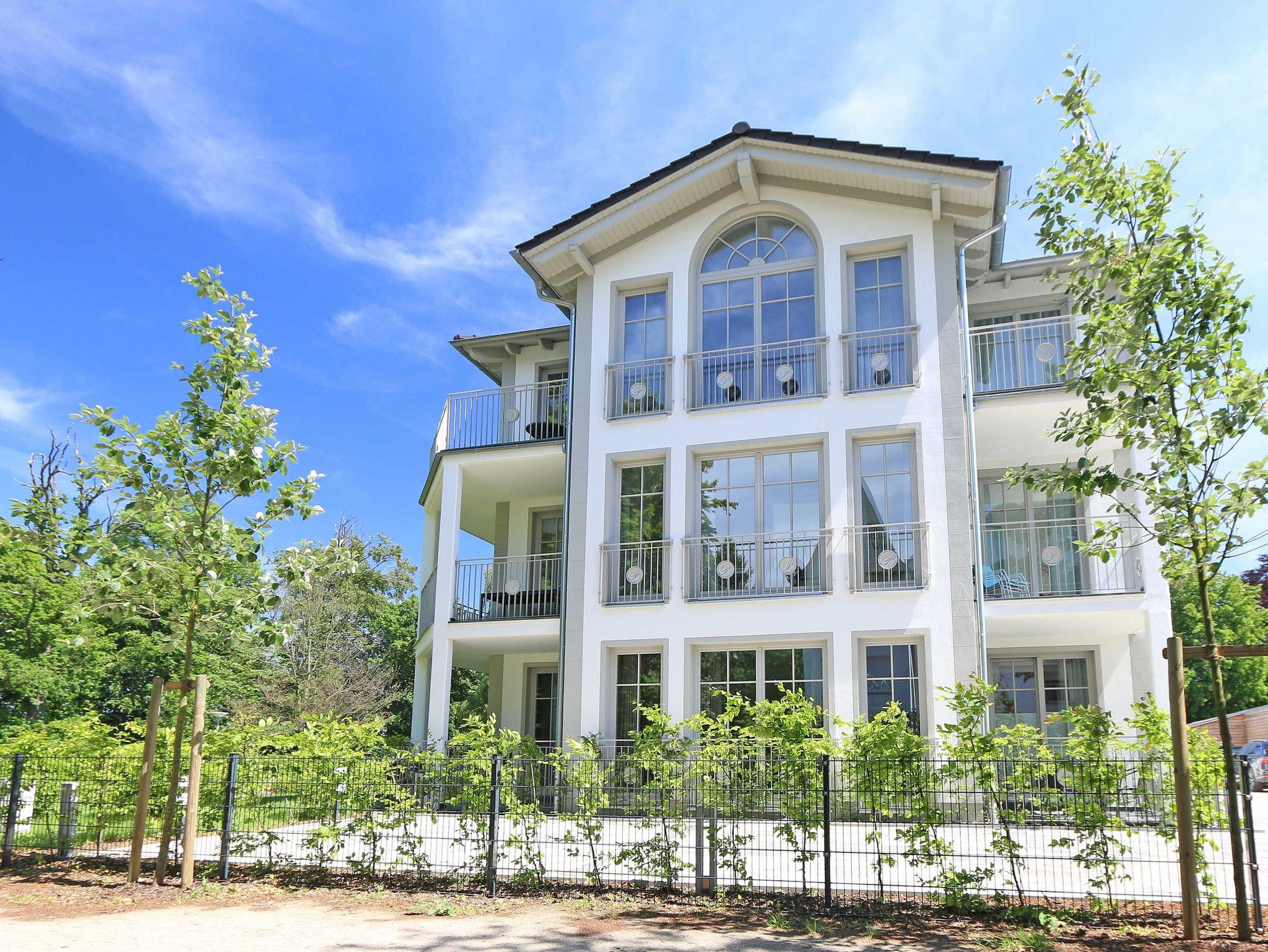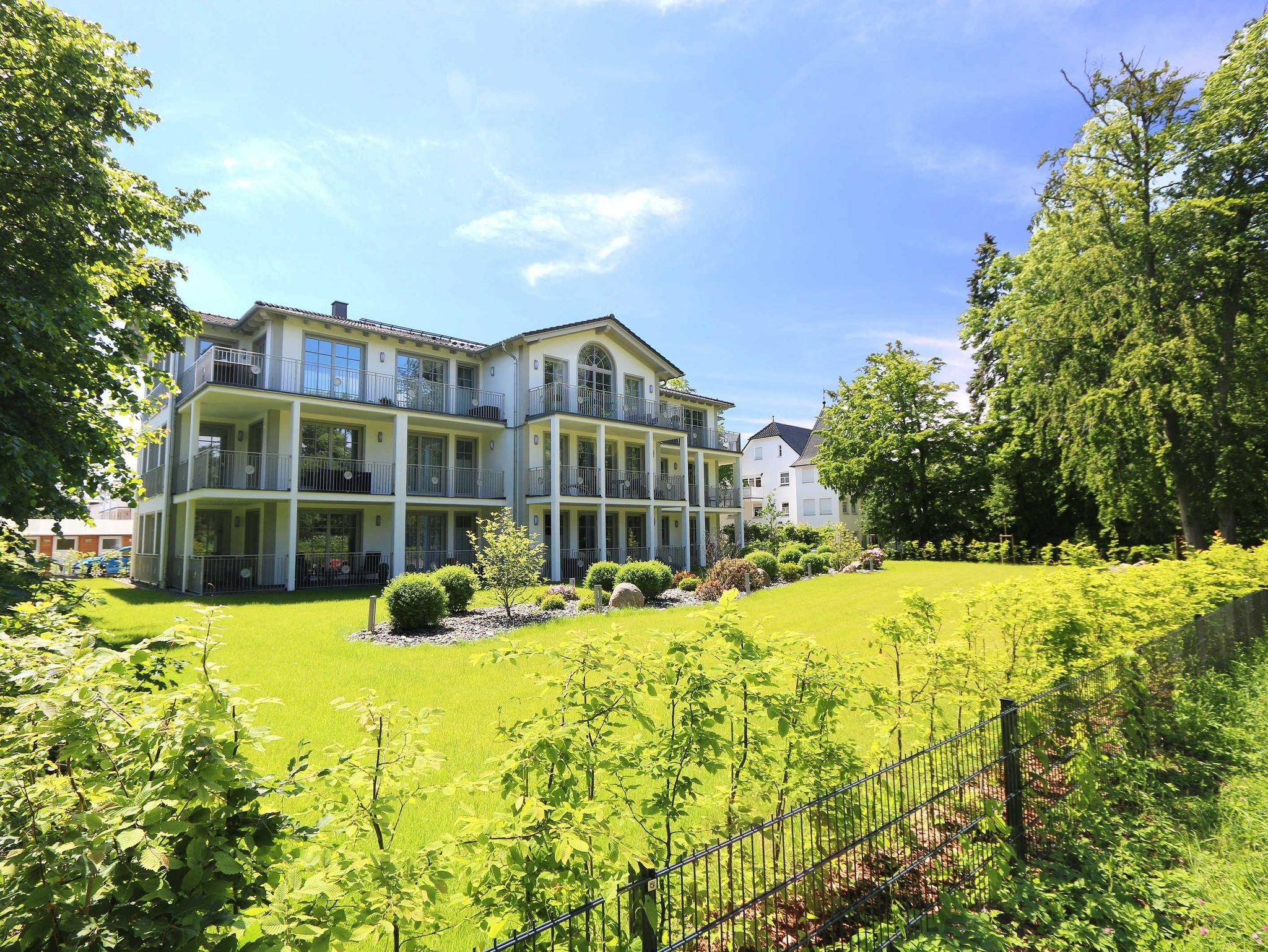 Göhren ist außergewöhnlich: Göhren hat Weitblick, denn es liegt auf einer Anhöhe inmitten eines Naturreservats mit Buchenwäldern am Hochufer, langen weißen Sandstränden, schroffen Steilküsten und der malerischen weiten Landschaft der Halbinsel Mönchgut. Diesen Weitblick fangen die Lage und die Architektur der Villa Pauline auf. Die Villa umfasst 9 Wohnungen auf einem ca. 2000 m² großen Grundstück mit einem exklusiven Garten. Sie liegt in einer exponierten und ruhigen Hochuferlage, als letztes Haus einer Stichstraße. Die Wohnung 5 im Obergeschoss ist über den Fahrstuhl erreichbar. Sie verfügt in allen Zimmern und Bädern über große bodentiefe Fenster. Licht und Weite werden eingefangen. Von dem großen Nord-West- Balkon und vielen Zimmern blicken Sie direkt auf den Garten und den dahinterliegenden Buchenwald, der im Herbst bunt leuchtet. Im Winter und Frühjahr (mit Glück auch in der übrigen Zeit) ist der Blick frei auf das Meer: Sie hören es rauschen. Der kleinere Süd-West-Balkon lädt zum Sonnen ein. Zum feinen flach abfallenden kilometerlangen Sandstrand gelangen Sie in wenigen Minuten und bei Bedarf ganz bequem über einen gläsernen Fahrstuhl. Die Ortsmitte mit Supermarkt, Sparkasse, Bäcker, kleinen Boutiquen und Restaurants ist in wenigen Metern fußläufig zu erreichen. Wanderwege und Radwege schließen an das Villengrundstück an. Fernbus- und Kleinbahn enden unterhalb des Hochuferwaldes.