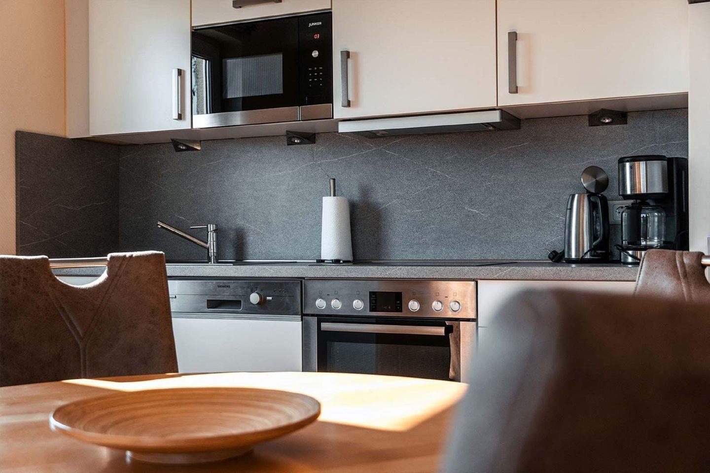 KÜCHE // Küchenzeile, Cerankochfeld (4-Platten), Spülmaschine, Kühlschrank mit Gefrierfach, Backofen, Mikrowelle, Toaster, Wasserkocher, Kaffeemaschine, reichlich Besteck, Geschirr und Küchenutensilien ++