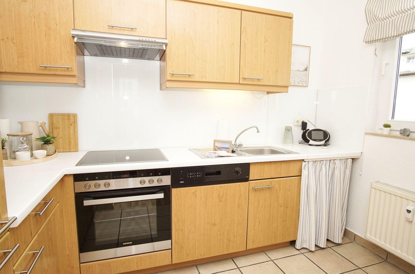 KÜCHE // offene Küche, 4-Platten Herd, Spülmaschine, Kühlschrank mit Gefrierfach, Backofen, Toaster, Wasserkocher, Kaffeemaschine, reichlich Besteck, Geschirr und Küchenutensilien ++