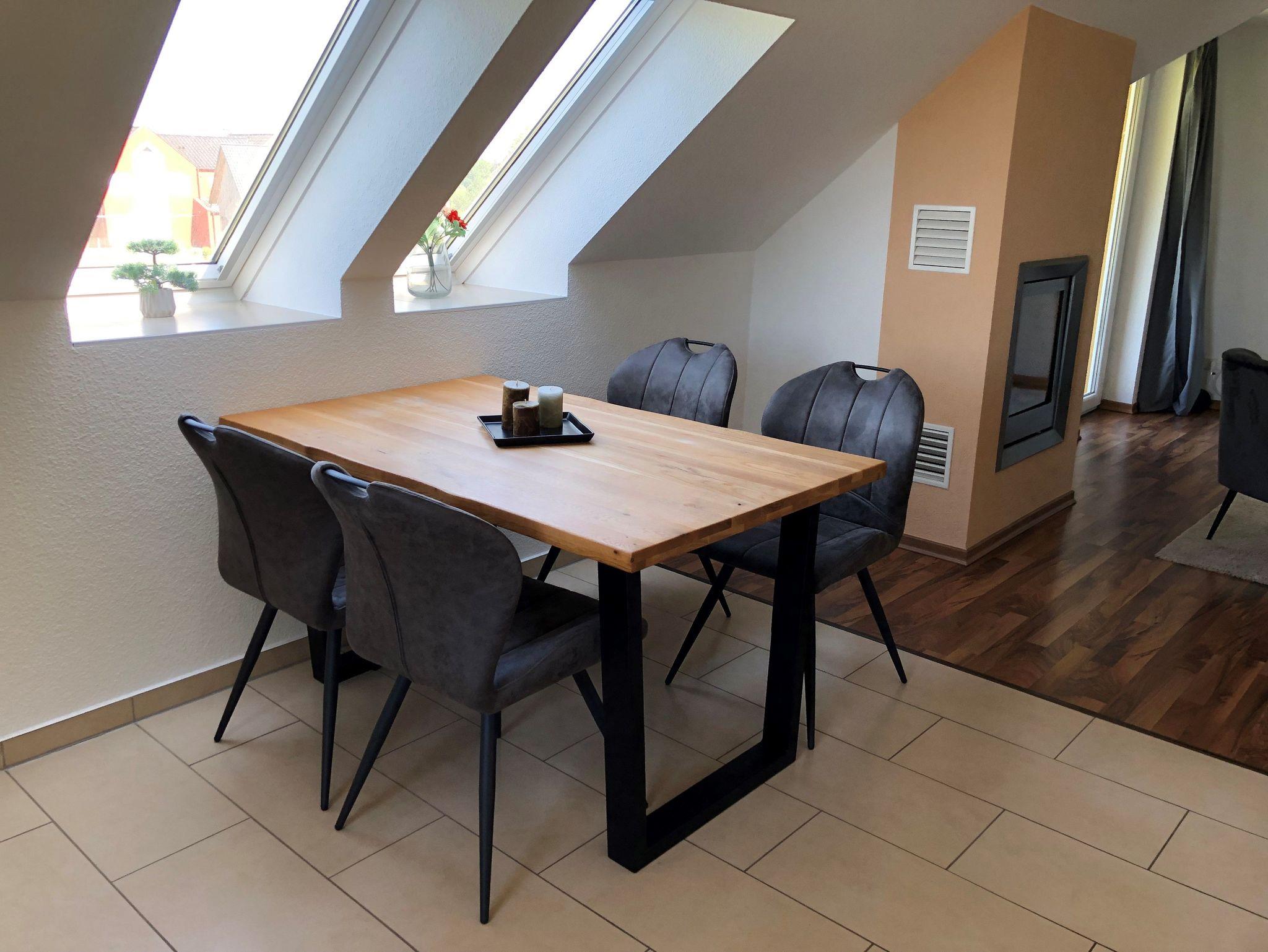 Der Balkon mit Balkonmöbeln lädt dazu ein, die frische Luft zu genießen und gemütliche Stunden im Freien zu verbringen.