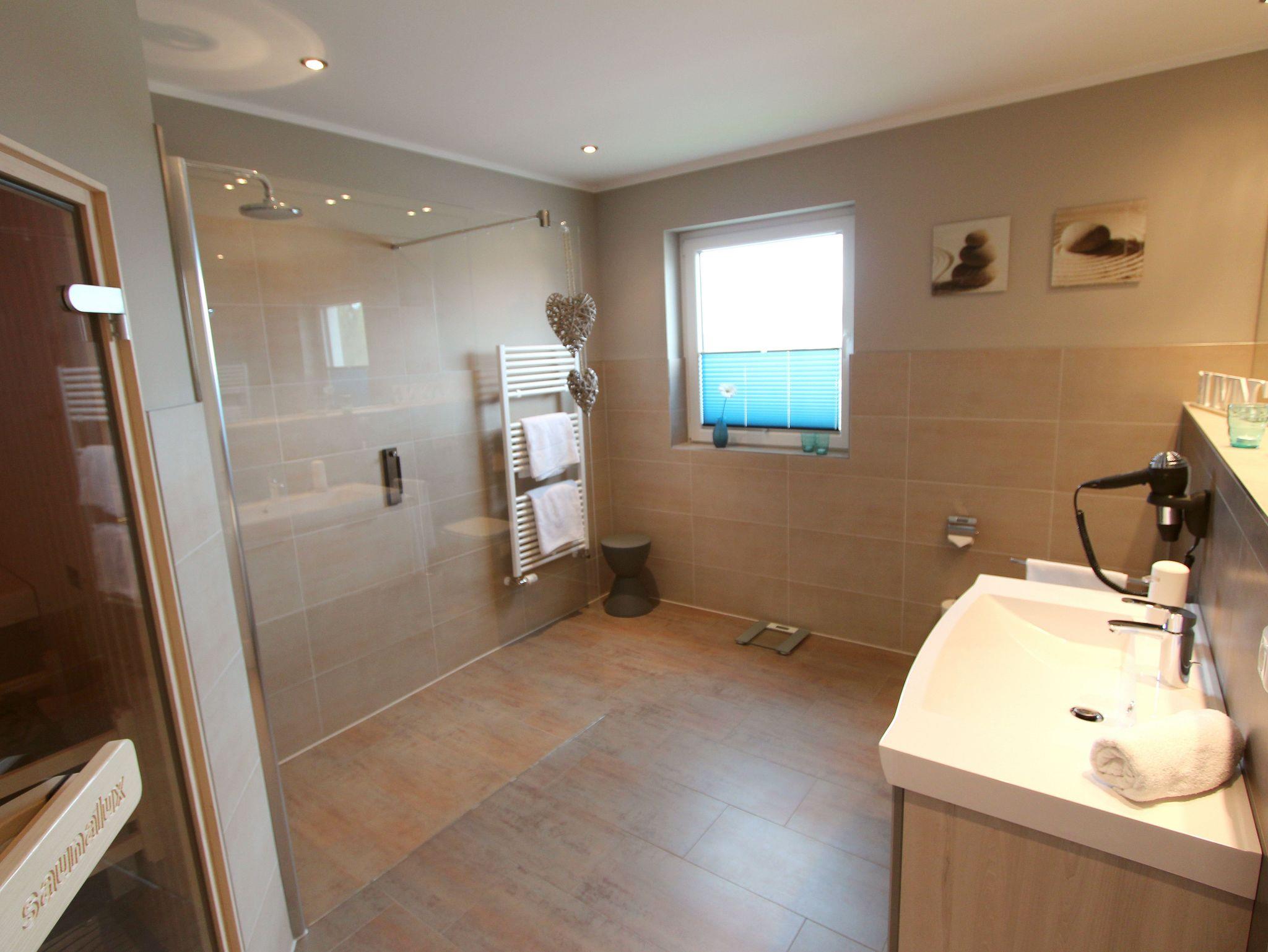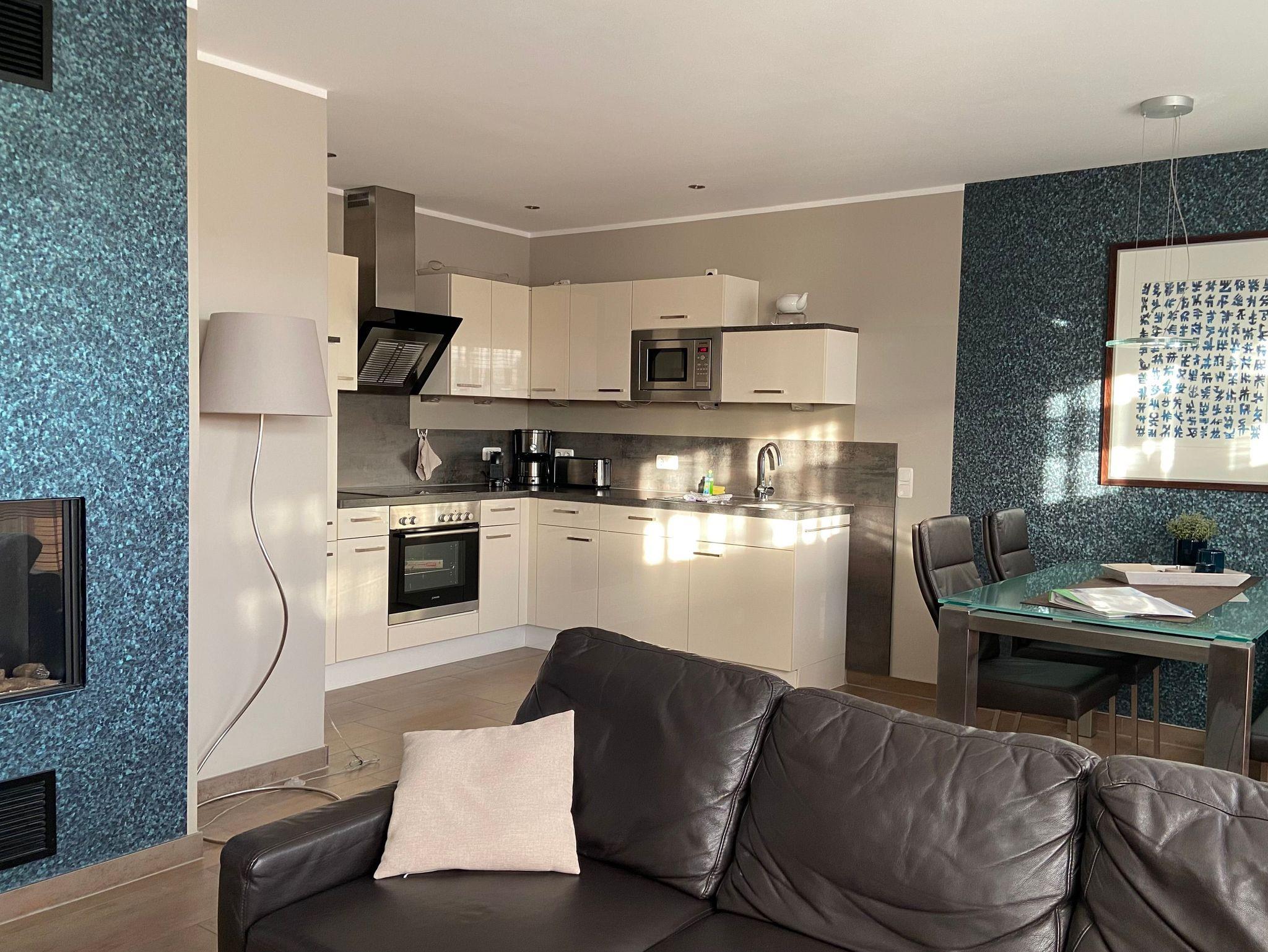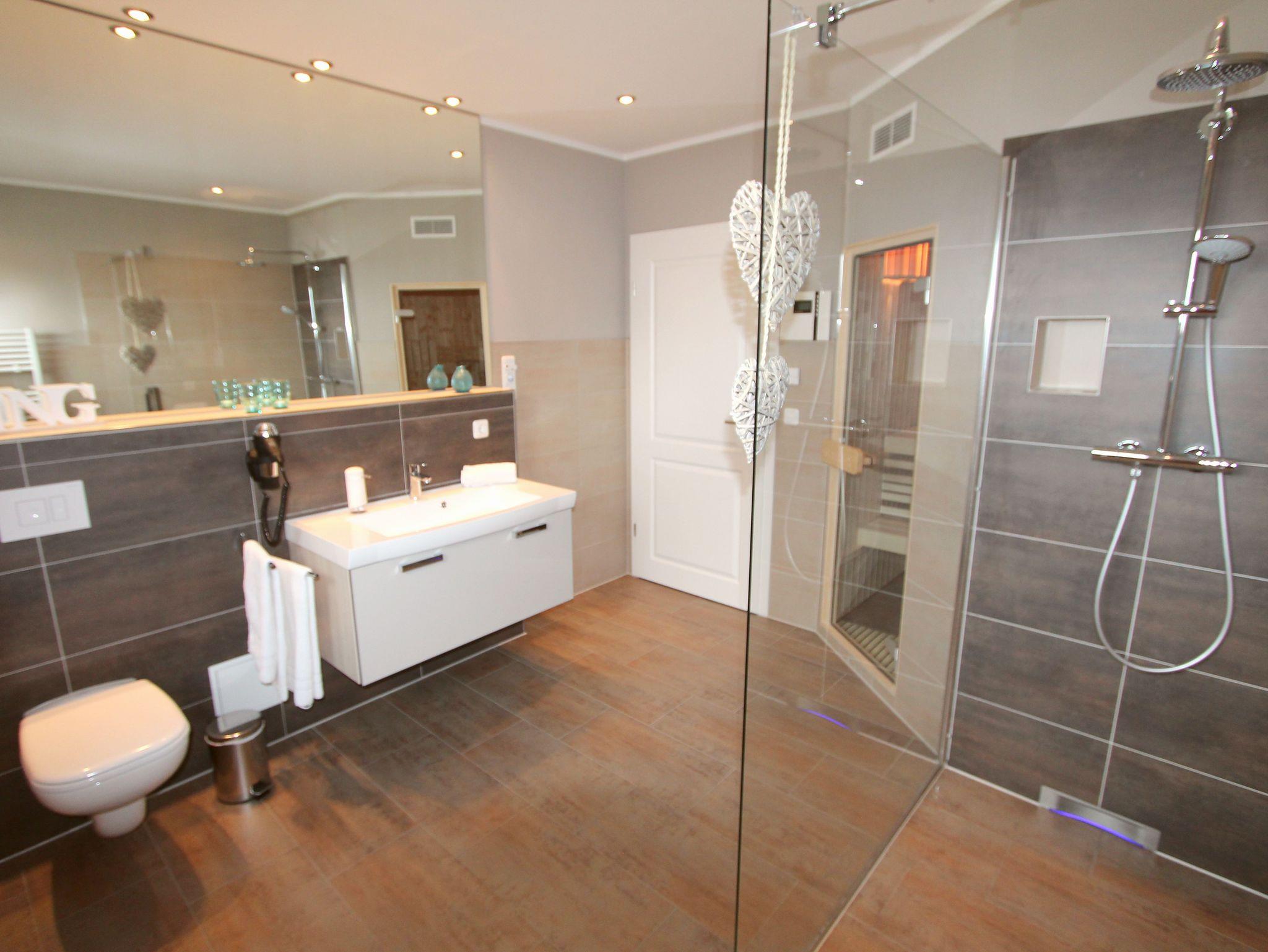 Mit 100m² Wohnfläche bietet diese Ferienwohnung viel Raum für Erholung und Entspannung. Die beiden Schlafzimmer sind liebevoll gestaltet und laden zum Träumen ein. Eines der beiden Badezimmer verwöhnt Sie mit einer Sauna, in der Sie sich herrlich entspannen können. Der großzügige Wohn- und Essbereich verfügt über einen gemütlichen Gas-Kamin, der für eine behagliche Atmosphäre sorgt. Die offene Küche ist voll ausgestattet und ermöglicht es Ihnen, kulinarische Köstlichkeiten zu zaubern.