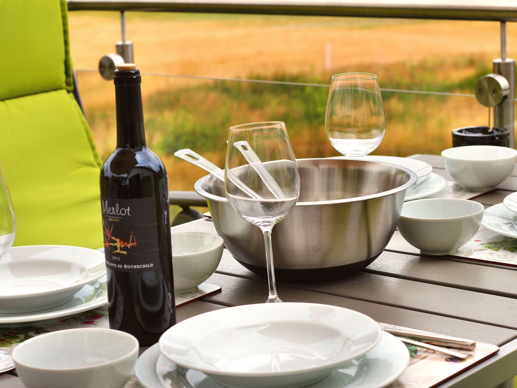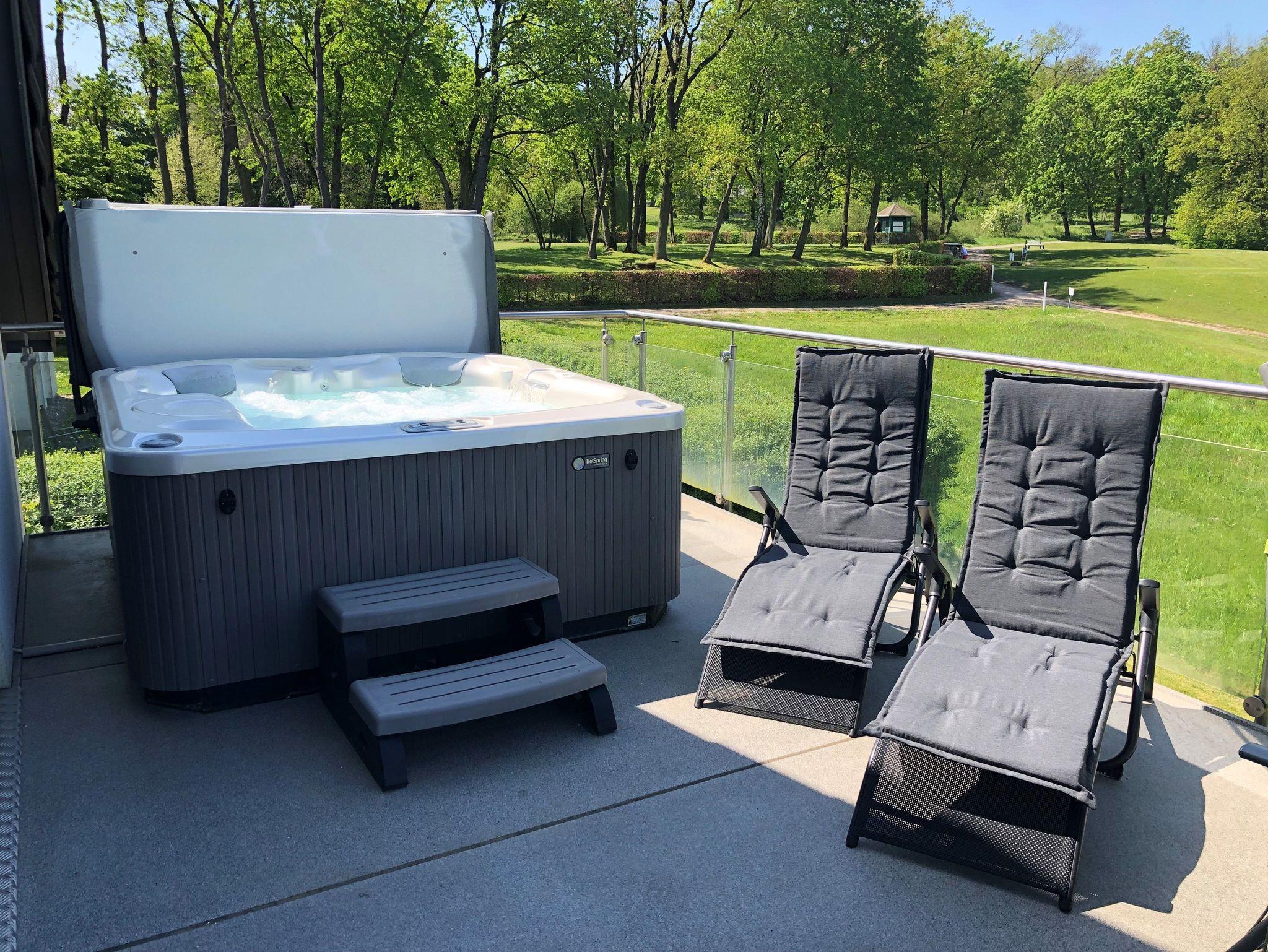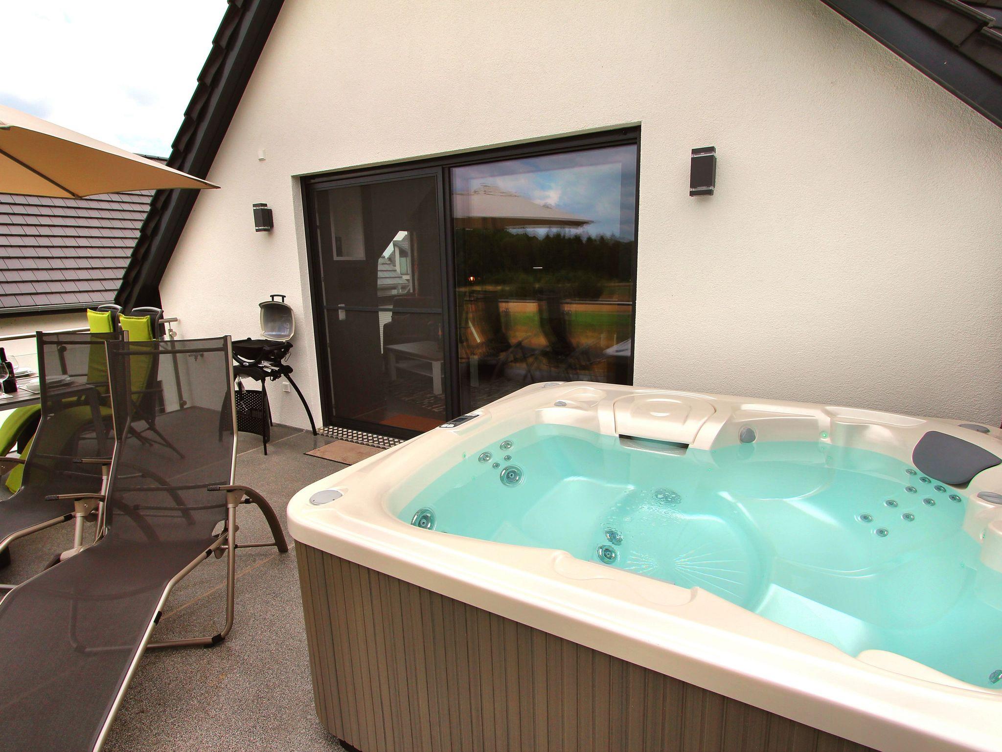 Genießen Sie die frische Luft auf dem Balkon und lassen Sie den Blick über die Umgebung schweifen. Hier erwartet Sie zudem ein Außen Whirlpool, der Ihnen wohltuende Entspannung und Luxus beschert.