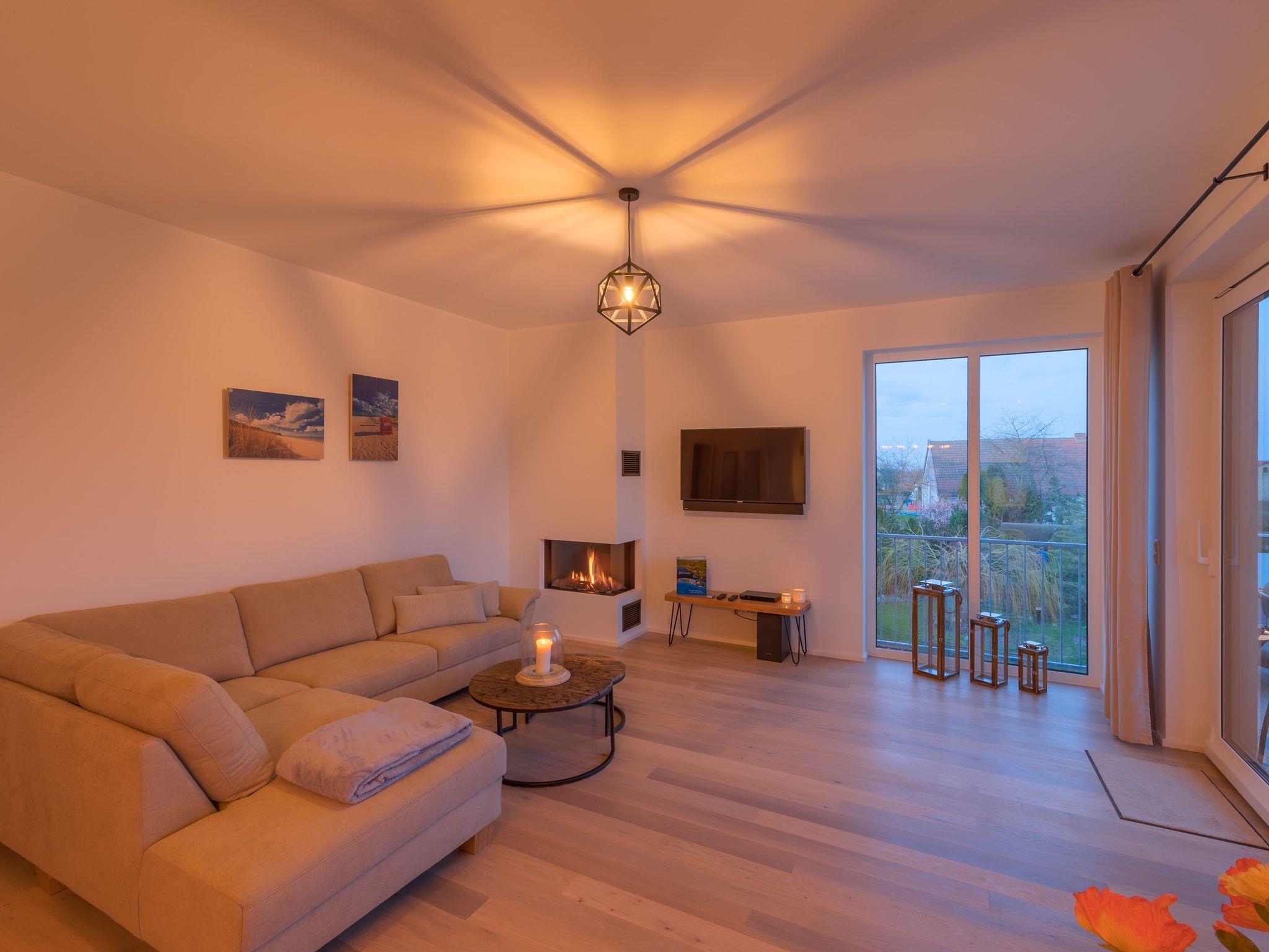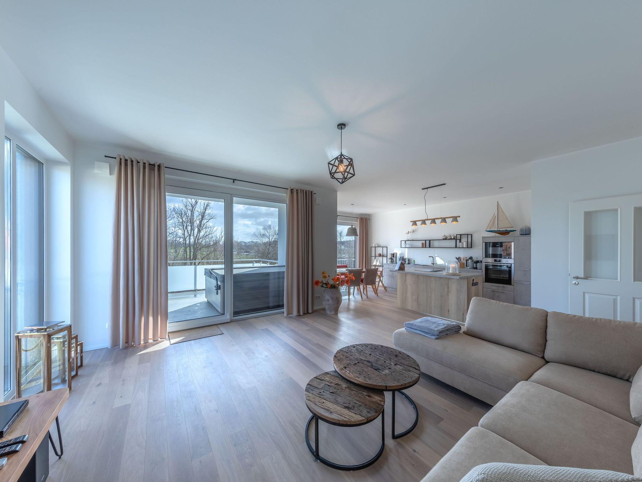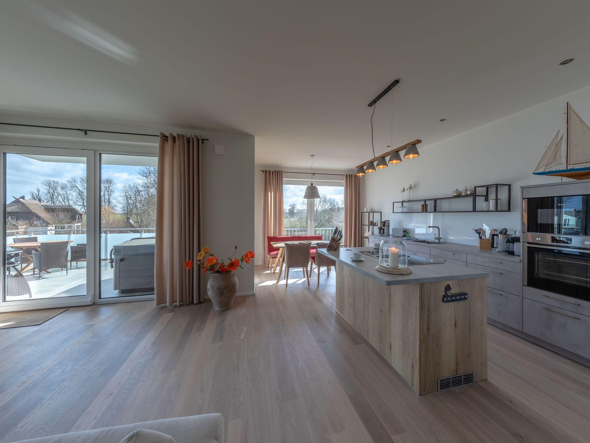 Die großzügige und exklusive Ferienwohnung bietet Ihnen 125 m² Wohnfläche, die durch einen offenen Wohn- und Essbereich mit einem gemütlichen Gas-Kamin geprägt ist. Hier können Sie gemütliche Abende verbringen und die wohlige Wärme genießen. Die zwei Schlafzimmer sind stilvoll eingerichtet und laden zum Träumen und Erholen ein. Für noch mehr Komfort stehen Ihnen zwei Badezimmer zur Verfügung, beide mit bodengleichen Duschen ausgestattet. Eines der Badezimmer verwöhnt Sie zudem mit einer Sauna, in der Sie sich herrlich entspannen können.
