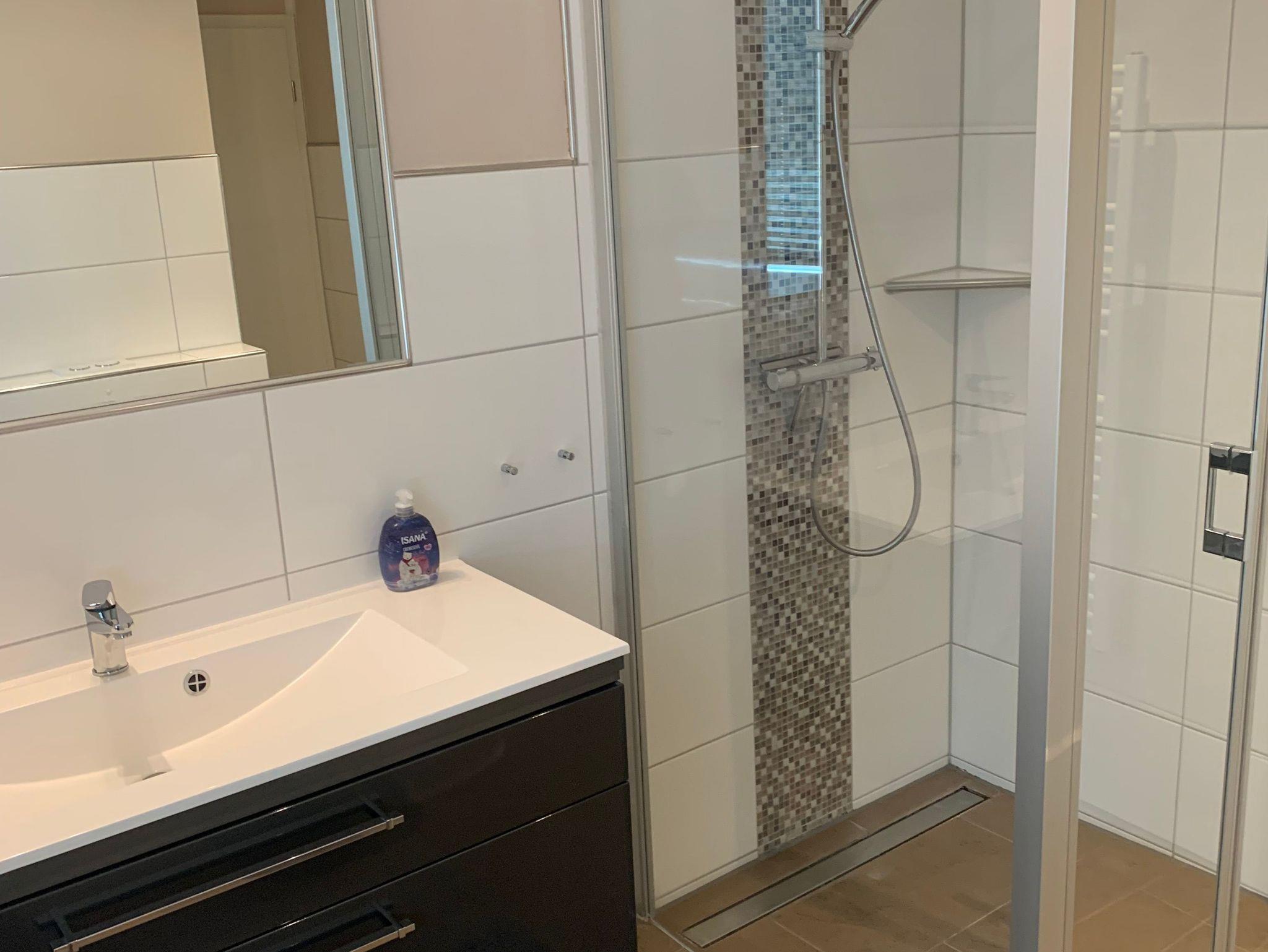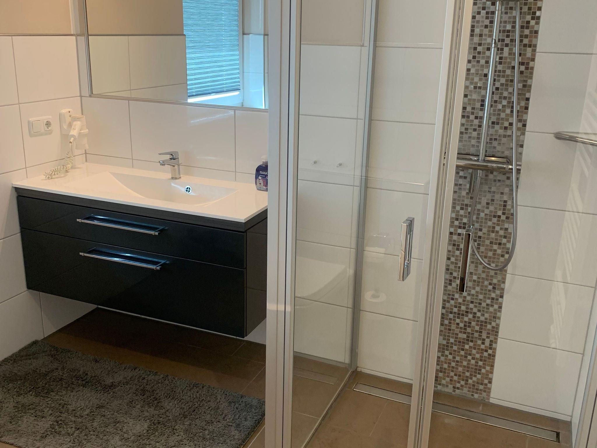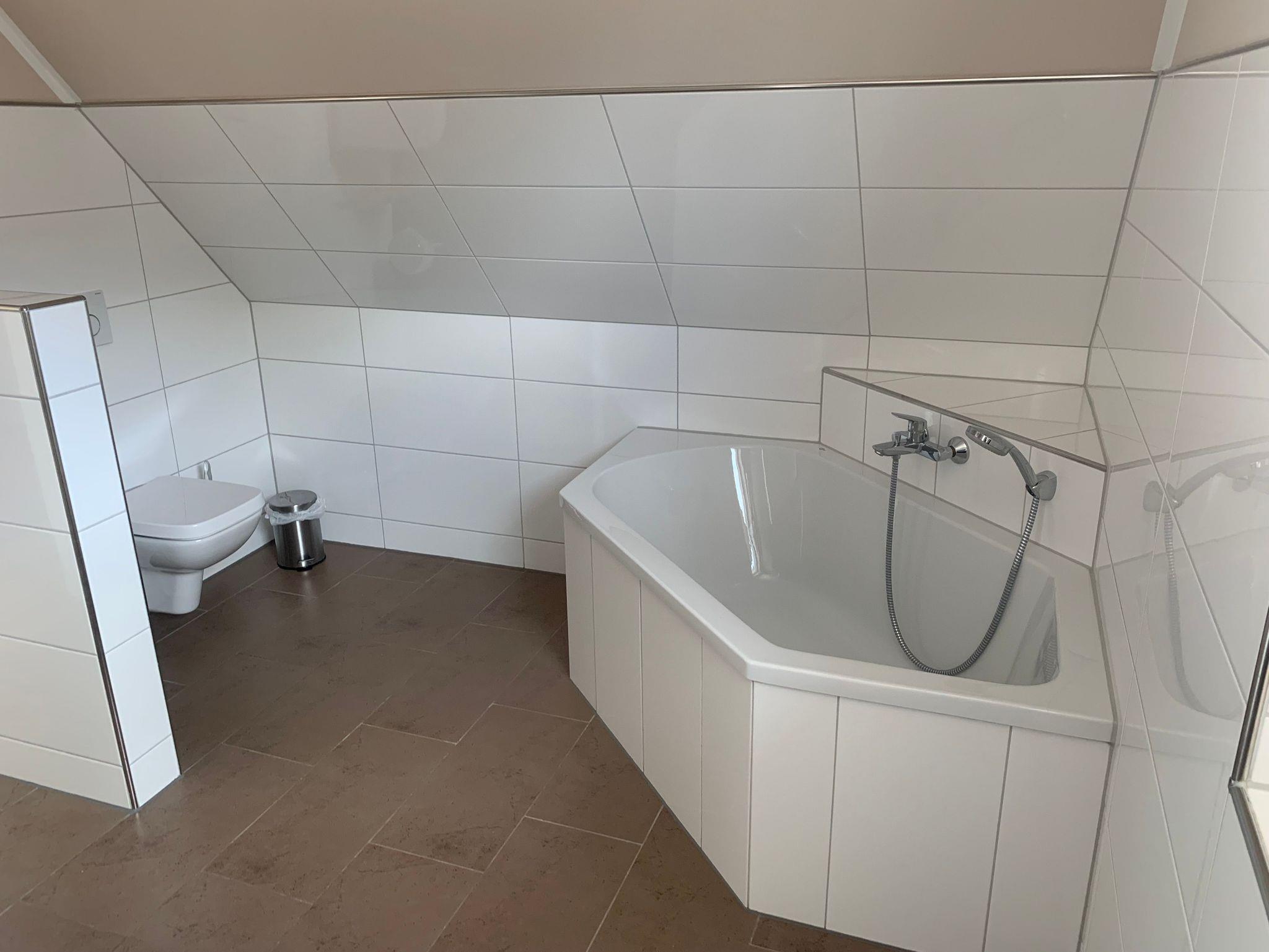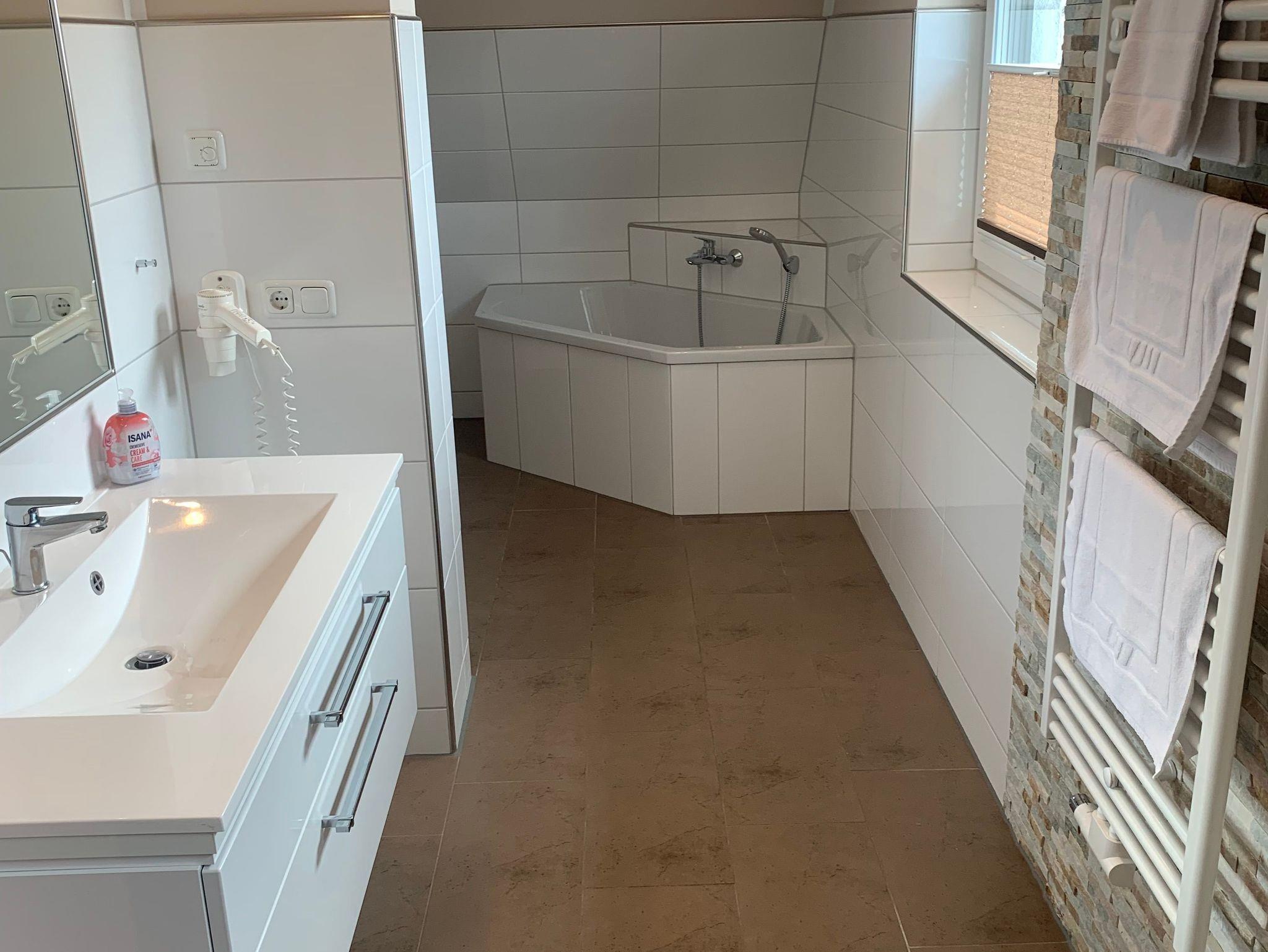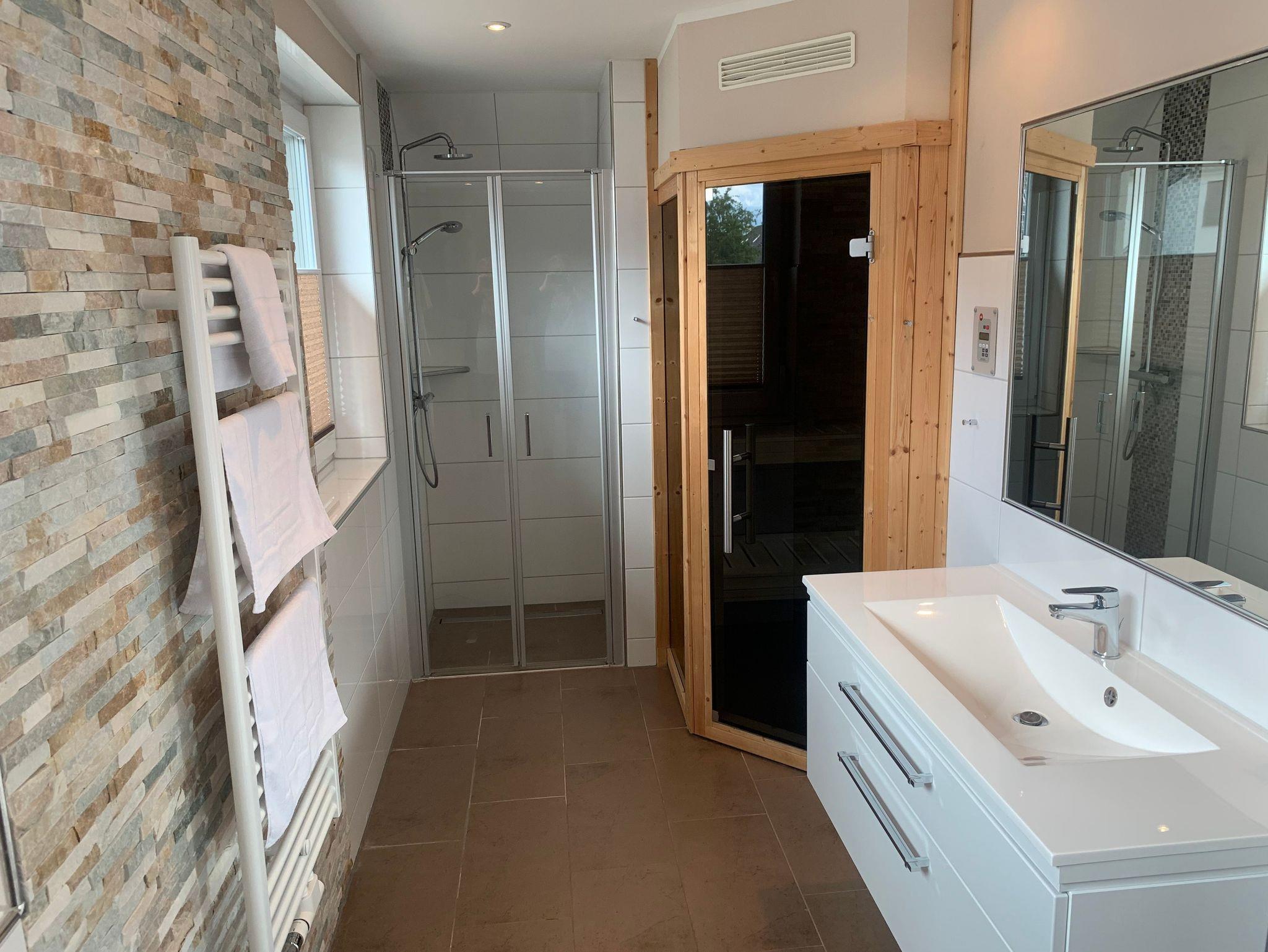 Die Bäder bieten moderne Waschtische und Raindanceduschen. Das große Bad verfügt zusätzlich über eine Badewanne und einer Sauna. Alle Räume werden über eine Fussbodenheizung beheizt..