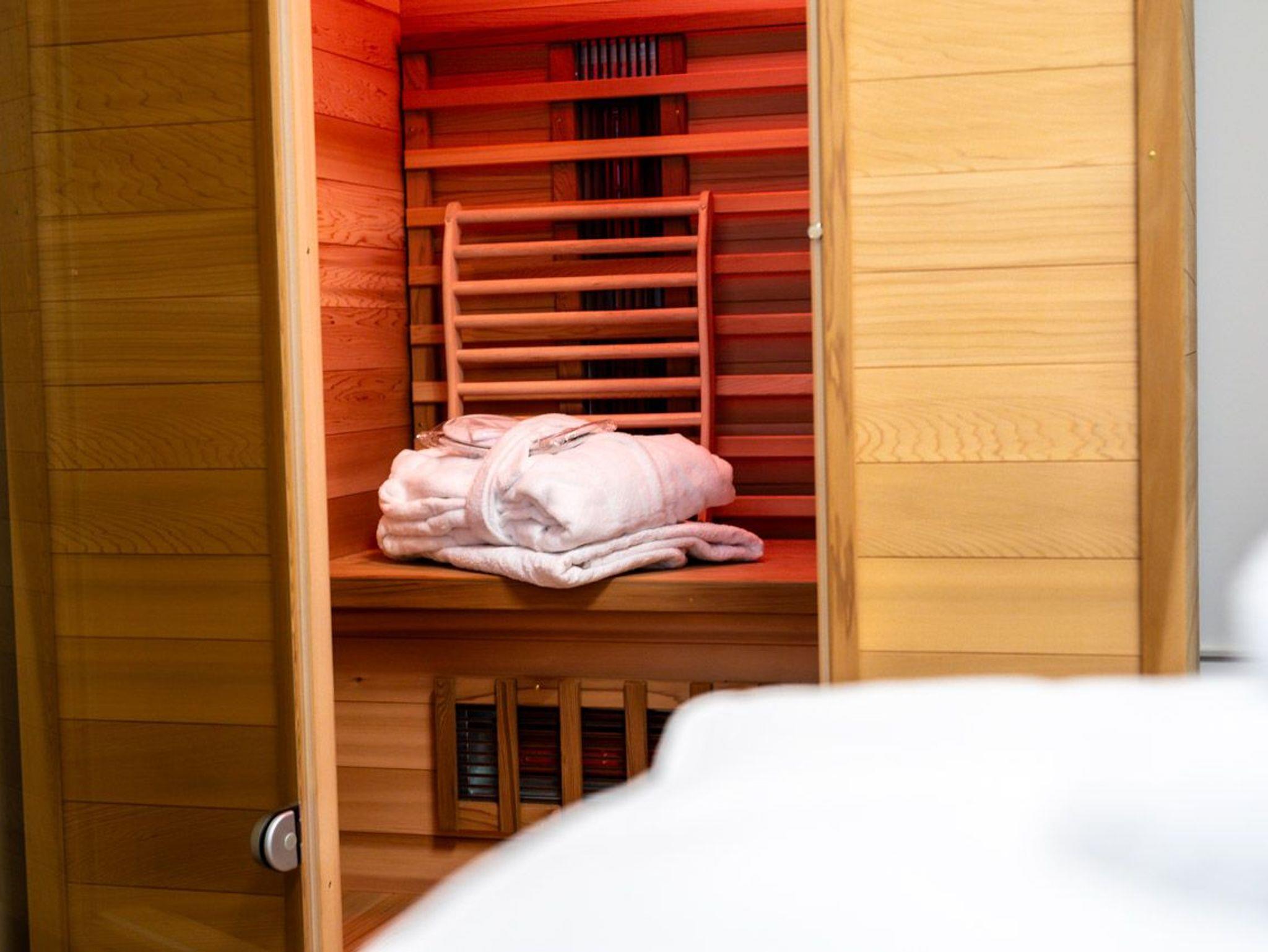 Diese Wohnung ist nicht nur gemütlich, sondern bietet auch zahlreiche Annehmlichkeiten für einen entspannten Aufenthalt. Die offene Küche ist funktional ausgestattet und bietet alles, was Sie für die Zubereitung köstlicher Speisen benötigen. Das Schlafzimmer mit einer Infrarot-Sauna ist ein perfekter Ort, um sich nach einem erlebnisreichen Tag zu entspannen. Das angrenzende Badezimmer mit Dusche sorgt für Komfort und Wohlbefinden. Der offene Wohn- und Essbereich schafft einen einladenden Raum.