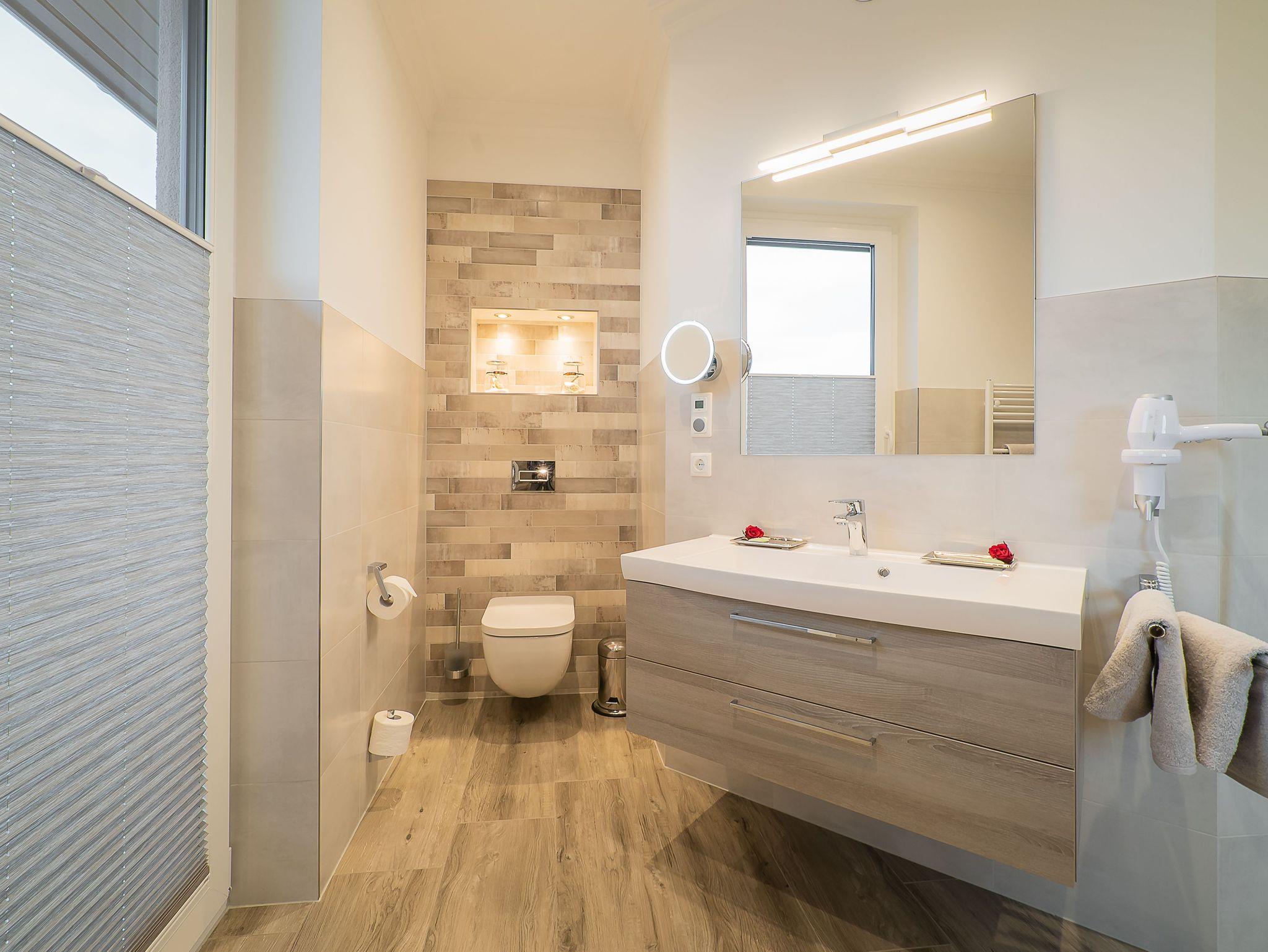 Das Tageslichtbad mit Spa-Charakter verfügt über eine verglaste Sauna, Raindance-Dusche und hochwertige Ausstattung. Eine umlaufende Sonnen-Dachterrasse bietet Outdoormöbel und einen Original Sylter Strandkorb sowie einen Weber Elektrogrill.