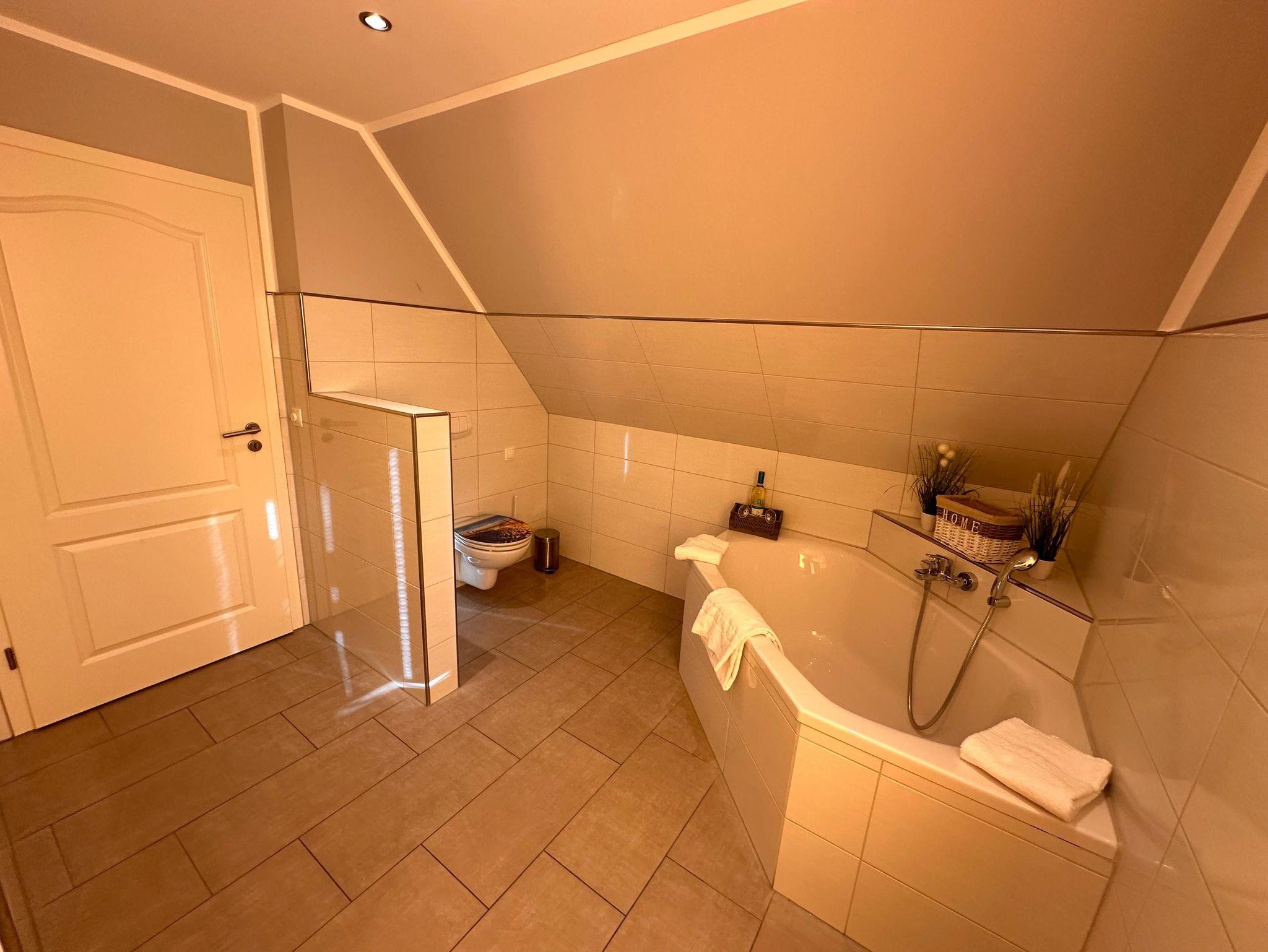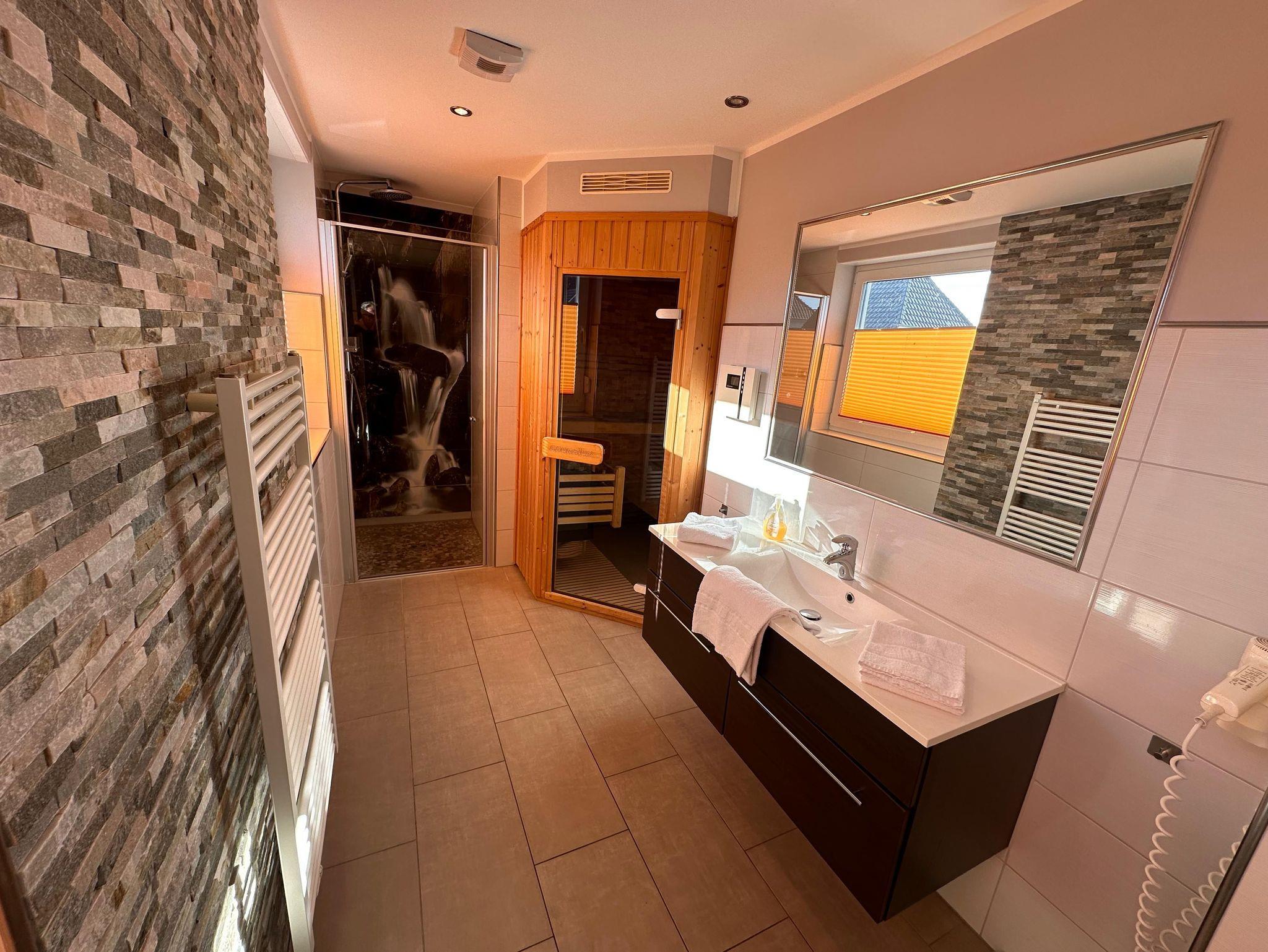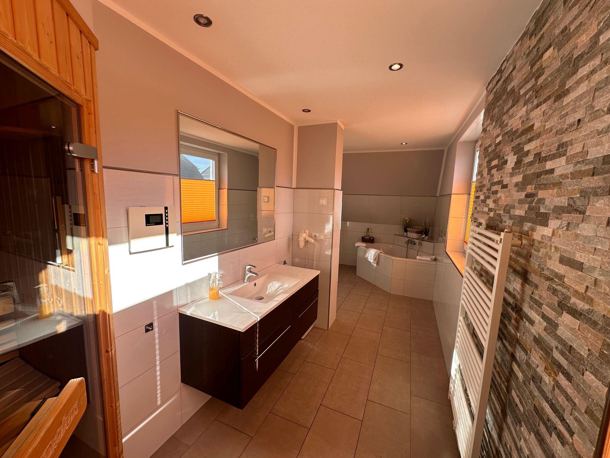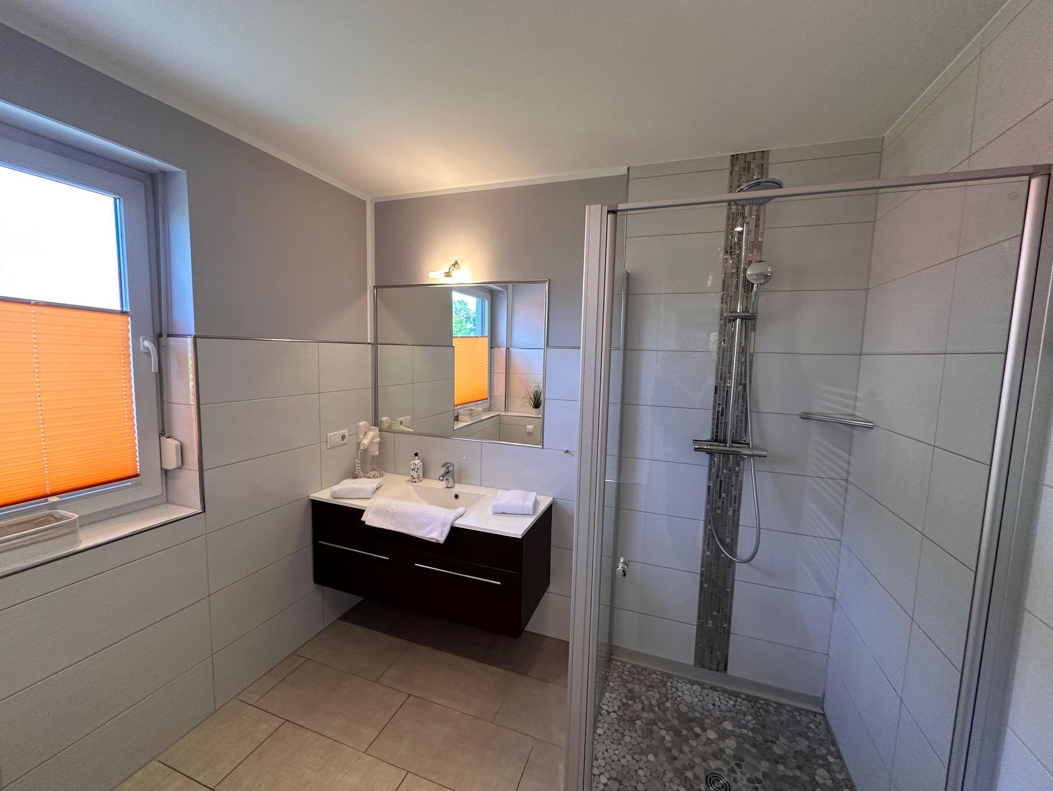 Die Bäder bieten moderne Waschtische und Raindance-Duschen. Das große Bad im OG verfügt zusätzlich über