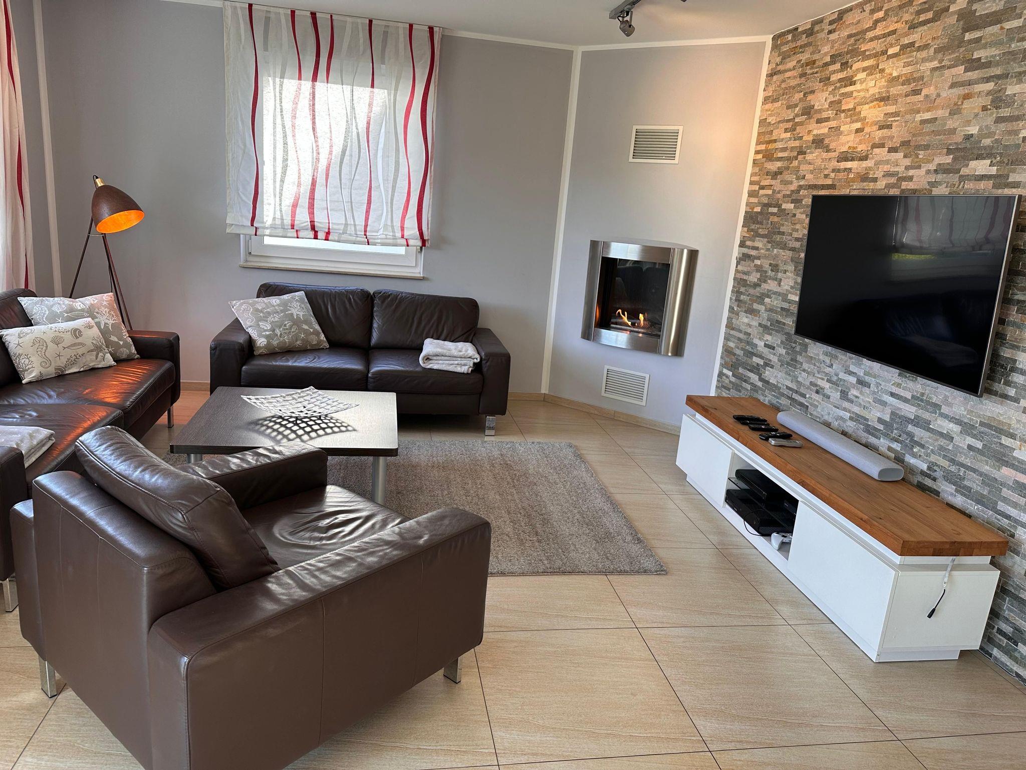 Lässig auf dem Sofa liegend, kann man komplett entspannen mit Musik oder Sky TV und einem Gaskamin.