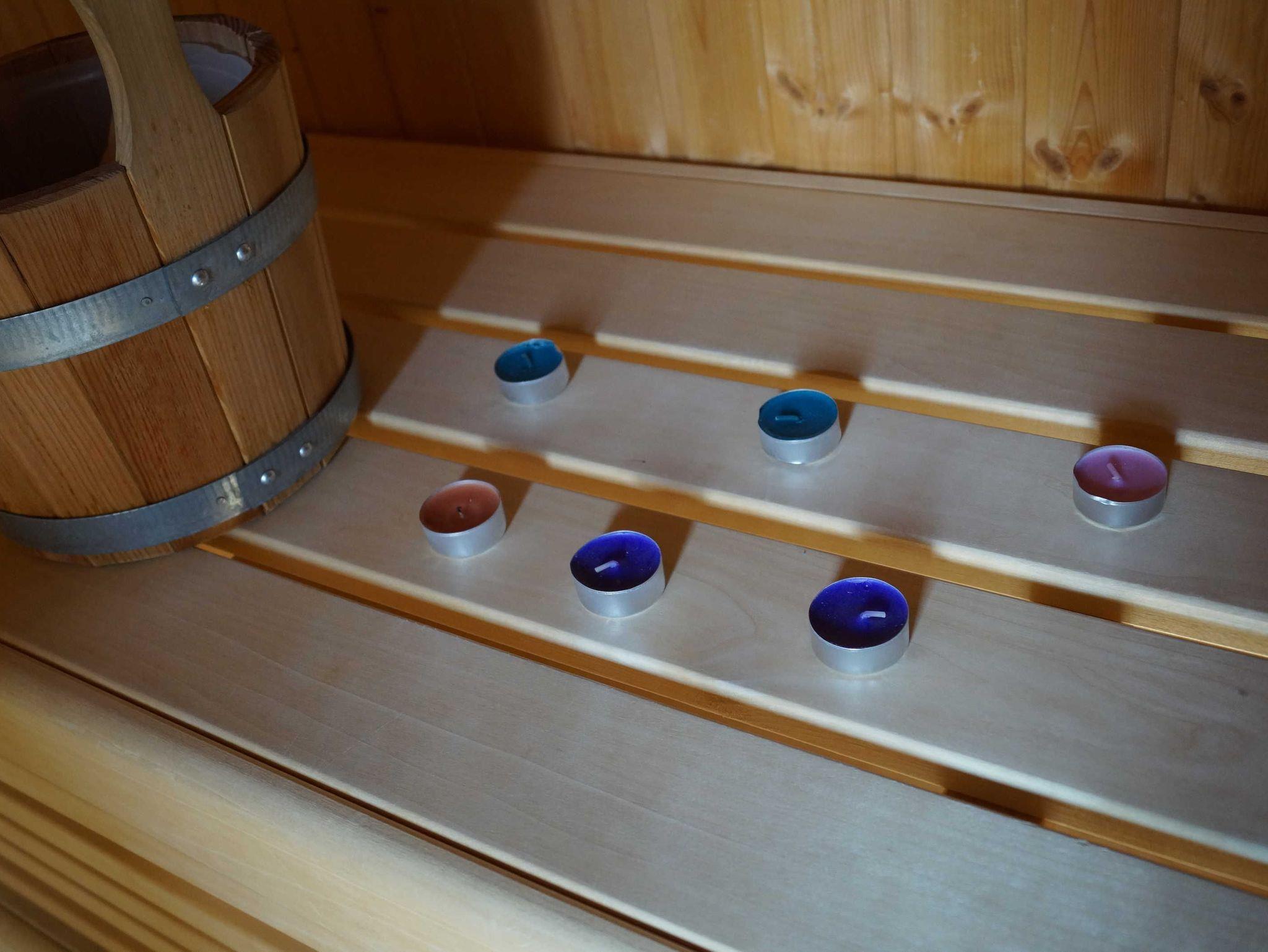 eine Badewanne und über eine Sauna. Alle Räume werden über eine Fußbodenheizung beheizt.