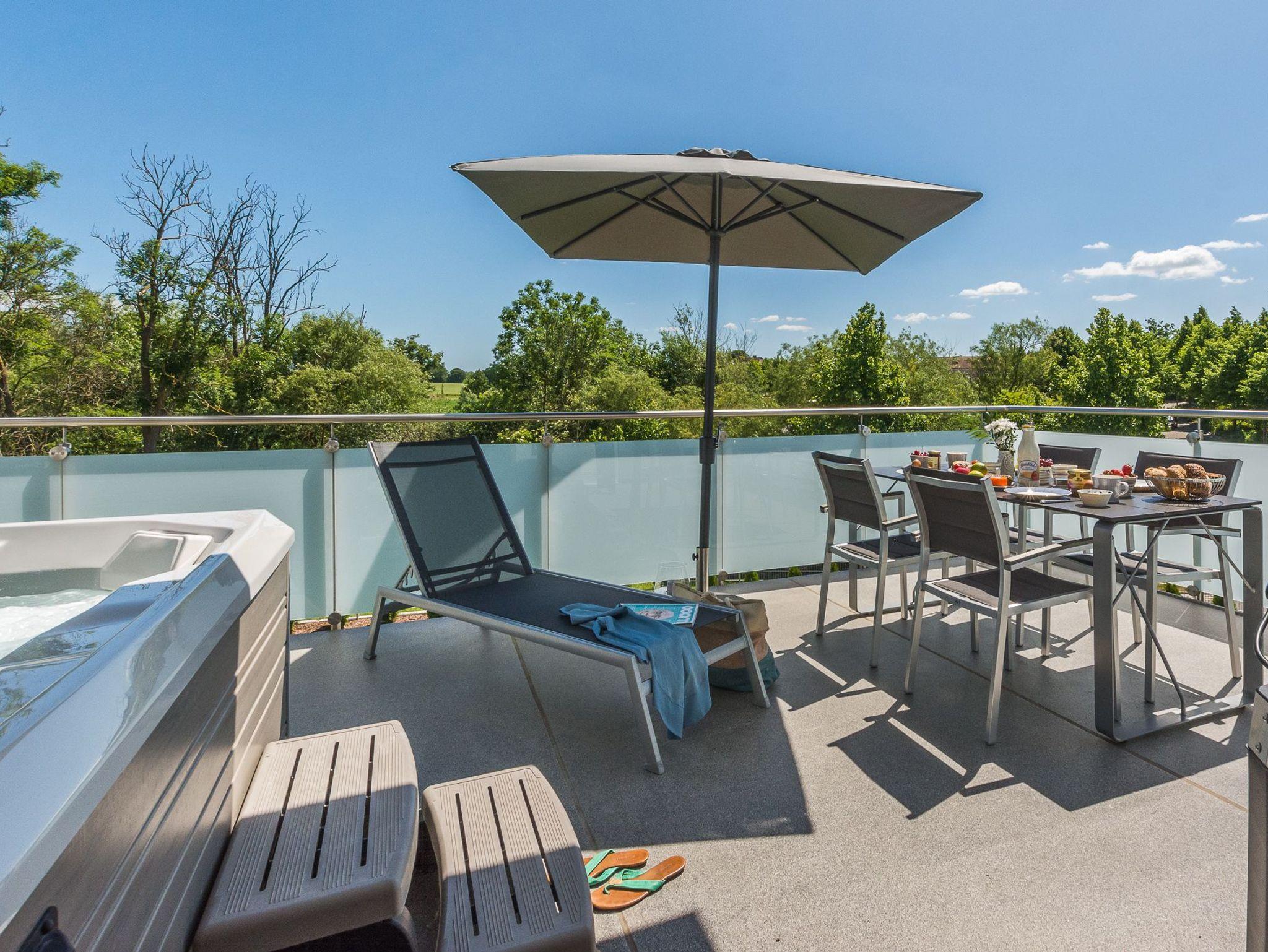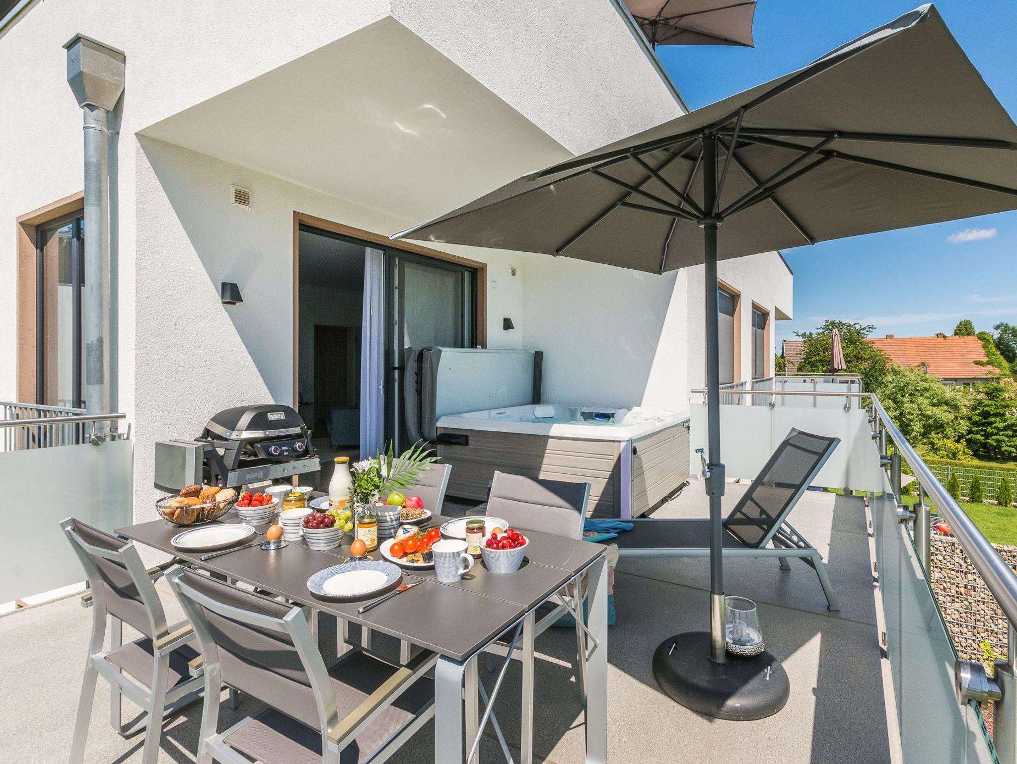 Genießen Sie die frische Meeresbrise auf dem großen Balkon und erleben Sie die Schönheit der Umgebung. Hier erwartet Sie zudem ein Außen Whirlpool, der Ihnen wohltuende Entspannung und luxuriöse Momente bietet.
