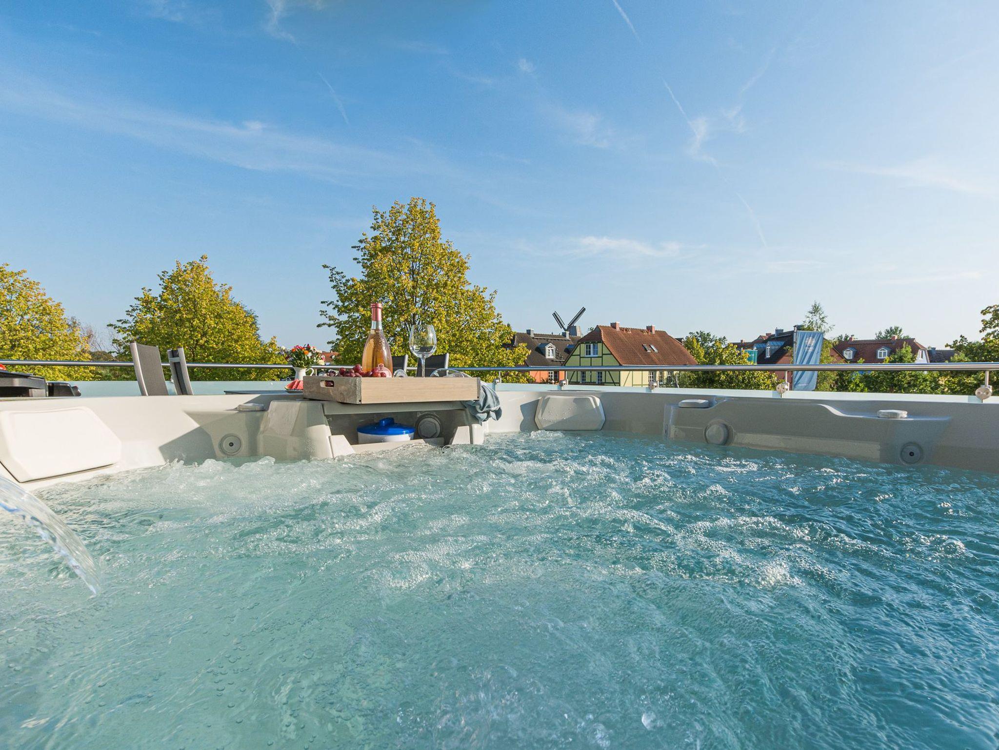 Ein absolutes Highlight ist der große Balkon, auf dem Sie den Blick auf die Umgebung genießen können. Hier erwartet Sie zudem ein Außen Whirlpool, in dem Sie sich bei sprudelndem Luxus entspannen können.