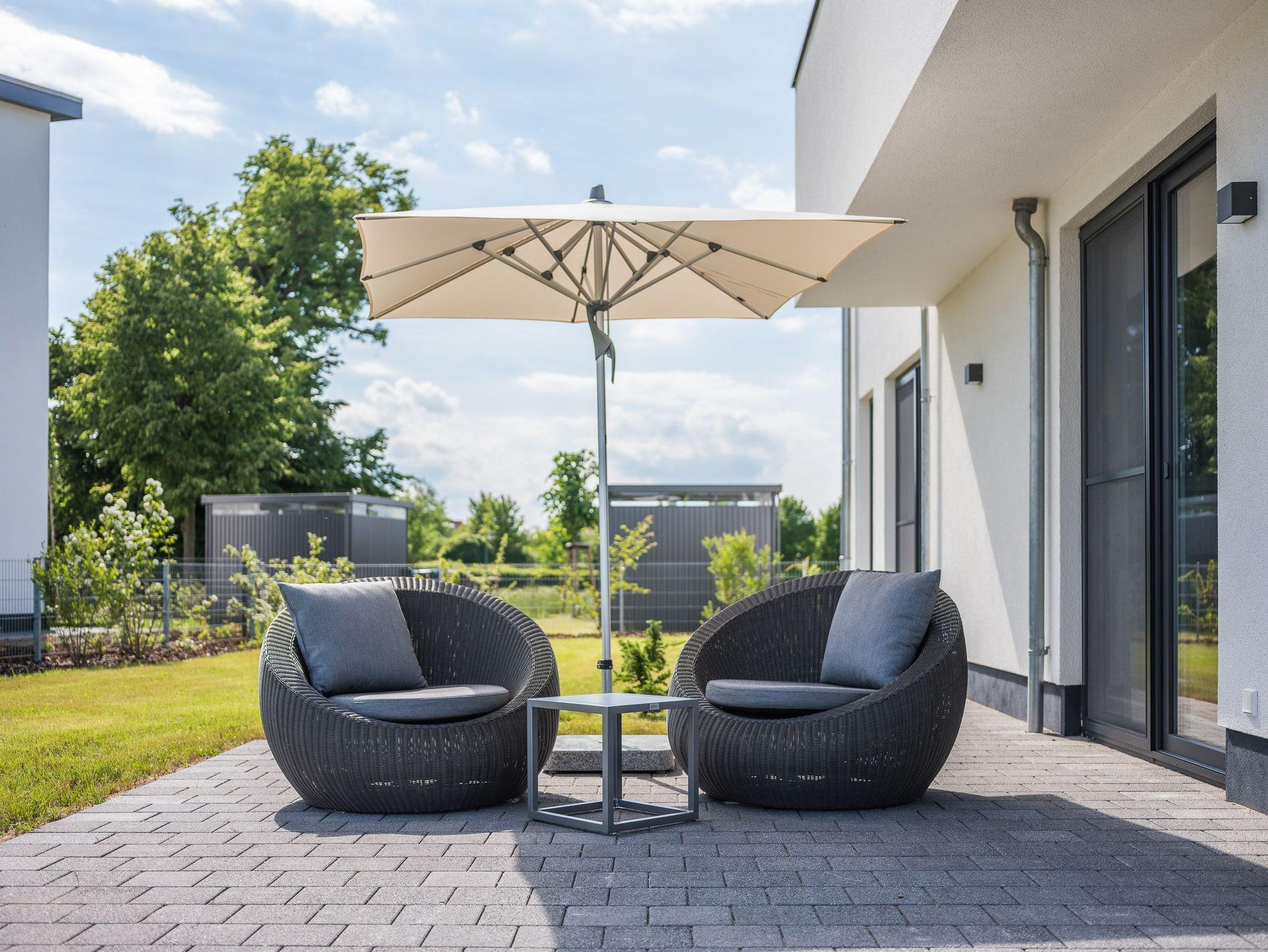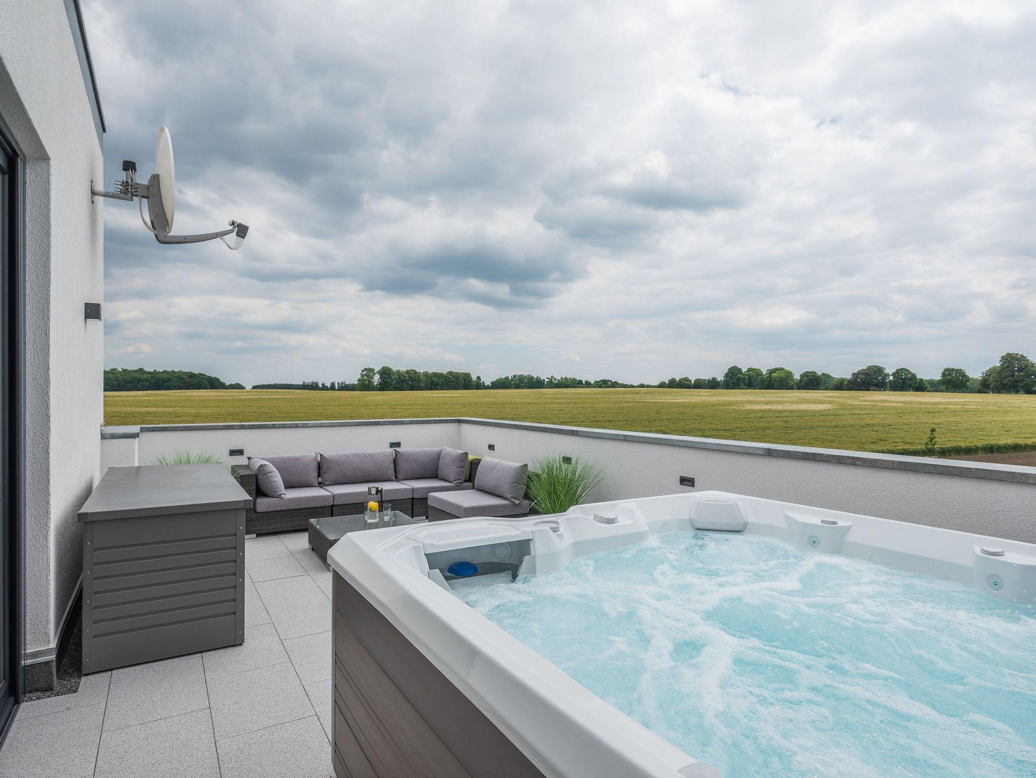 Der Außen Whirlpool auf dem Balkon mit Sitzecke ermöglicht Ihnen entspannte Stunden mit Blick auf die umliegenden Wiesen und Felder. Ebenso der große, eingezäunte Garten der zu direkt gemütlichen Grillabenden mit Freunden und Familie einlädt.