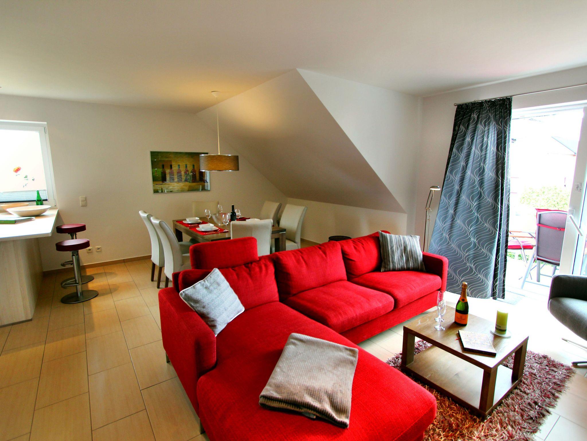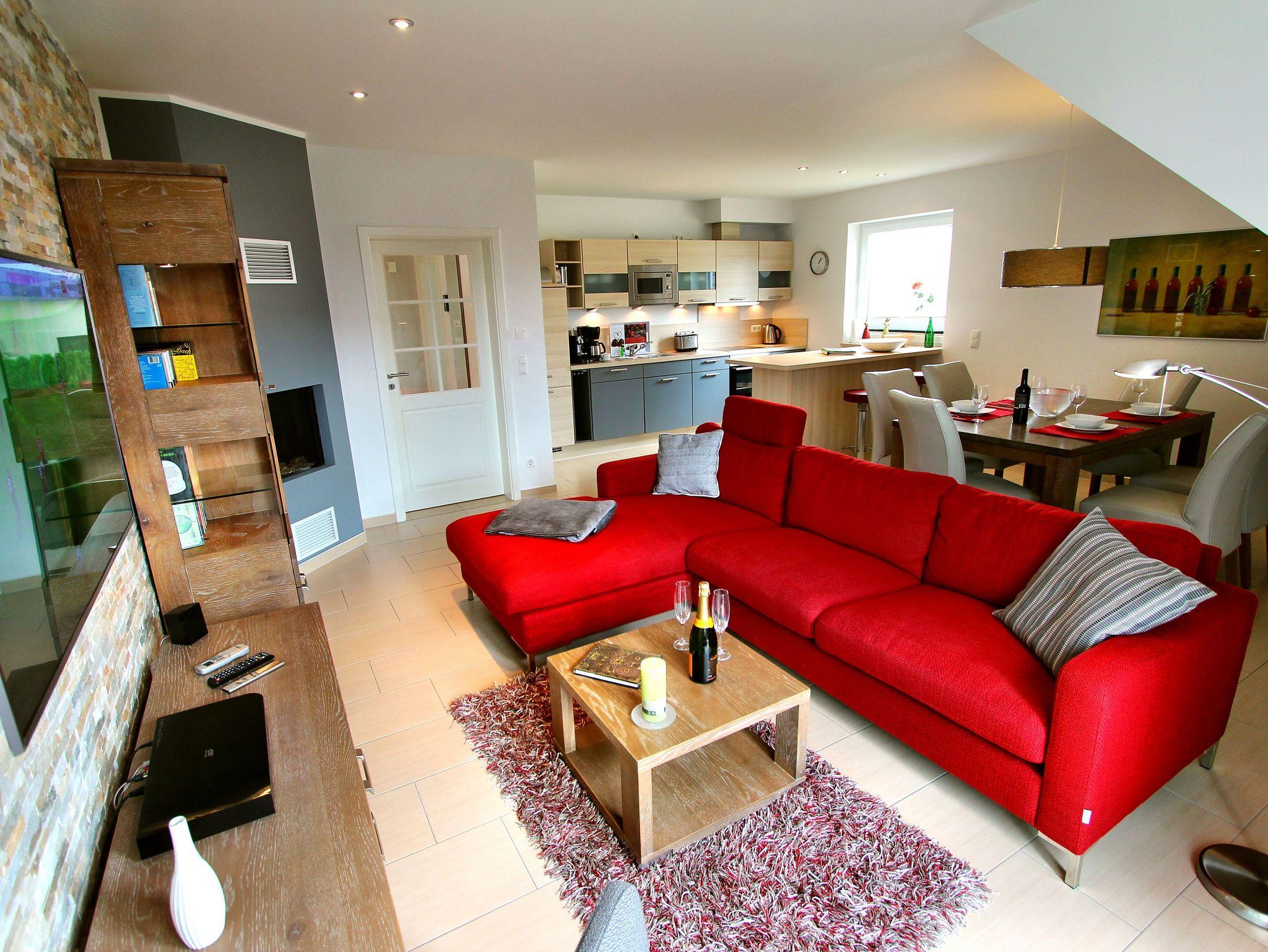 Diese charmante Obergeschosswohnung im Maisonette-Stil bietet Platz für bis zu 6 Personen und lädt mit ihrer gemütlichen Atmosphäre zum Entspannen ein. Im großzügigen Wohnzimmer mit Gaskamin genießen Sie behagliche Abende, während der offene Essbereich und die vollausgestattete Küche das perfekte Umfeld für gemeinsame Mahlzeiten schaffen. Zwei Badezimmer mit Dusche, eines davon mit einer privaten Sauna, sorgen für Komfort und Wellness. Zwei geräumige Schlafzimmer mit komfortablen Doppelbetten sorgen für erholsamen Schlaf, während im Spitzboden ein weiteres Schlafzimmer sowie ein gegenüberliegendes Badezimmer mit einer wohltuenden Whirlwanne auf Sie warten.
