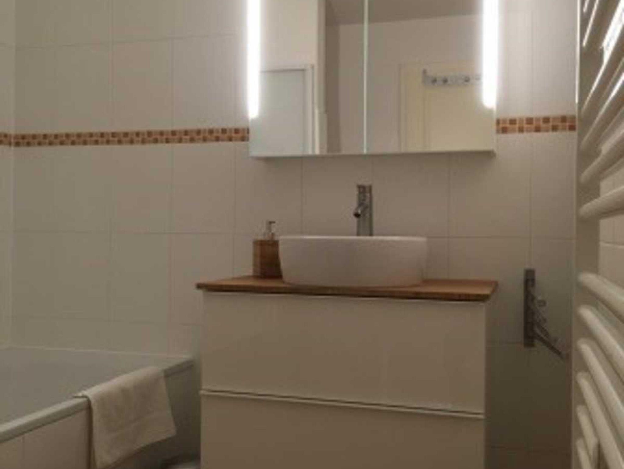 Im Badezimmer befindet sich eine Badewanne mit Duschtrennwand.