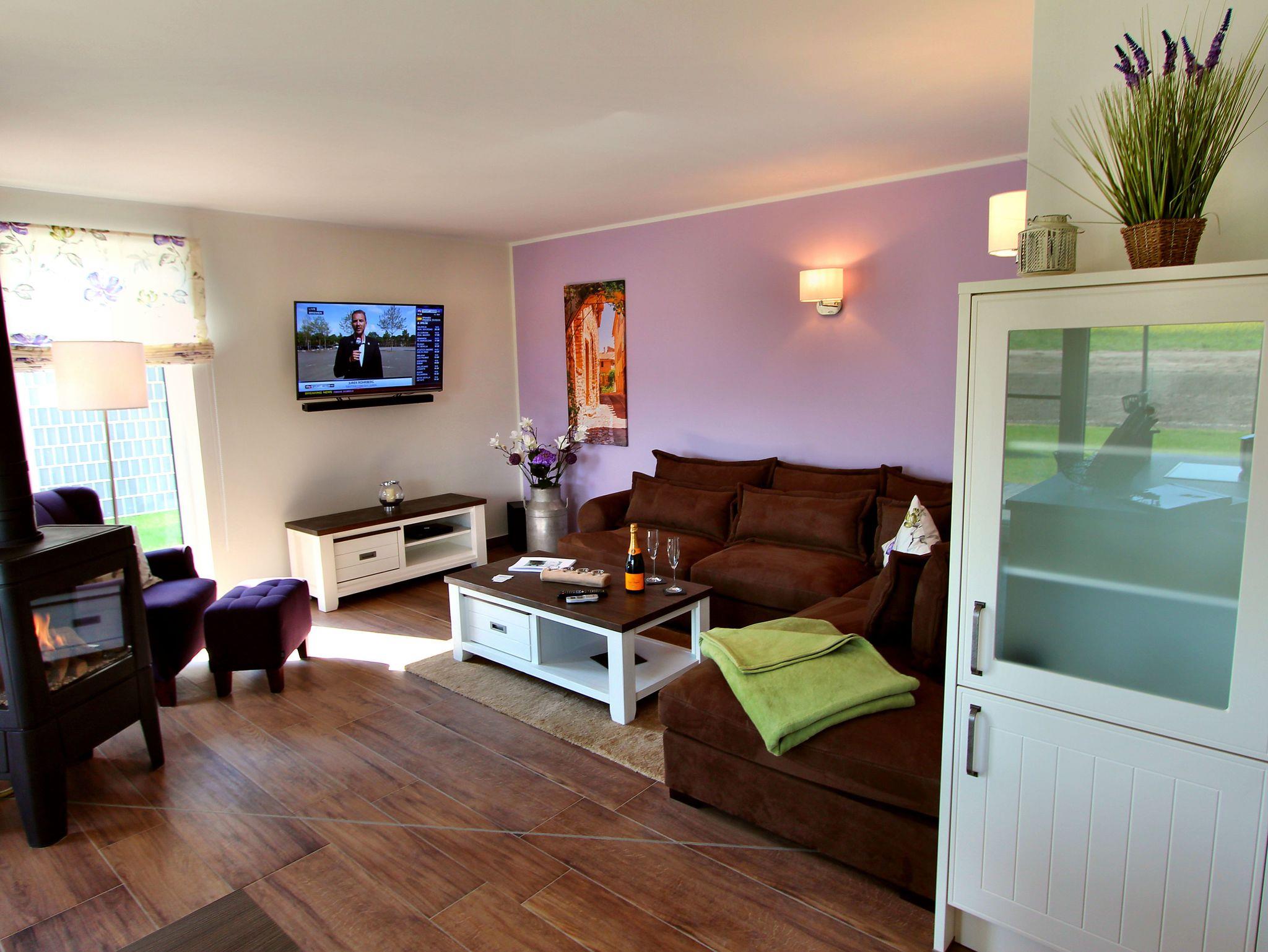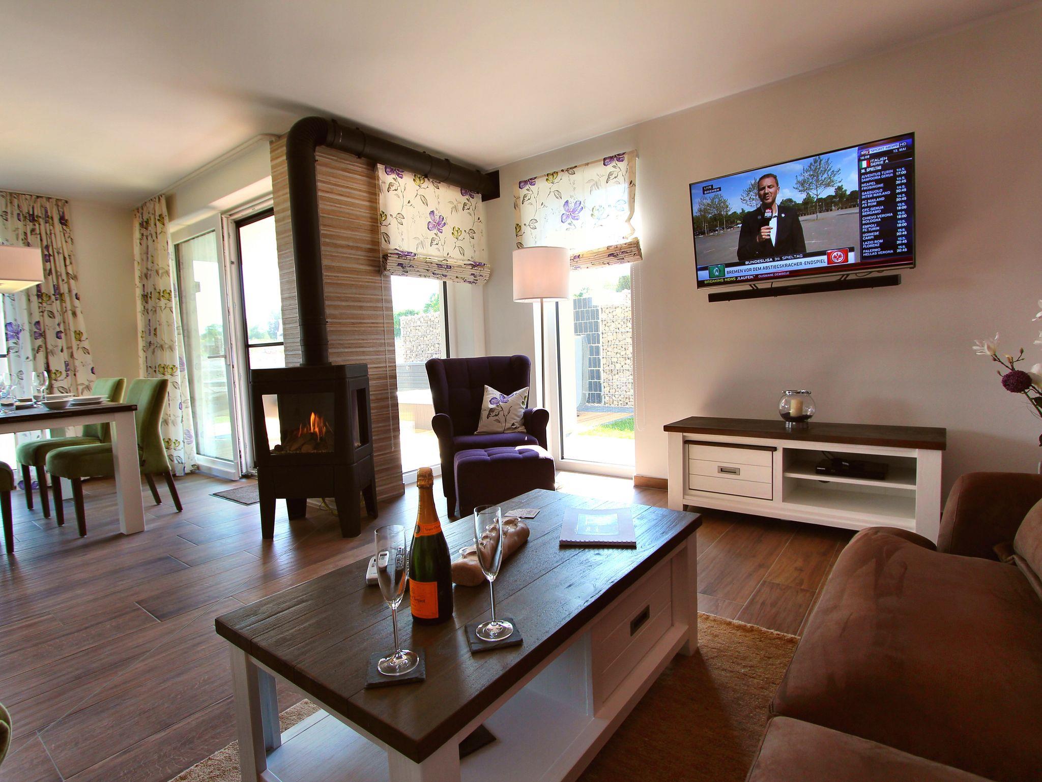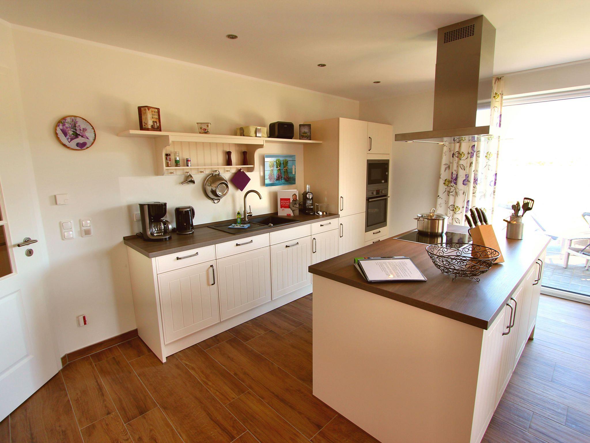 Die Ferienwohnung im Erdgeschoss ist im modernen Landhaus-Stil liebevoll eingerichtet. Sie verfügt über insgesamt 102 m² Wohnfläche, 2 Schlafzimmer, 2 Bäder, Sauna, Wohn- und Essbereich einem Gas Kamin und einer vollausgestatteten, offenen Küche mit einer Kochinsel.