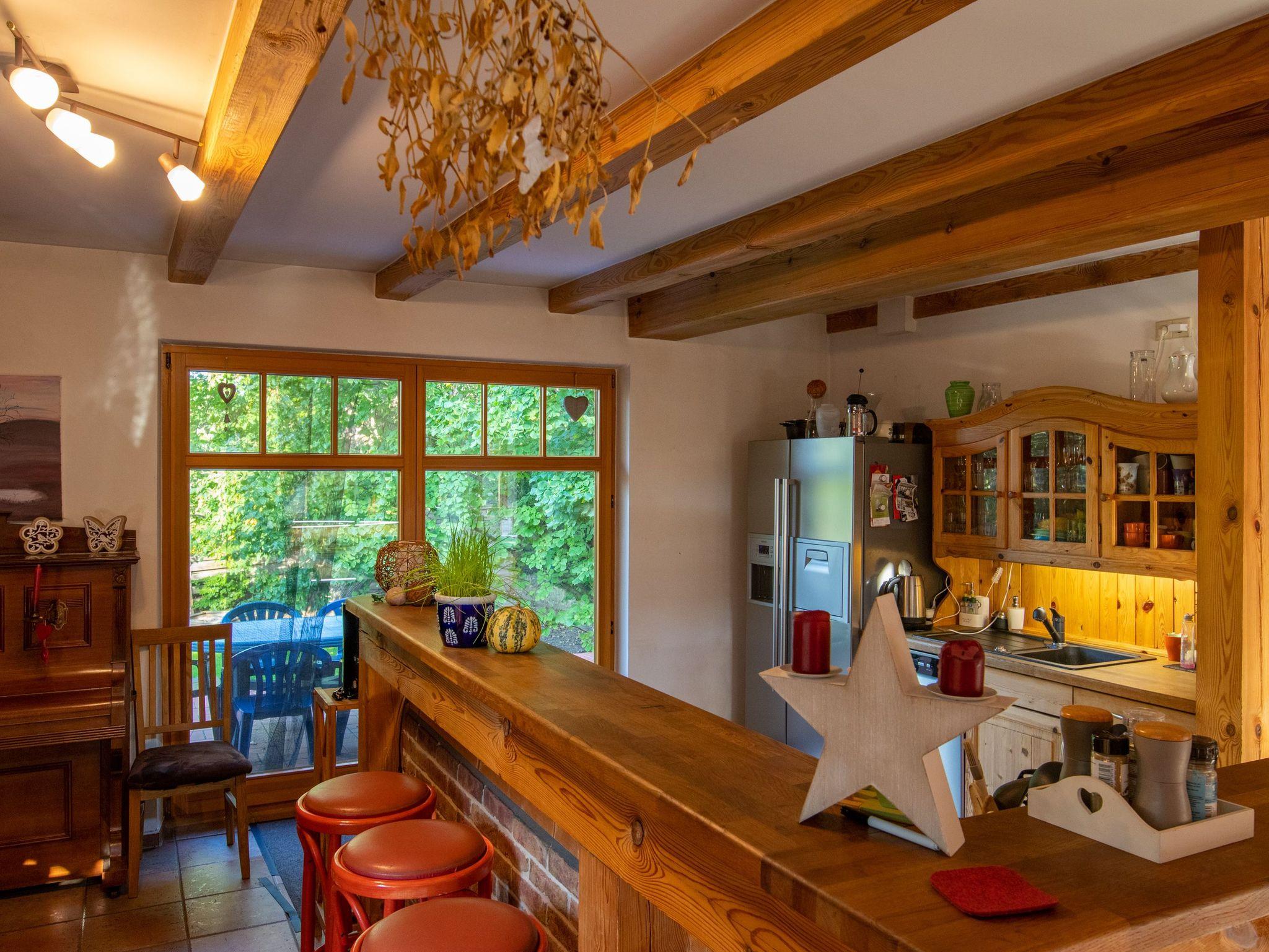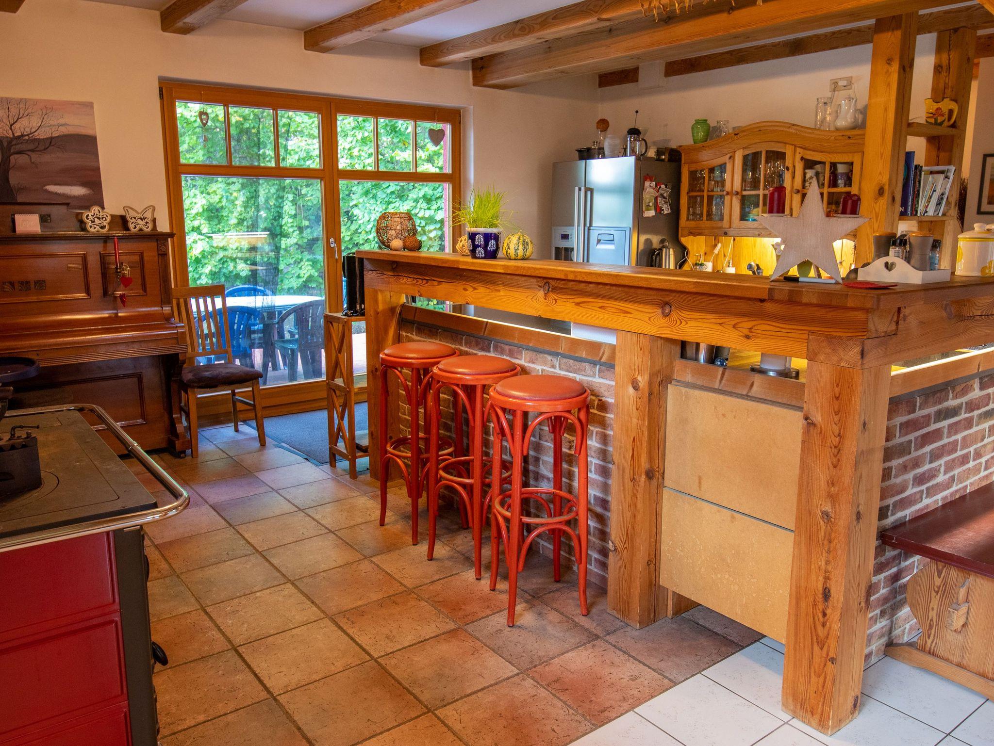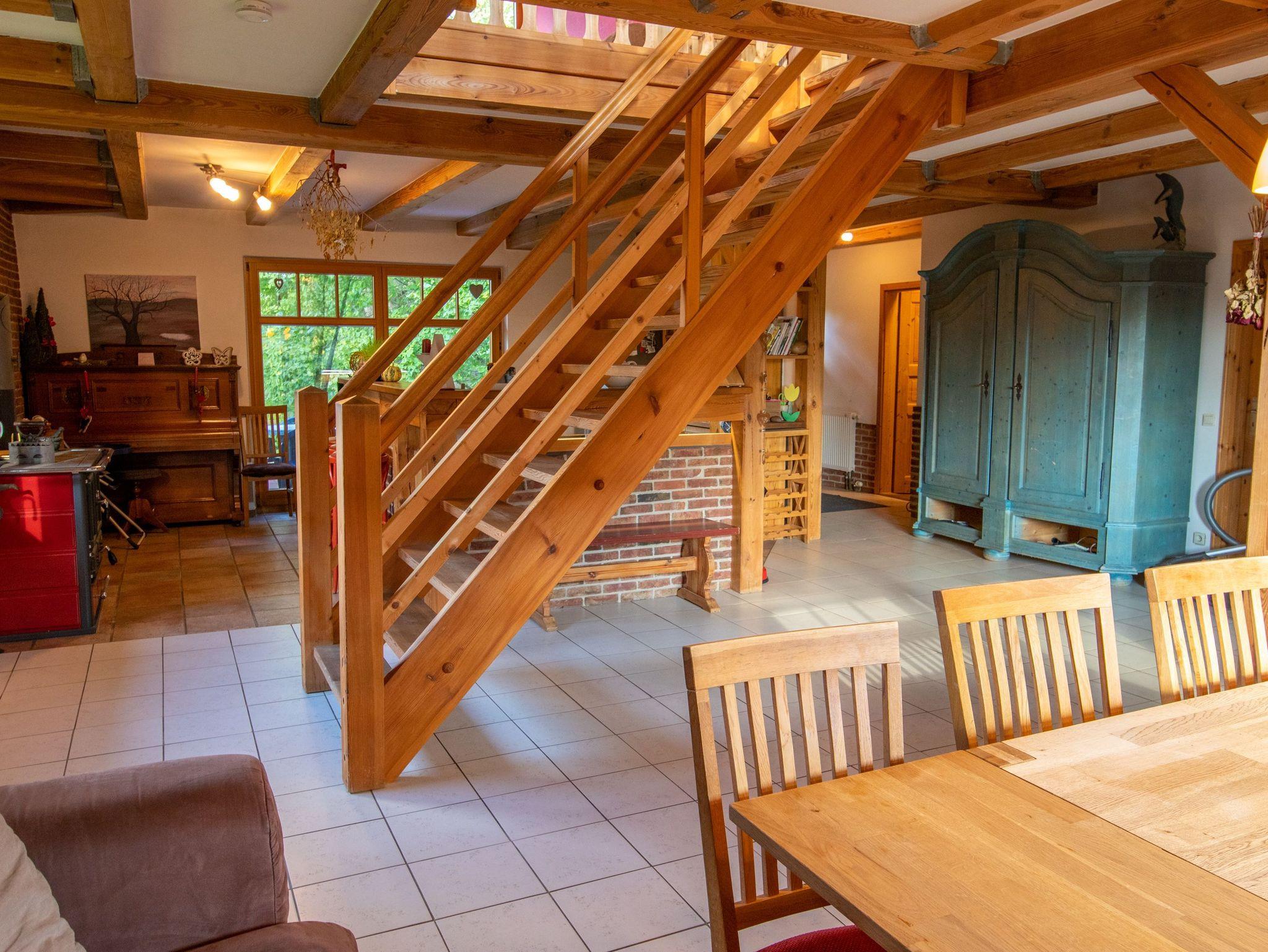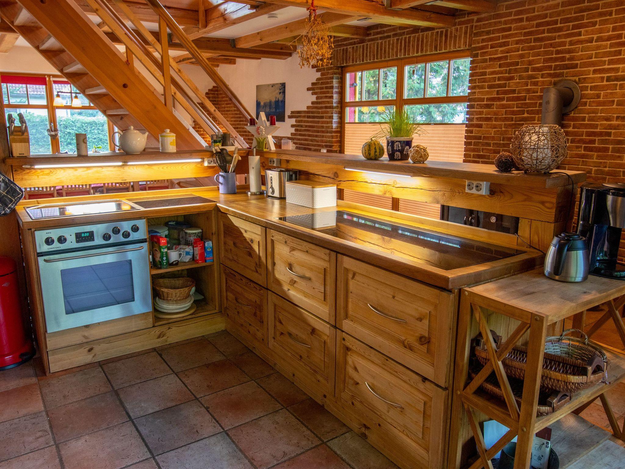 Das Ferienhaus bietet auf 180m² und 2 Etagen reichlich Platz für große Familien und Freundesgruppen - gemeinsam kochen, essen und spielen. Rückzugsmöglichkeiten laden zum Kuscheln, Lesen oder einfach zum Träumen und Genießen ein. Es gibt insgesamt 3 Schlafzimmer und 2 Bäder (eines mit Dusche und eines mit großer Badewanne). Das große Wohnzimmer mit offener Küche besticht mit einem breiten Kühlschrank und einem Holzofenherd. Im oberen Bereich befinden sich weitere Sitzmöglichkeiten und ein Kamin.
