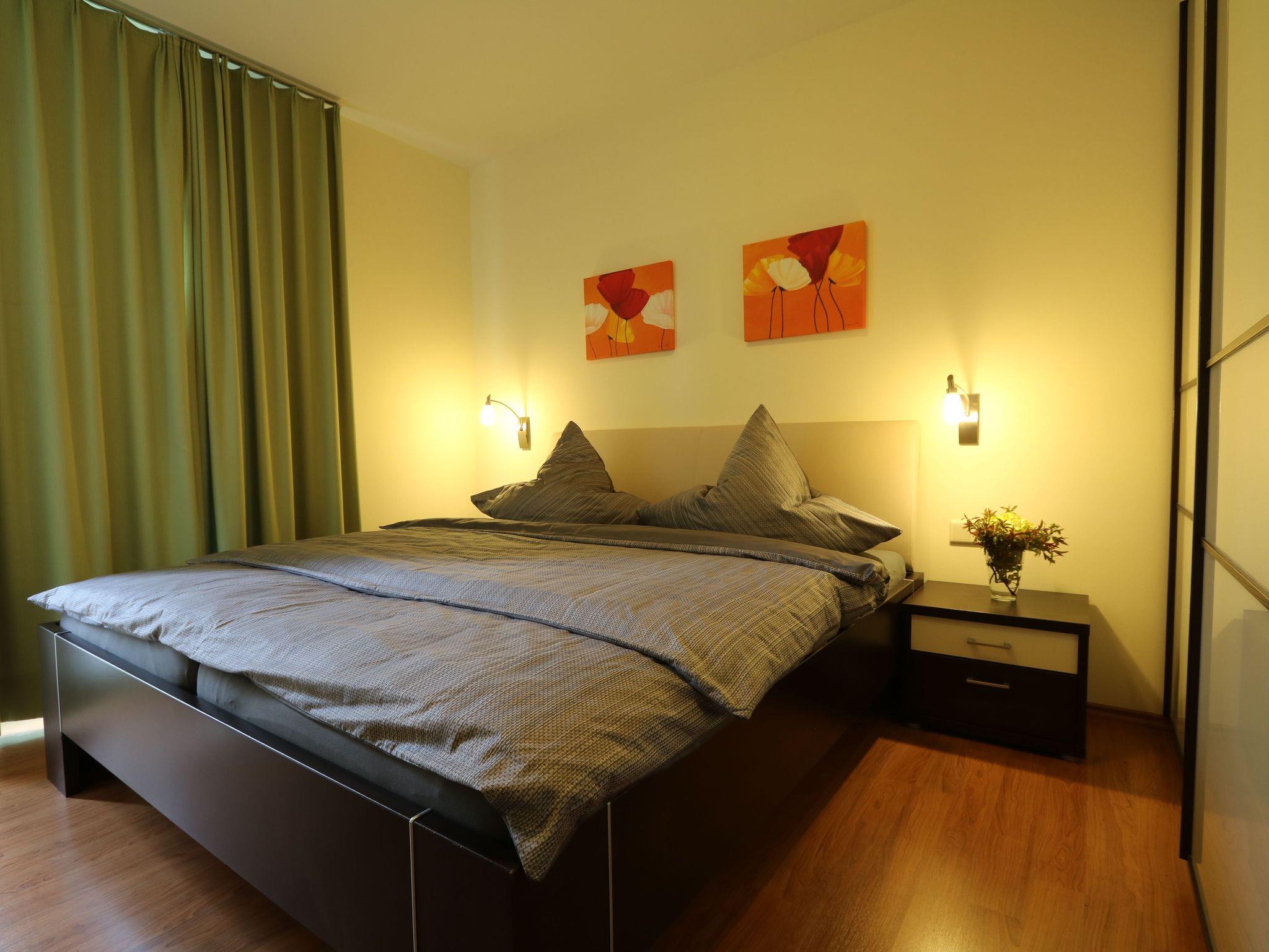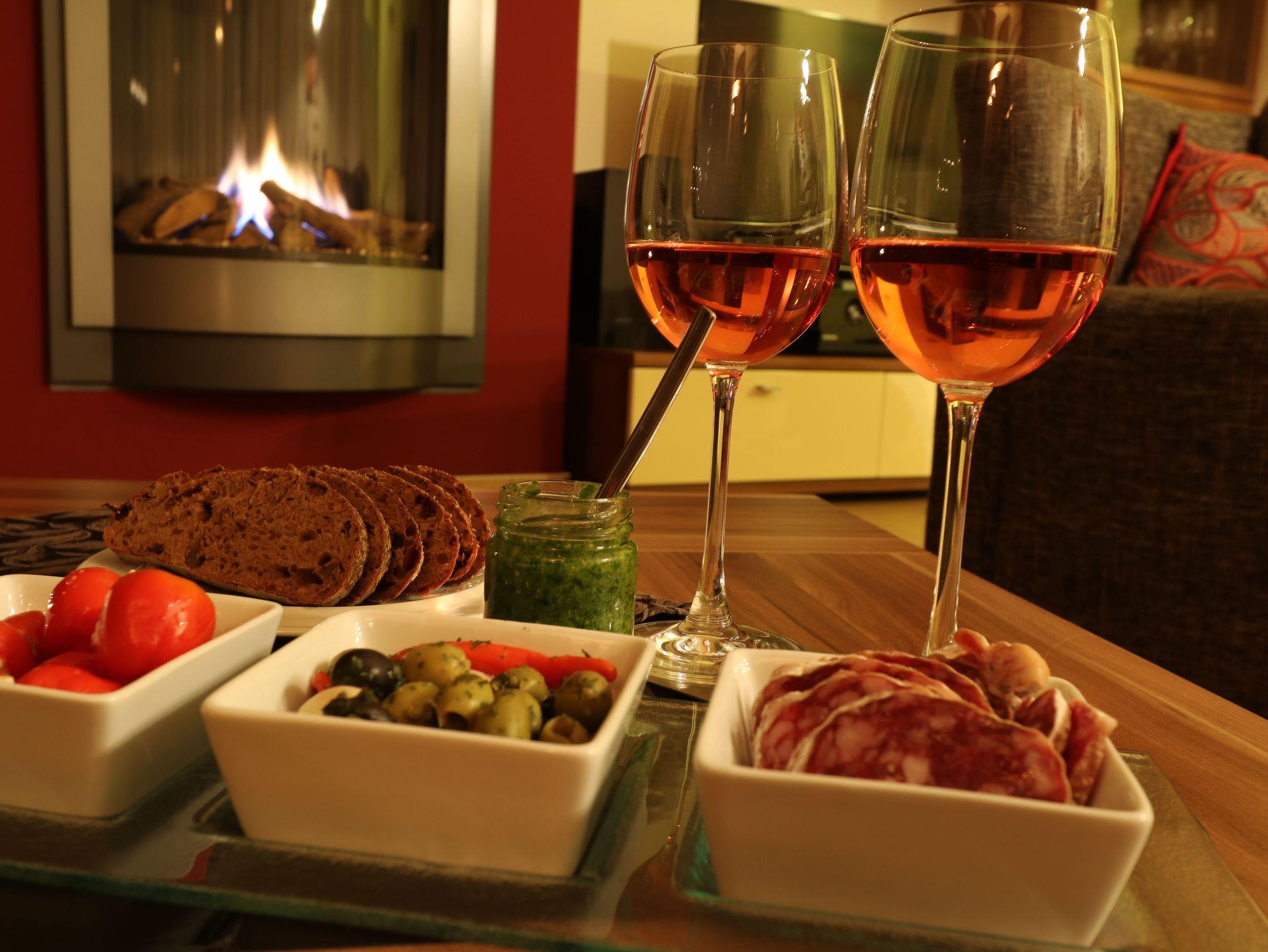 Genießen Sie Ihre Auszeit im Wellnessambiente mit Panoramablick über die Landschaft, und das zu jeder Jahreszeit. Die gemütlich eingerichtete Wohnung befindet sich im Erdgeschoß der Villa Harmonie. Diele, Wohn-/Essbereich mit Küche, 2 Schlafzimmer, Bad und Abstellraum verteilen sich großzügig auf ca. 92 qm. Die Einrichtung und Dekoration sind mit viel Liebe zum Detail aufeinander abgestimmt, schaffen ein wohnliches Ambiente und tragen so zu Wohlbehagen, guter Laune und Frohsinn bei. Im offenen Wohn-/Essbereich entspannen Sie auf dem Sofa vor dem Kamin, der Esstisch mit 4 Stühlen lädt zum gemütlichen Essen ein oder auch zum geselligen Beisammensein bei Gesellschaftspielen . Flatscreen-TV und DVD-Player sorgen für Unterhaltung. Die Ausstattung der offenen Einbauküche lässt keine Wünsche offen: Geschirr und Besteck sind ausreichend vorhanden. Weiterhin beinhaltet die Küche einen Herd mit Ceran-Kochfeld und Umluft-Backofen, ein Raclette und eine Mikrowelle für die schnelle Küche, eine Kühl/Gefrierkombination und eine Spülmaschine. Die gemütlichen Schlafzimmer sind jeweils mit Doppelbett, 2 Nachttischen und Kommode ausgestattet. In den dreiteiligen Schlafzimmerschränken lässt sich der Inhalt des Reisegepäcks nebst Koffer spielend verstauen. Beide Schlafzimmer verfügen über einen Flatscreen-TV. Die Laminatfußböden sorgen für eine reizarme Atemluft , die Fliegengitter für ruhige Nächte bei geöffnetem Fenster. Das Bad ist eines der Highlights dieser Wohnung, denn hier befindet sich ein kleiner SPA-Bereich. Die Familiensauna, die ebenerdige verglaste Raindance-Wellnessdusche, der große Designerwaschtisch und der Handtuchwärmer lassen keine Wünsche offen. Auf der umlaufenden Terrasse können Sie sowohl in der Morgen-, als auch in der Mittagssonne die phantastische Aussicht auf das nahe Wäldchen und den Golfplatz genießen. Der Gartentisch mit 4 Stühlen, 2 Gartenliegen, der Strandkorb und der große Sonnenschirm laden zum Verweilen ein. Wie wär's mit einem leckeren Barbecue? - der Grill wartet schon. Stellen Sie Ihre Fahrräder und Golfbags gerne im abschließbaren Schuppen unter. Ihr Fahrzeug parken Sie auf dem eigenen Parkplatz direkt neben dem Haus. Waschmaschine und Wäschetrockner finden Sie im Hauswirtschaftsraum zur kostenlosen Nutzung.