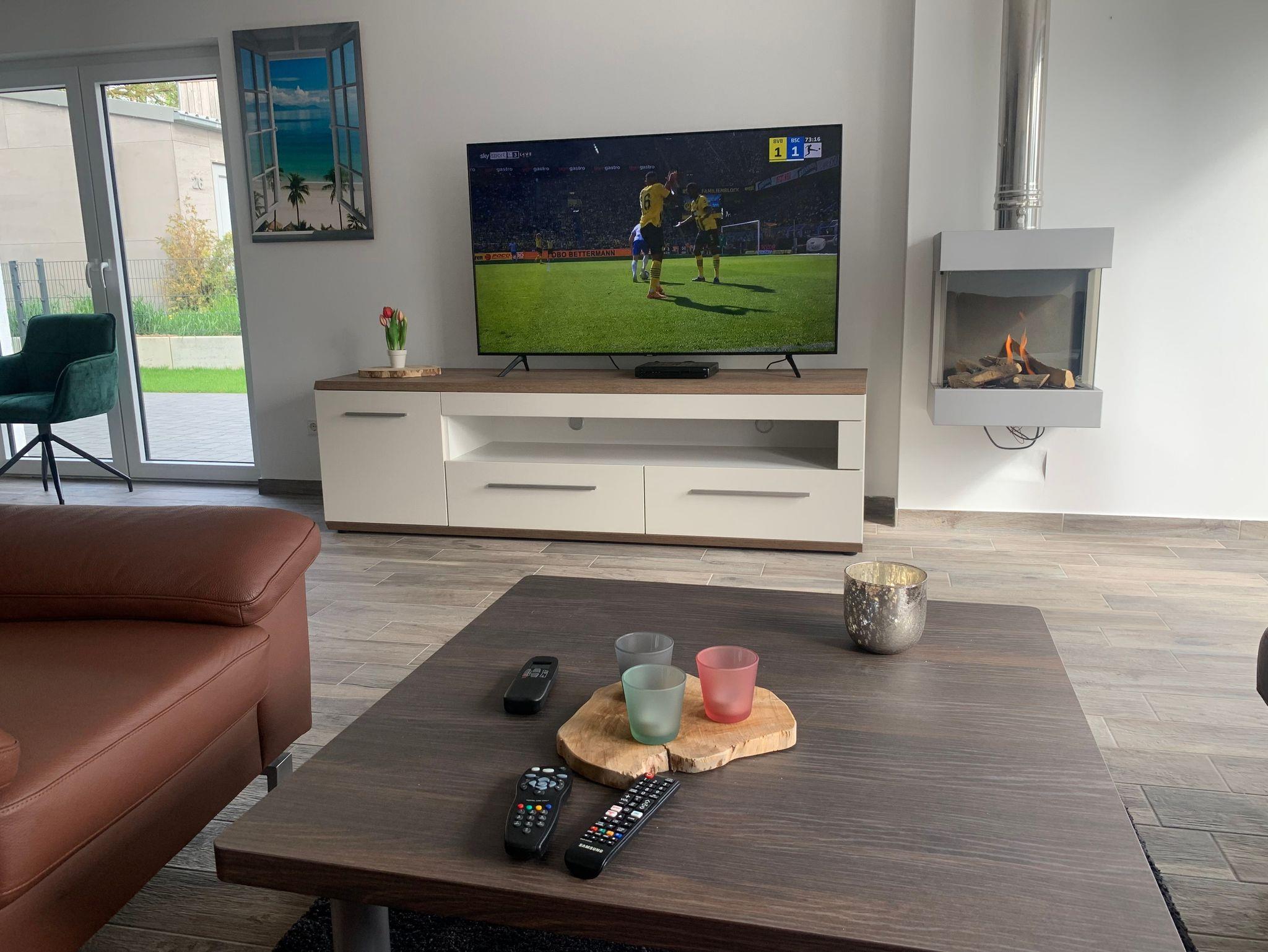 Lässig auf dem Sofa liegend, kann man komplett entspannen mit Musik oder Sky TV und einem Gaskamin.