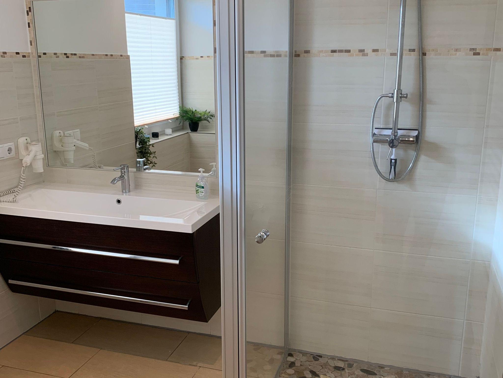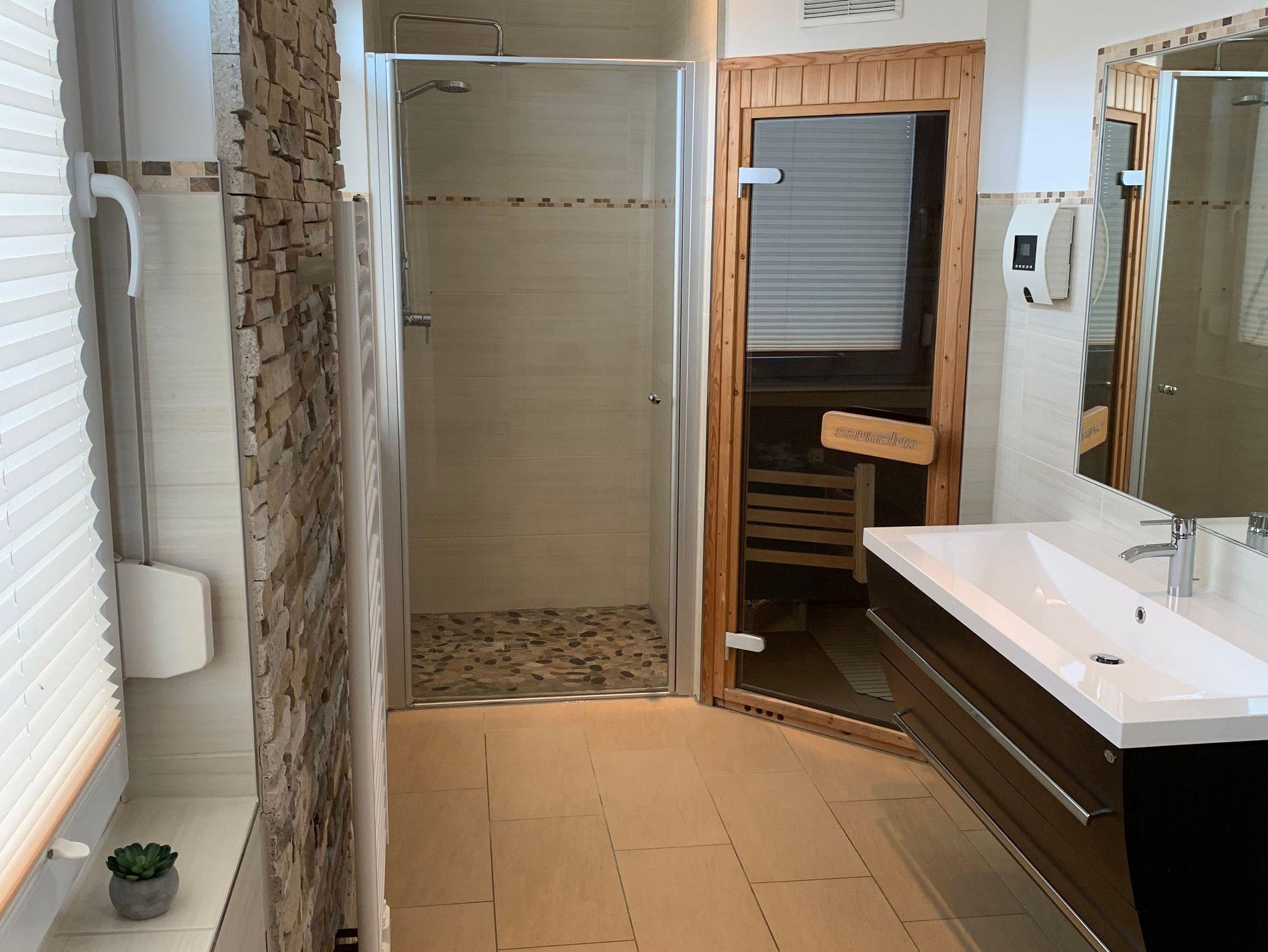 Die Bäder bieten moderne Waschtische und Raindanceduschen. Das große Bad verfügt zusätzlich über eine Sauna. Alle Räume werden über eine Fussbodenheizung beheizt..