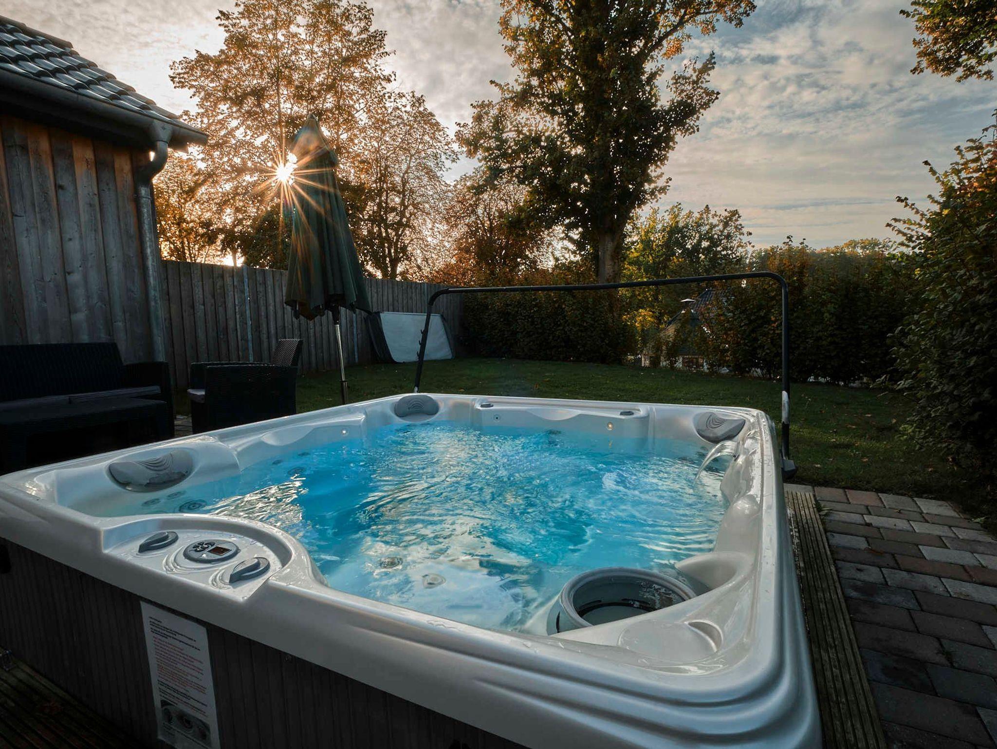 Privater Außenwhirlpool mit Hydro-Massagejet-Düsen und Unterwasserbeleuchtung (ganzjährig auf 38 Grad)