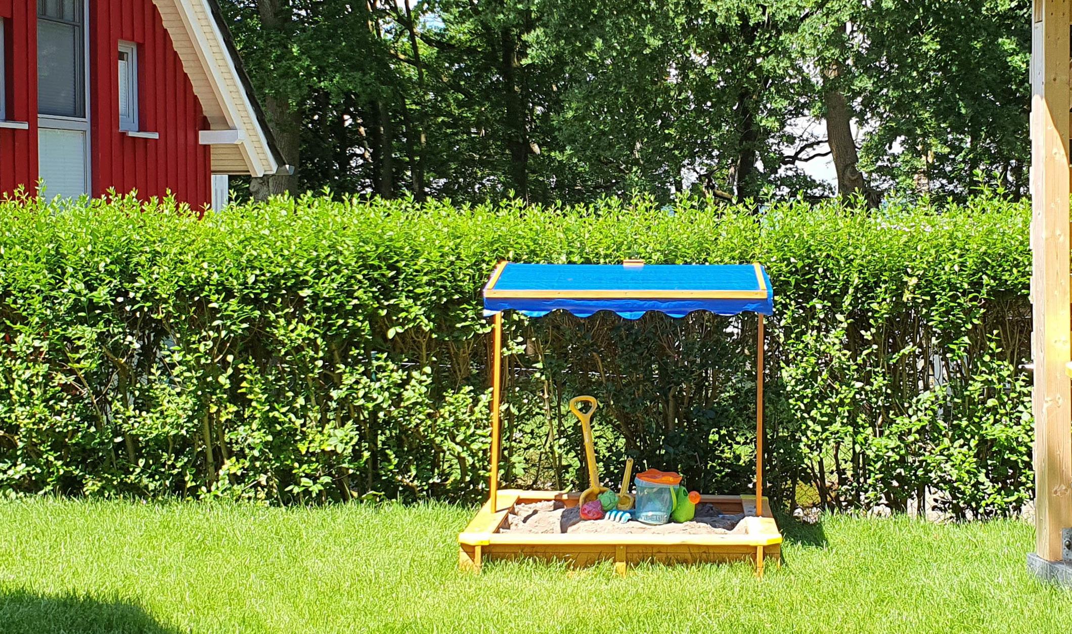 Vom Erdgeschoss aus gelangen Sie auf die drei Holzterrassen, die vom Westen bis Osten reichen. Eine Ostterrasse zum Frühstücken. Im Norden blicken Sie auf den Fleesensee und auf der Westterrasse können Sie sich für Privatsphäre zurückziehen. Im Garten gibt es einen Sandkasten, Gartenmöbel, Sonnenschirm und einen Grill. Im Gartenhaus können Sie Ihre Fahrräder abstellen. Vor dem Haus gibt einen gepflasterten Stellplatz für ein großes oder zwei kleine Autos.