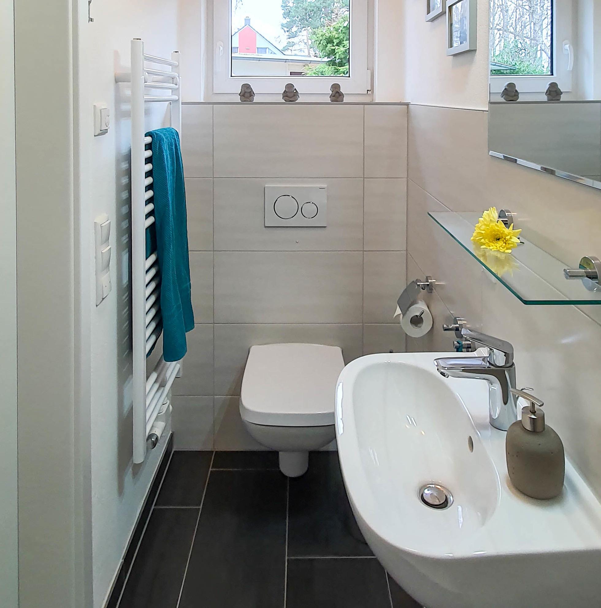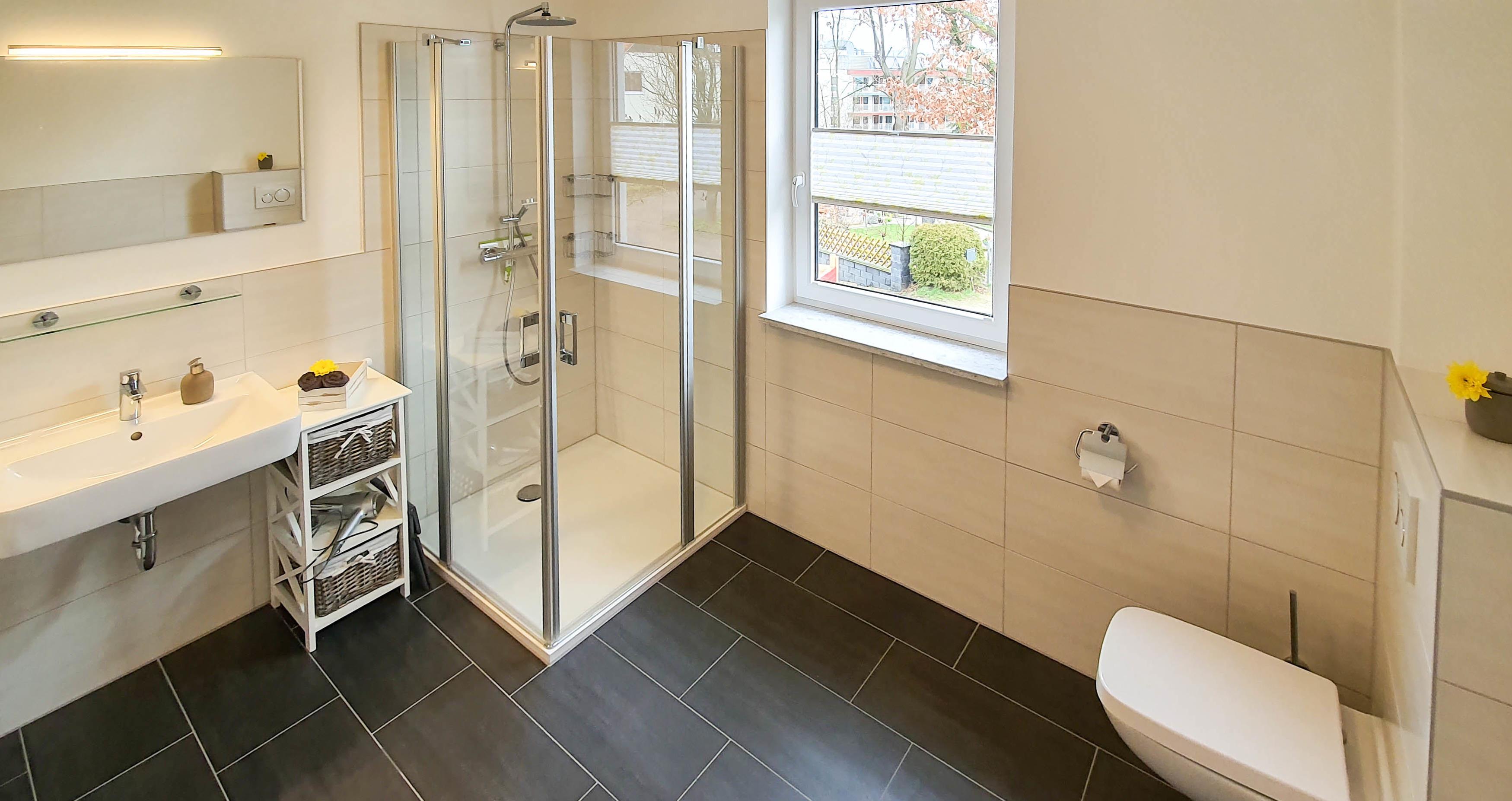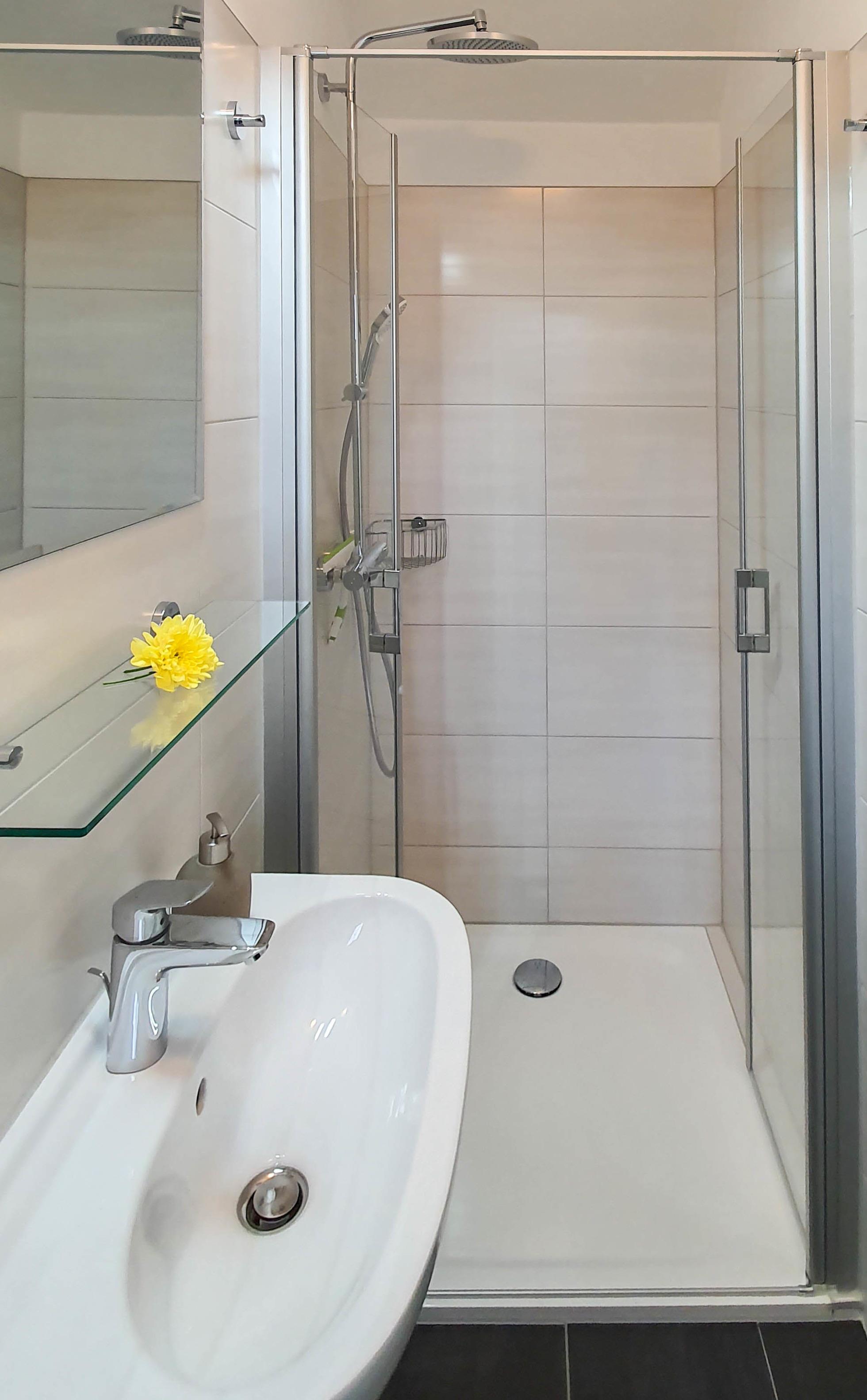 Das Bad (8m²) im Dachgeschoss verfügt über eine geräumige Duschkabine und viel Platz zum Umziehen. Das untere Bad (2,5m²) verfügt über eine Dusche und kann als vollwertiges Bad genutzt werden. Beide Bäder verfügen über einen Handtuchheizkörper und in der Dusche über eine Hand-/Kopfbrause.