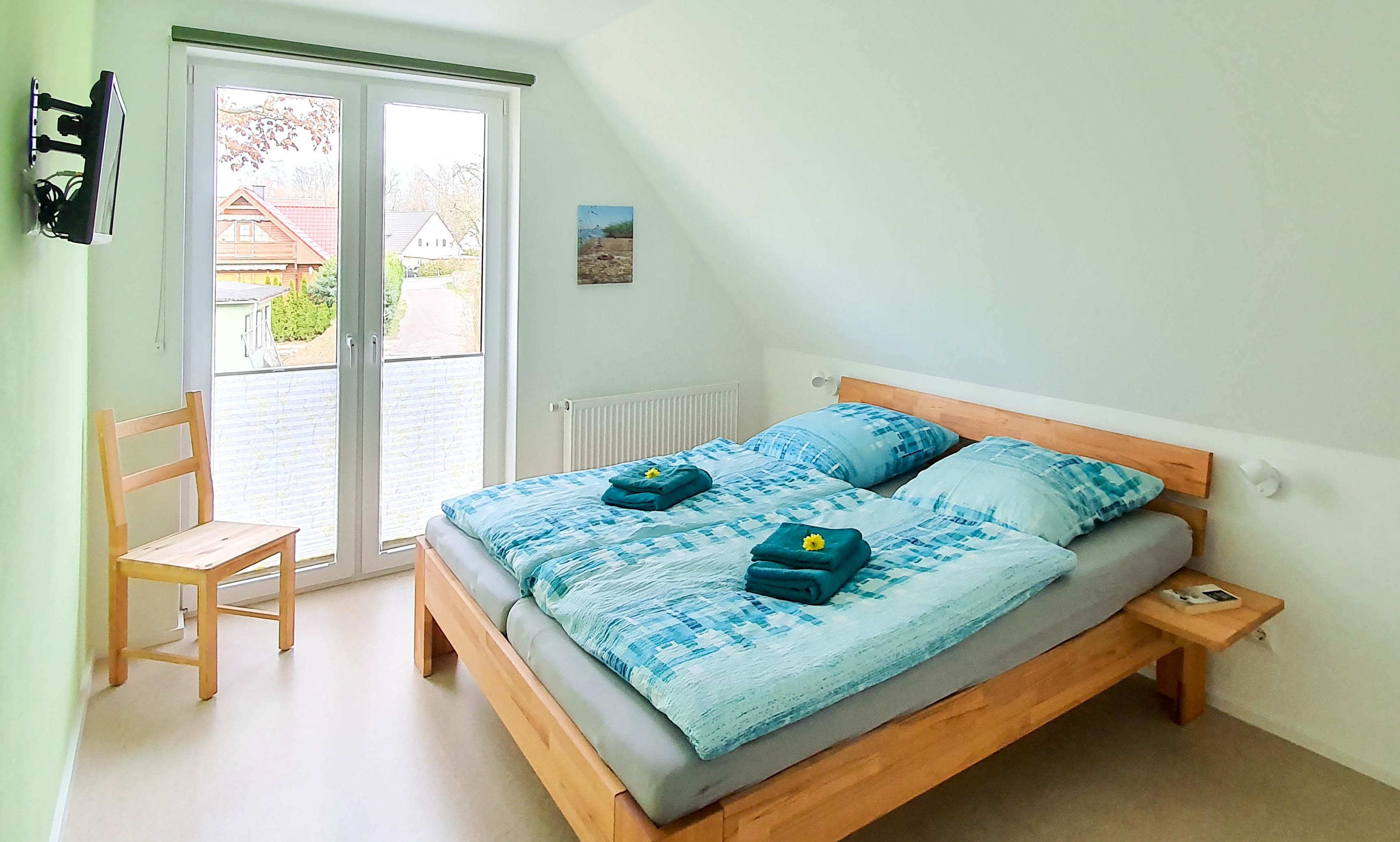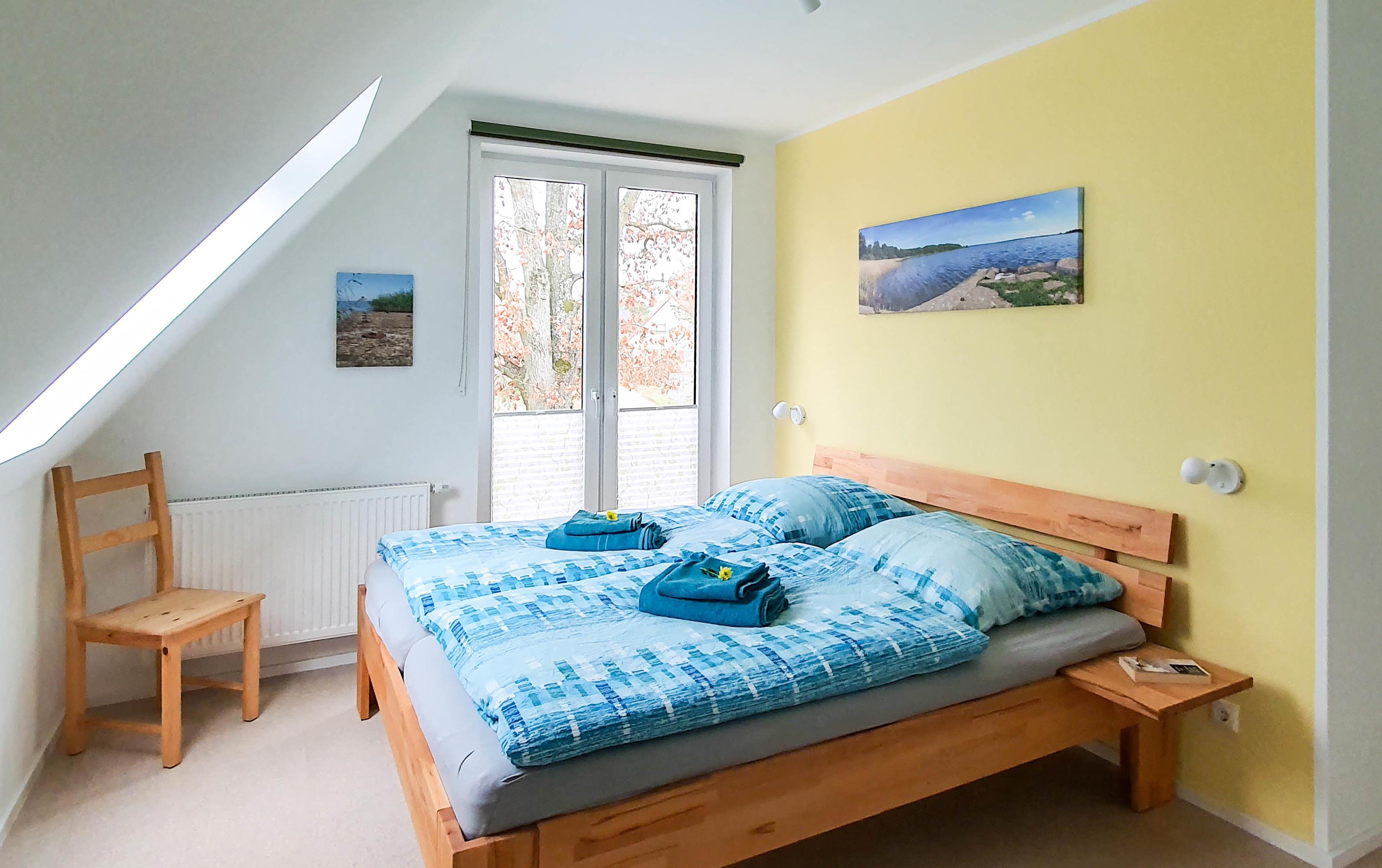 Im Schlafzimmer (12m²) zur Seeseite kann über das Dachfenster mit Plissee zum Verdunkeln der Fleesensee beobachtet werden. Zwei mittelharte Matratzen laden in dem Doppelbett zu erholsamen Träumen ein. Wer lieber härtere Matratzen mag, der findet diese im Doppelbett im zweiten Schafzimmer (11m²). Zusätzlich gibt es in diesem Schlafzimmer einen Flachbildfernseher. In den geräumigen Kleiderschränken ist genügend Ablagefläche für Ihre Kleidung. Leselampen und Ablagen am Bett laden zum Verweilen ein.