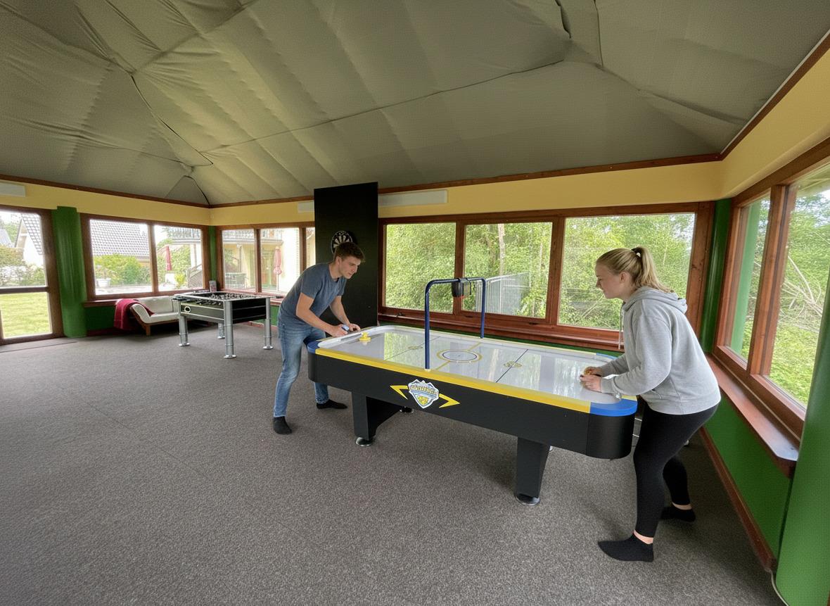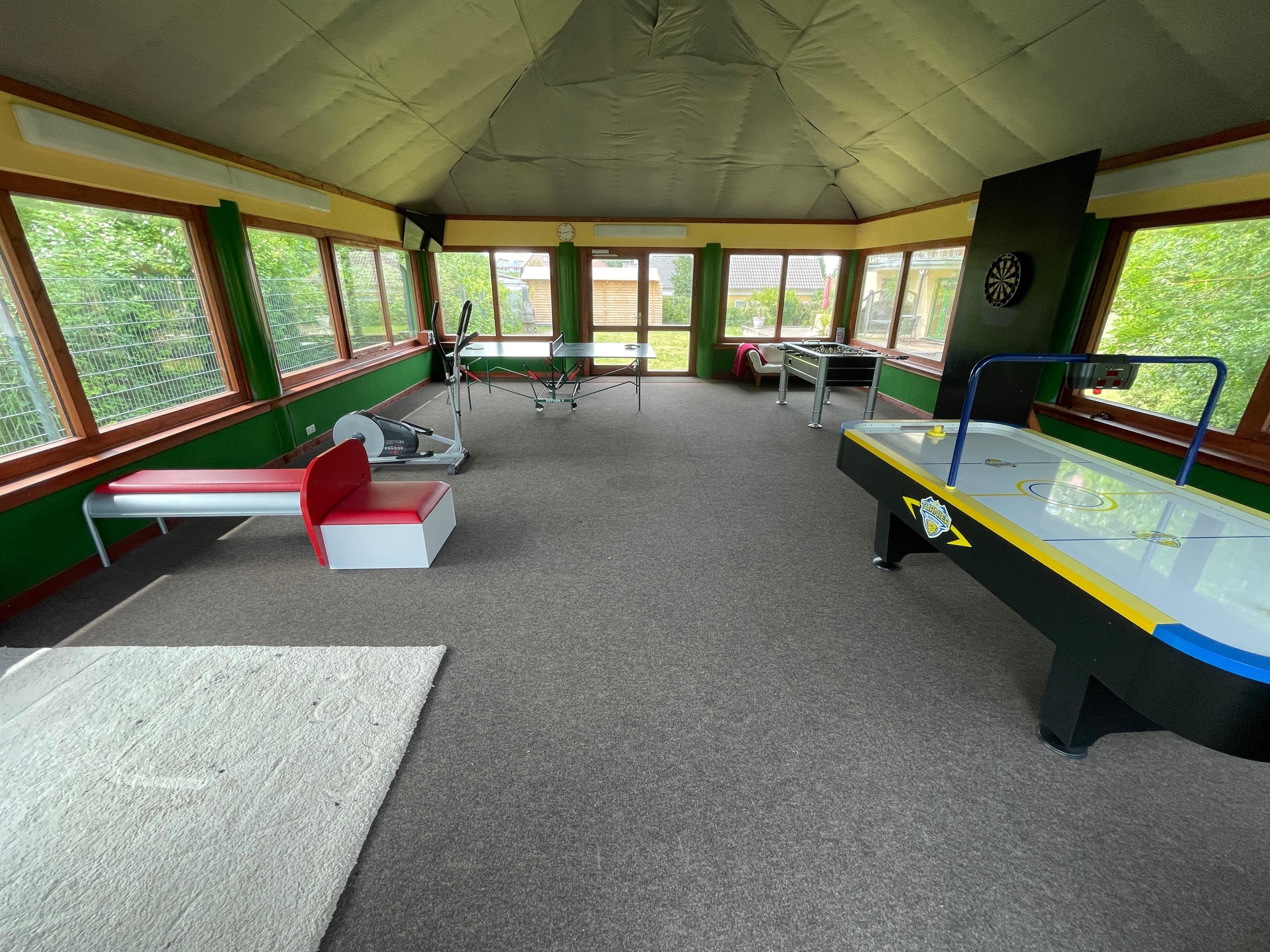 Ein besonderes Highlight ist unser großzügiger Spielpavillon mit rund 70 m² Fläche, den Sie gegen eine kleine Gebühr nutzen können. Hier erwarten Sie Tischtennis, Airhockey, Dart, Tischkicker und ein Heimtrainer, perfekt für gemeinsame Stunden mit Familie oder Freunden, auch wenn das Wetter einmal nicht mitspielt. Bequeme Sitzgelegenheiten laden zum Zuschauen ein, und ein kleiner Fernseher sorgt für Unterhaltung zwischendurch. Große Fenster lassen viel Tageslicht herein und bieten einen angenehmen Blick ins Grüne.