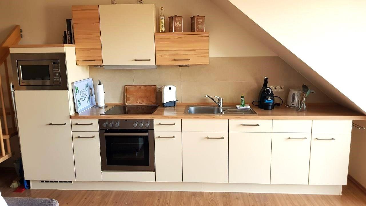 Der offene gestaltete Wohnraum mit Küchenzeile und Essbereich ist auf Ebene 1 im Dachgeschoß. Im Spitzboden, der Ebene 2, die über eine Treppe im Wohnraum erreichbar ist, befindet sich zusätzlich das separate Schlafzimmer. Das Sofa im Wohnraum kann als Schlafcouch genutzt werden, so dass durchaus auch eine dritte Person Platz findet, oder Sie aber auch einfach direkt auf dieser Ebene nächtigen können. Auch befindet sich auf dieser Ebene 1 das innenliegende Duschbad. Sowohl Schlaf- als auch Wohnraum haben Fliegengitter.