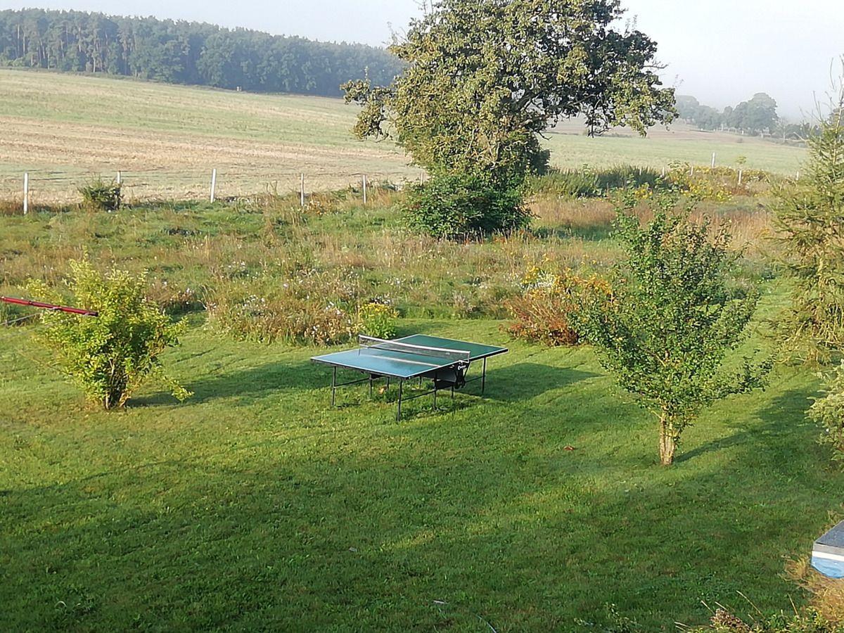 Die Küche hat eine Tür zur lichtdurchfluteten Terrasse im Garten – gesäumt von Blumenrabatte und Goldfischteich. Sonnenschirm, Tisch und 4 Stühle stehen zur Verfügung. Hinter dem Haus in der Wiese gibt es einen Grillplatz mit Erfrischungsbassin, 90 cm tief, und Fontaine. Das Becken wird regelmäßig gereinigt. An heißen Sommertagen hopsen Sie einfach ins kalte Wasser oder lassen die Beine hinein baumeln. Es gibt übrigens auch eine Gartendusche. Im Schuppen steht eine Tischtennisplatte, die benutzt werden darf. Kellen und Bälle sind vorhanden. Ihren PKW können Sie auf dem Grundstück parken.