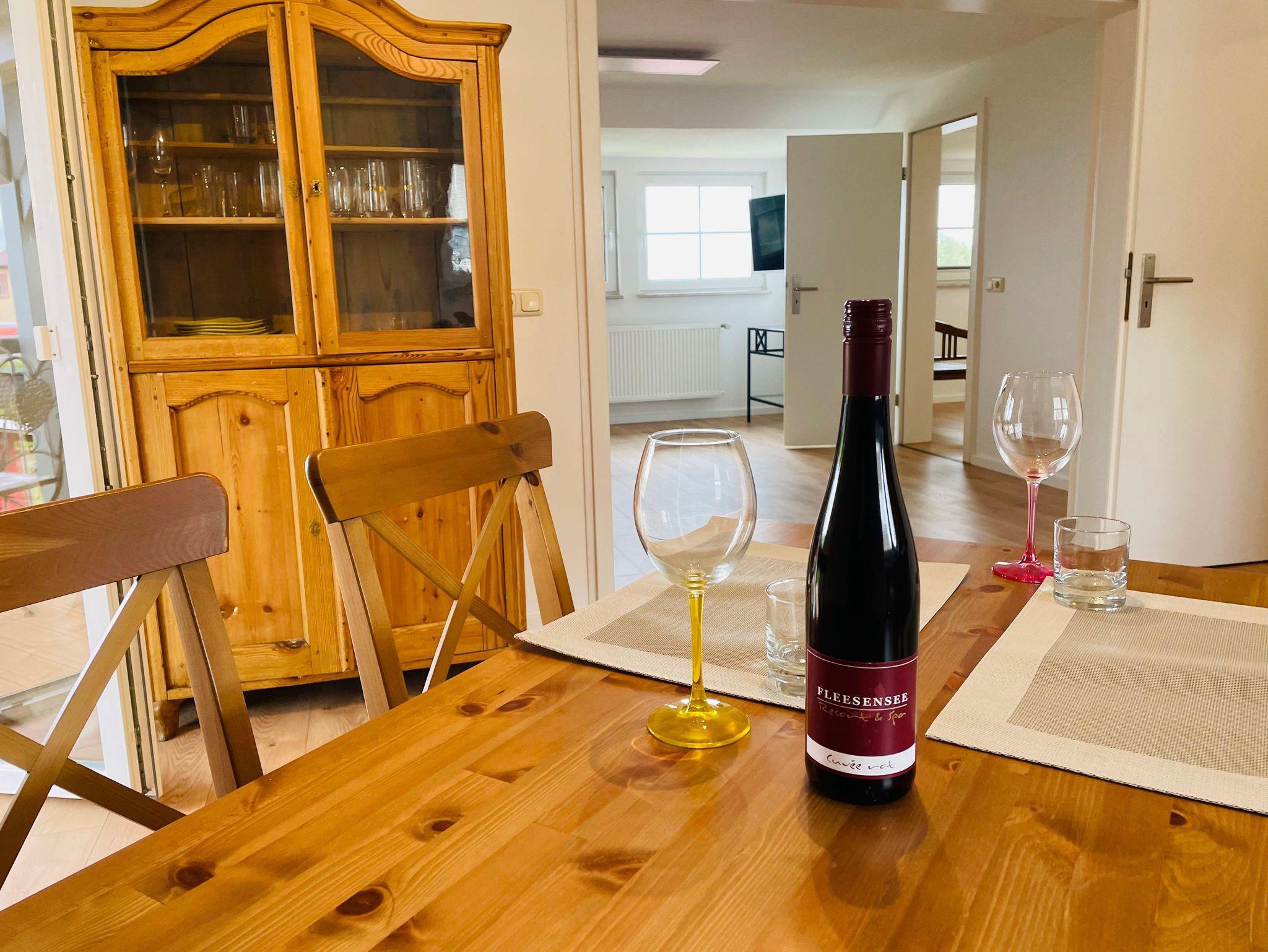 Alle Ferienwohnungen (38, 46, 58 und 65qm) für 1 bis 4 Personen haben eine Terrasse / Balkon mit freiem Blick auf den Fleesensee. Für alle Gäste steht eine Außensauna zur gemeinschaftlichen Nutzung (gegen Gebühr).