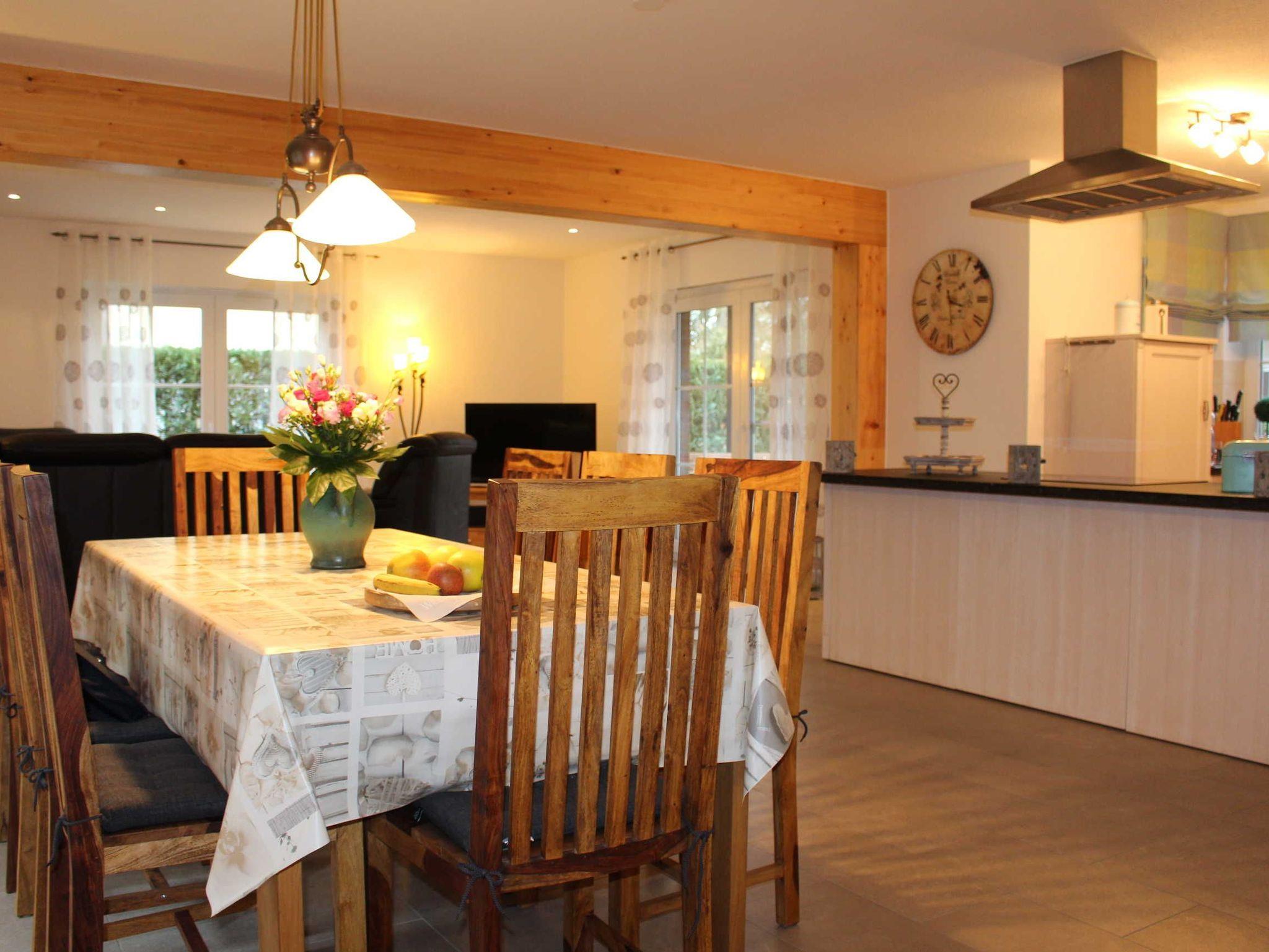 Wenn Sie diesen Trakt verlassen, gelangen Sie in das große Wohnzimmer mit einer großen, hochwertigen Wohnlandschaft und den Essbereich mit einem Esszimmertisch und acht Stühlen. Im selben Raum befindet sich die offene, voll ausgestattete Küche mit hochwertigen Geräten (Herd mit Backofen, Geschirrspüler, Kühlschrank ...).
