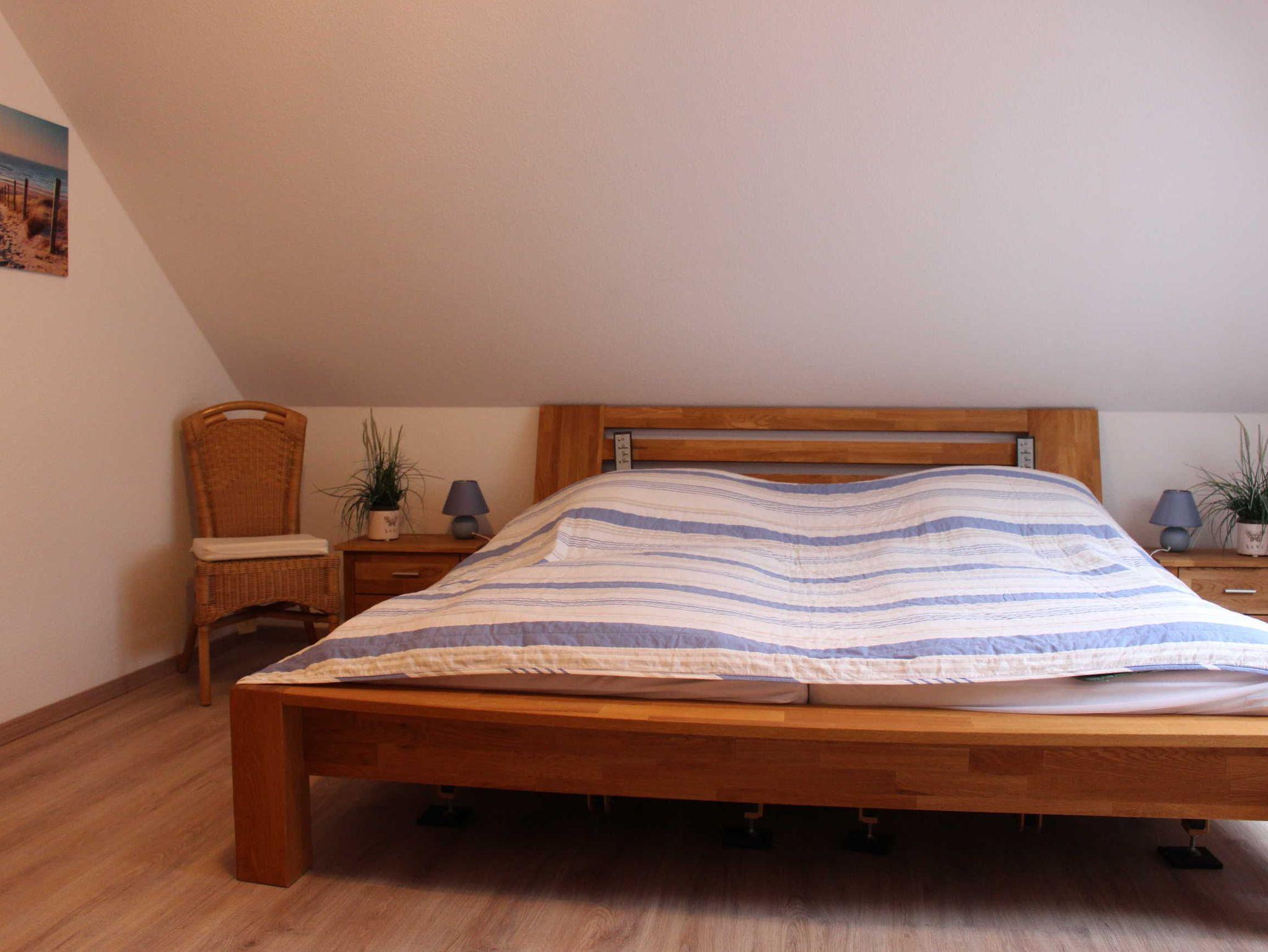 Aus der Diele gelangen Sie über eine Treppe ins Dachgeschoss. Dort befinden sich zwei weitere Schlafzimmer und ein Badezimmer mit Dusche und WC. Ein Schlafzimmer ist mit einem Ehebett und einem Einzelbett ausgestattet (alle Betten sind mechanisch verstellbar, teilweise elektrisch) und im zweiten Schlafzimmer befindet sich ein Ehebett. In beiden Schlafzimmern stehen Kleiderschränke und jedes der insgesamt 3 Schlafzimmer ist mit einem Fernseher ausgestattet.
