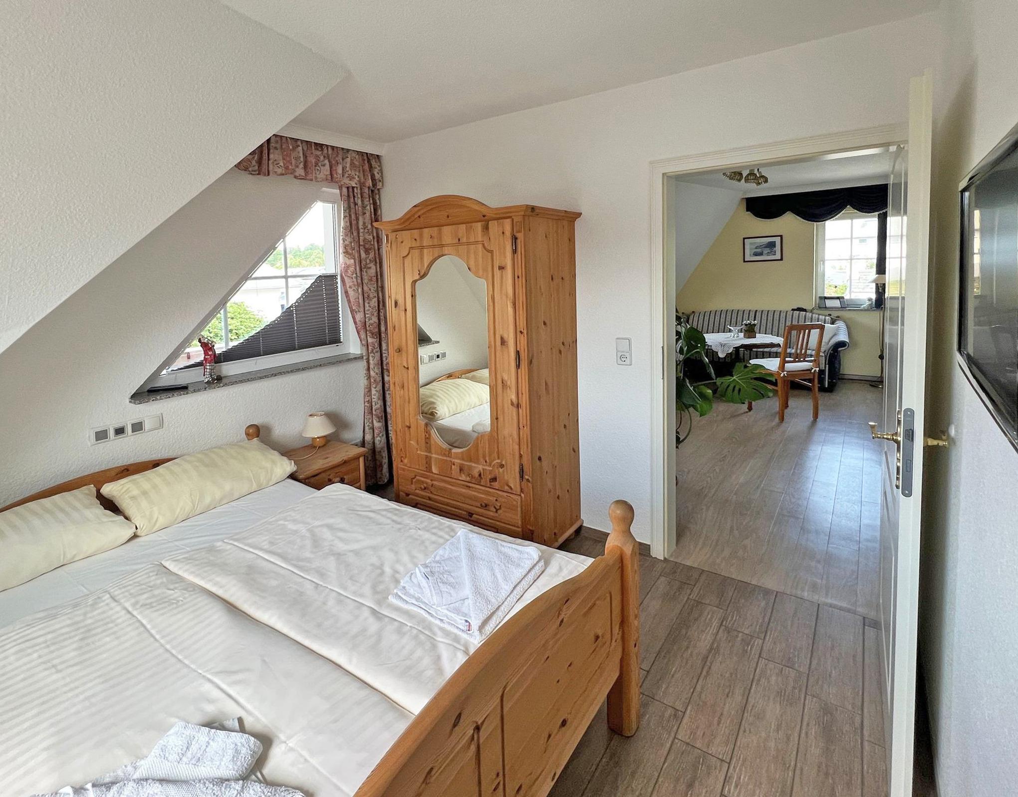 Die haustierfreie 36m²-Wohnung Nr. 1 liegt im Dachgeschoss und besteht aus einem Wohnraum mit Flachbild-TV, Küchenzeile (Kaffeemaschine, Wasserkocher, Toaster, Eierkocher, Kühlschrank, Mikrowelle, E-Herd), einem Bad mit Dusche/WC, Haartrockner, einem separaten Schlafraum mit einem Doppelbett. Es erwartet Sie ein großer West-Balkon mit Nachmittag- und Abendsonne.