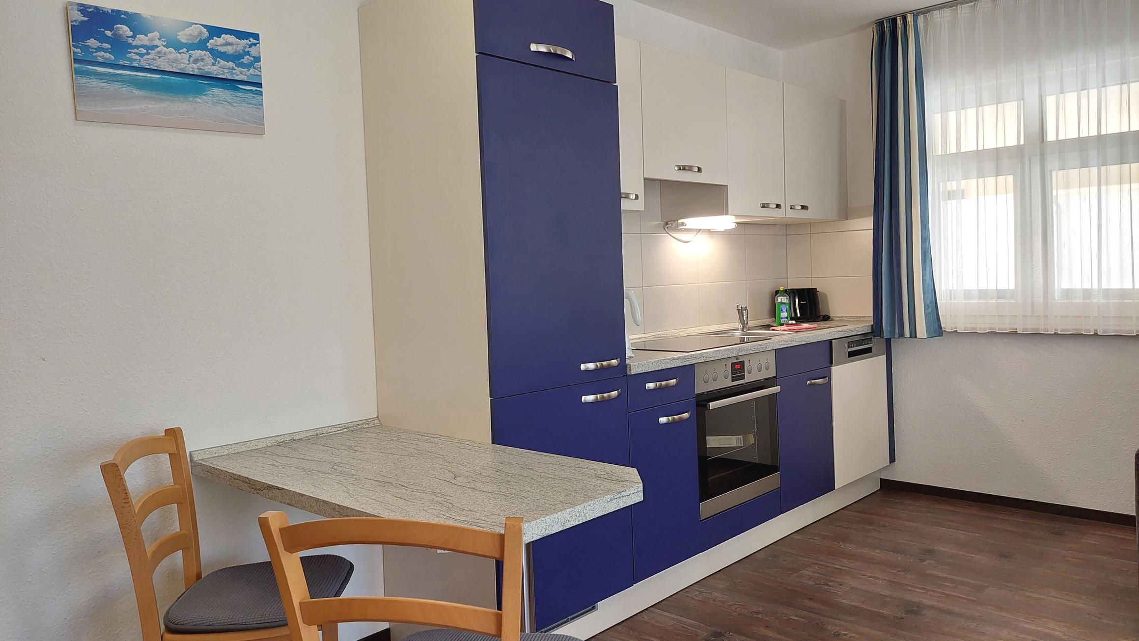 Diese freundliche Wohnung ist aufgeteilt in einen Wohnraum mit Terrasse und integrierter Küchenzeile, ein Schlafzimmer und ein Duschbad mit Waschtisch und WC. Das Wohnzimmer begrüßt Sie mit einem Schlafsofa und Sessel sowie Flachbild-TV. Das geräumige Schlafzimmer verfügt über ein Doppelbett (1,80m x 2m) sowie einen Kleiderschrank. Die Küchenzeile ist mit Backofen, Geschirrspüler, Cerankochfeld, Kühlschrank mit kleinem Gefrierfach, Cerankochfeld, Mikrowelle, Kaffeemaschine, Wasserkocher und Toaster ausgestattet. Highlights: Kostenfreies WLAN sowie ein frei wählbarer PKW-Stellplatz direkt am Haus. Haustiere sind in dieser Wohnung herzlich willkommen.