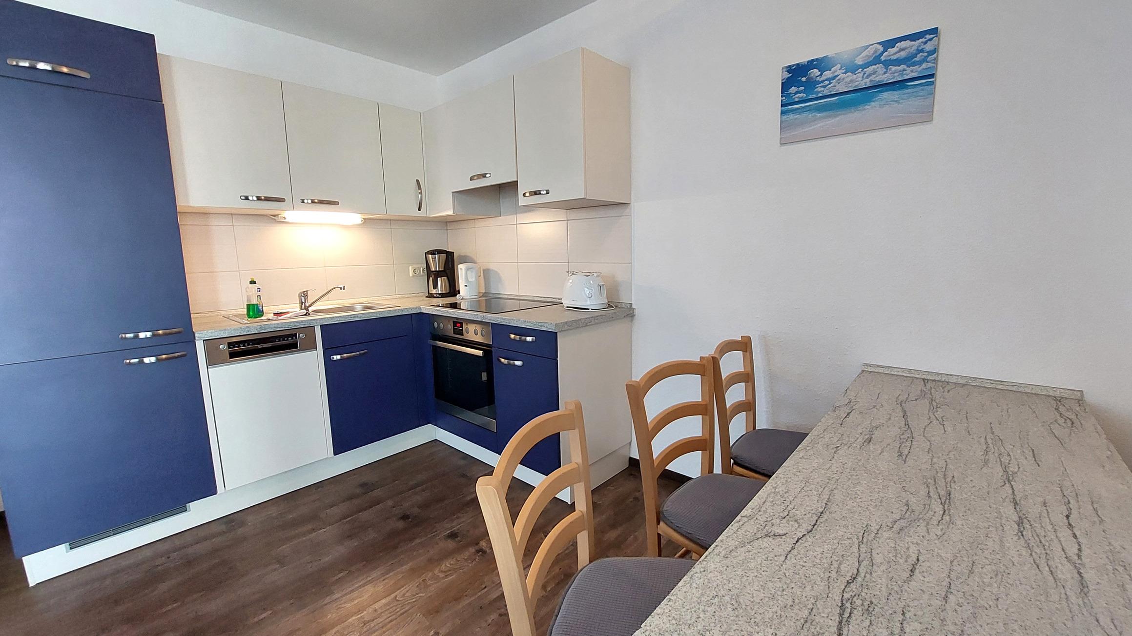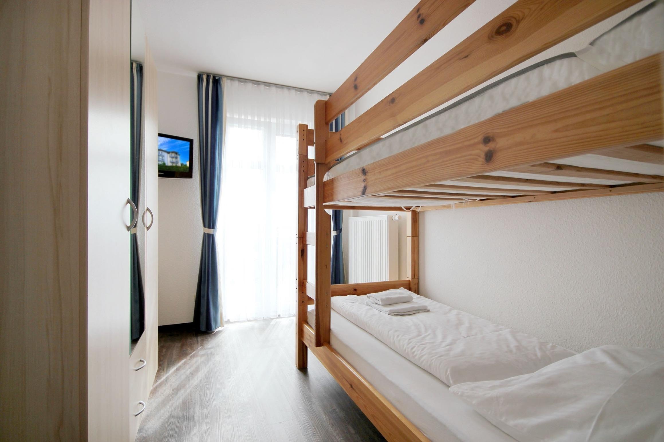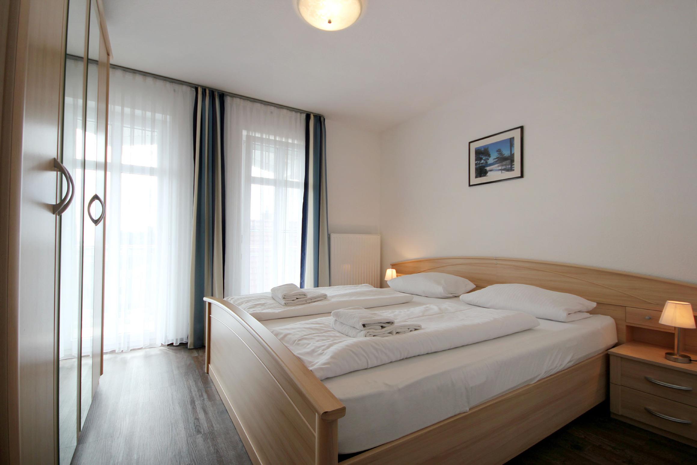 Diese freundliche Wohnung ist aufgeteilt in einen Wohnraum mit Balkon und integrierter Küchenzeile, zwei Schlafzimmer und ein Bad mit Dusche, Waschtisch und WC. Das Wohnzimmer begrüßt Sie mit einem Schlafsofa und Sessel sowie Flachbild-TV. Das Hauptschlafzimmer verfügt über ein Doppelbett (1,80m x 2m) sowie einen Kleiderschrank. Der zweite Schlafraum ebenso mit Balkon begrüßt Sie mit einem Etagenbett, Kleiderschrank und TV. Die Küchenzeile ist mit Backofen, Geschirrspüler, Cerankochfeld, Kühlschrank mit kleinem Gefrierfach, Cerankochfeld, Mikrowelle, Kaffeemaschine, Wasserkocher und Toaster ausgestattet. Highlights: Kostenfreies WLAN sowie ein frei wählbarer PKW-Stellplatz direkt am Haus. Haustiere sind in dieser Wohnung herzlich willkommen.