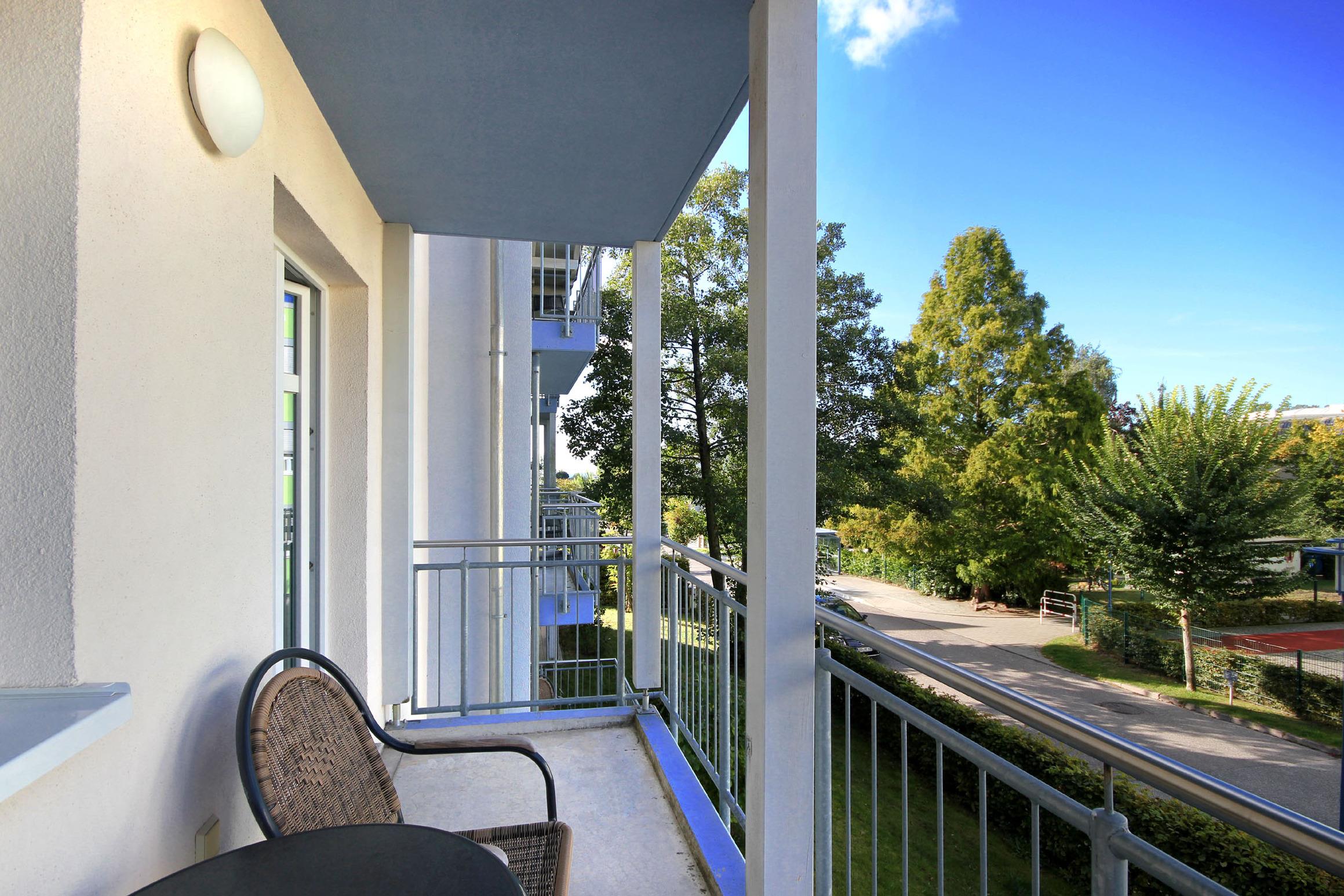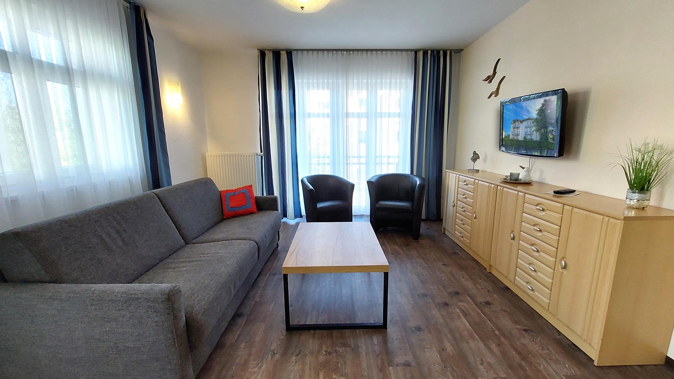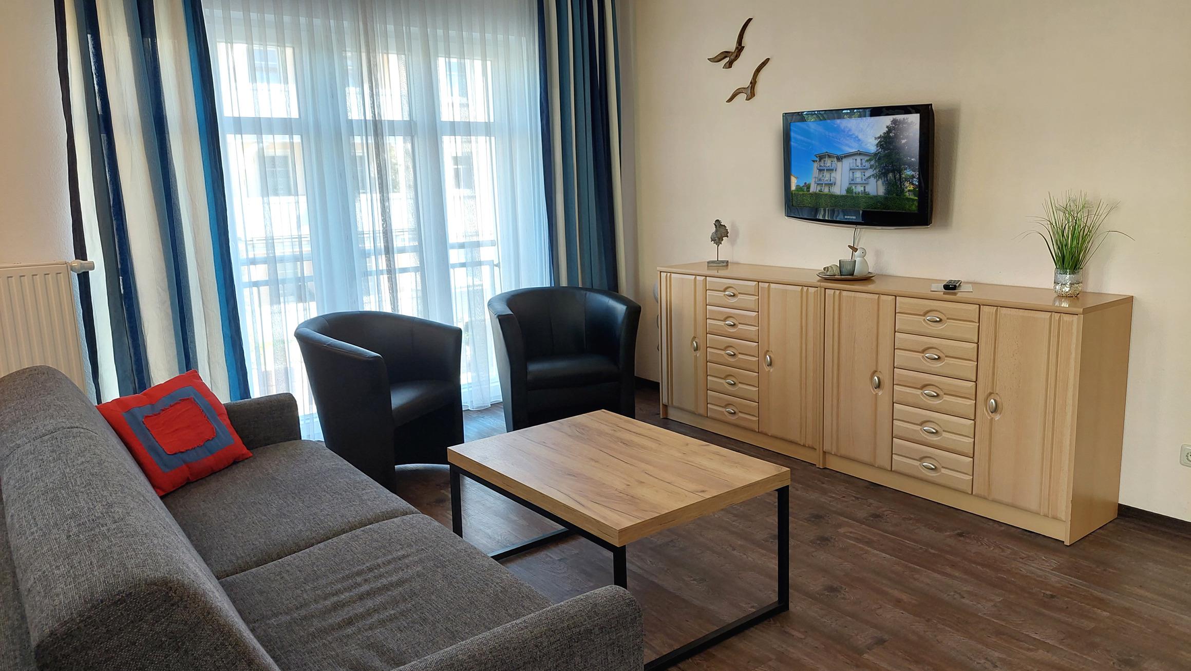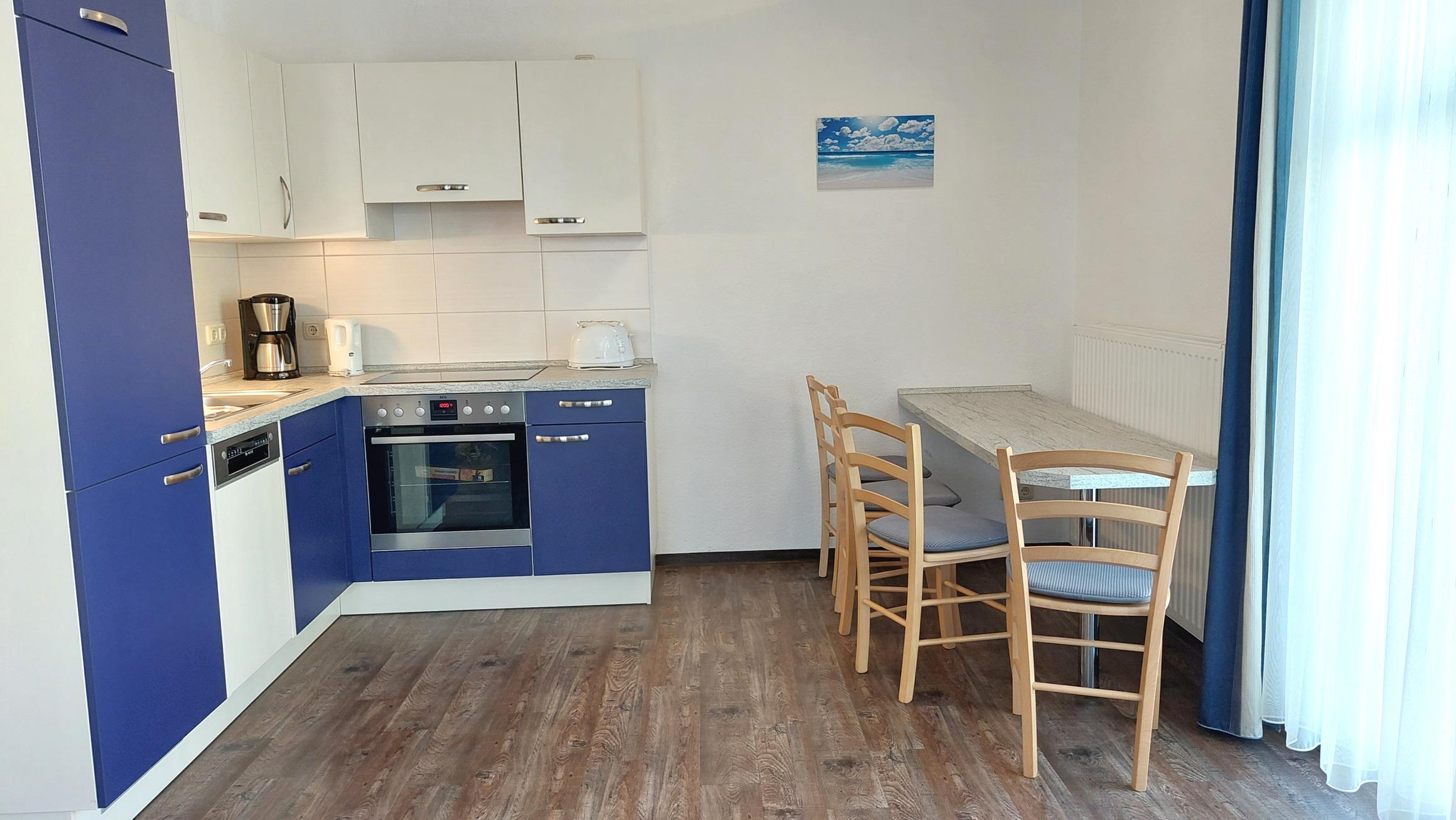 Diese freundliche Wohnung ist aufgeteilt in einen Wohnraum mit Balkon und integrierter Küchenzeile, zwei Schlafzimmer und ein Bad mit Dusche, Waschtisch und WC. Das Wohnzimmer begrüßt Sie mit einem Schlafsofa und Sessel sowie Flachbild-TV. Das Hauptschlafzimmer verfügt über ein Doppelbett (1,80m x 2m) sowie einen Kleiderschrank. Der zweite Schlafraum ebenso mit Balkon begrüßt Sie mit einem Etagenbett, Kleiderschrank und TV. Die Küchenzeile ist mit Backofen, Geschirrspüler, Cerankochfeld, Kühlschrank mit kleinem Gefrierfach, Cerankochfeld, Mikrowelle, Kaffeemaschine, Wasserkocher und Toaster ausgestattet. Highlights: Kostenfreies WLAN sowie ein frei wählbarer PKW-Stellplatz direkt am Haus. Haustiere sind in dieser Wohnung herzlich willkommen.